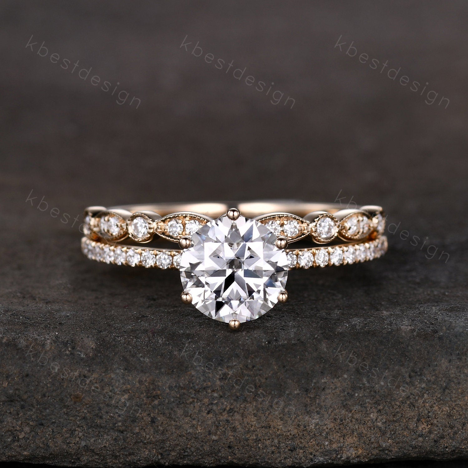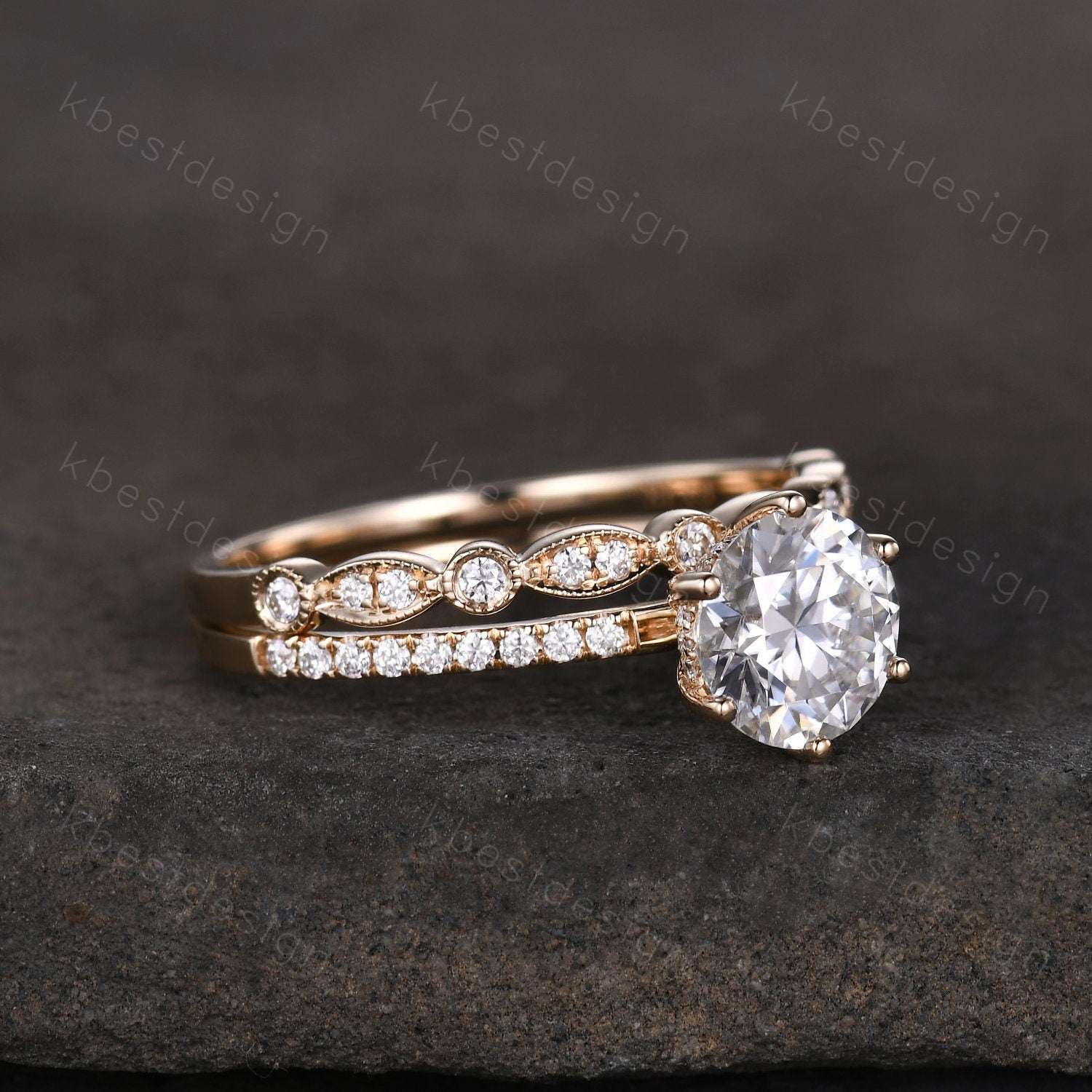 1.2ct round cut Moissanite engagement ring 14k yellow gold solitaire engagement ring art deco stacking matching band unique wedding ring set