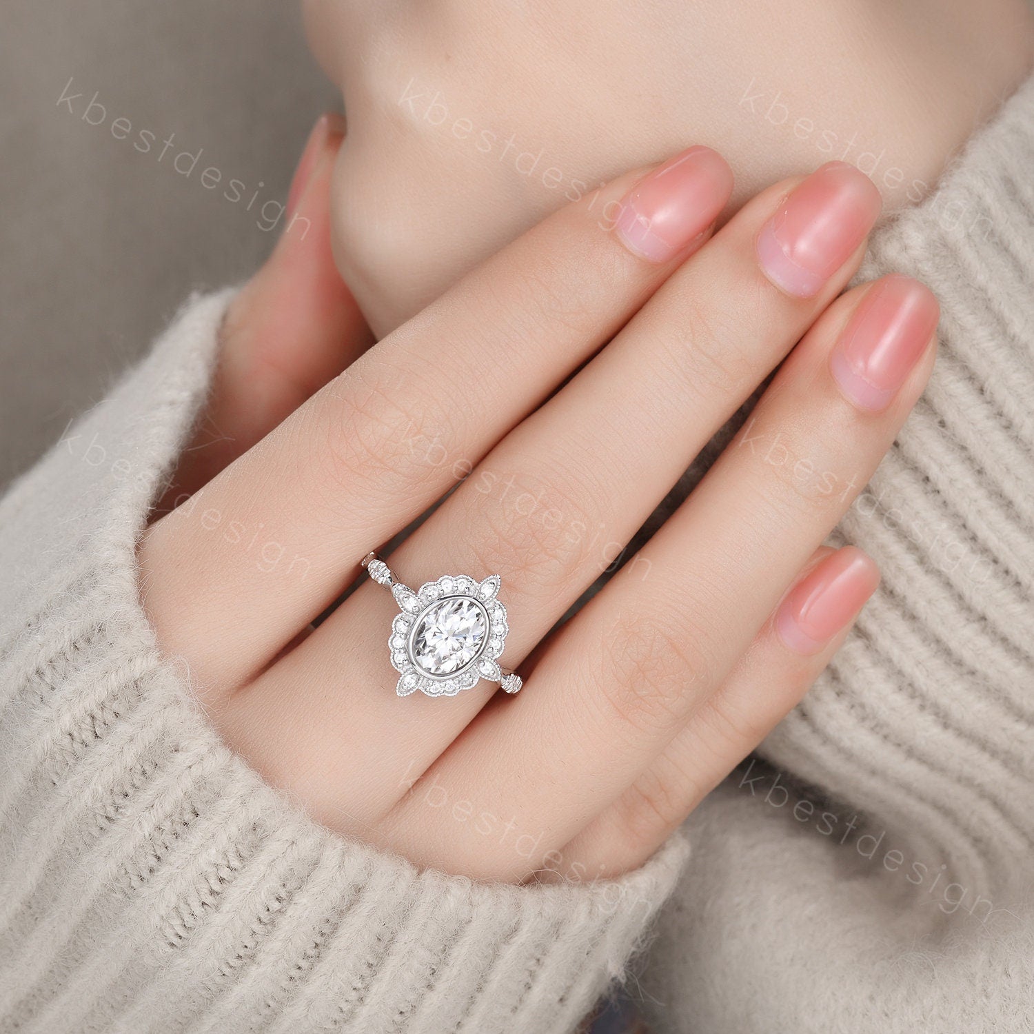 1.5CT Oval Moissanite engagement ring vintage unique halo white gold engagement women art deco wedding Bridal Ring Promise Anniversary ring