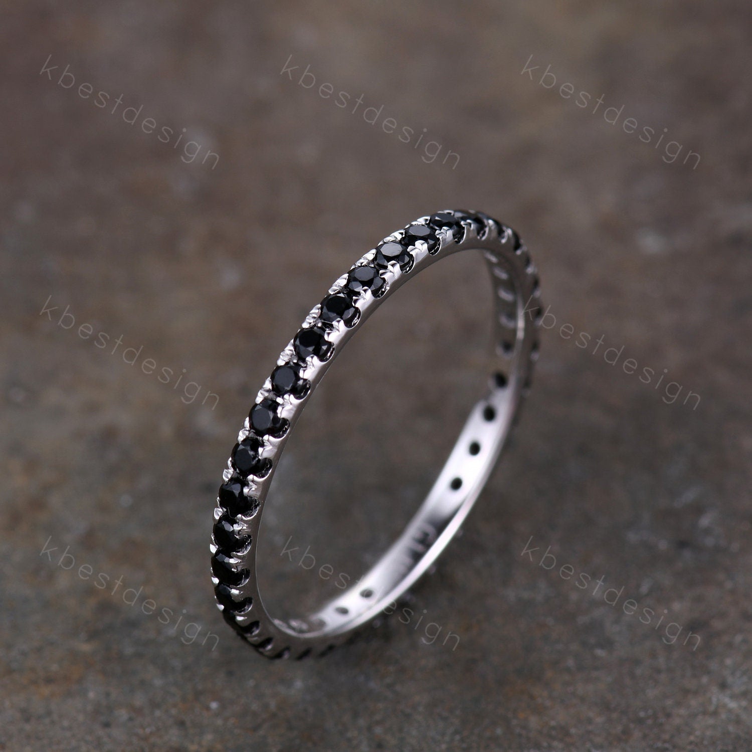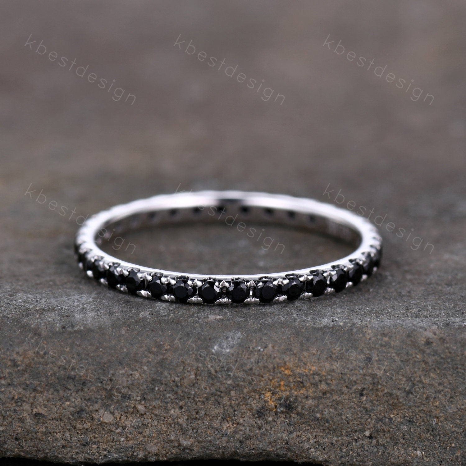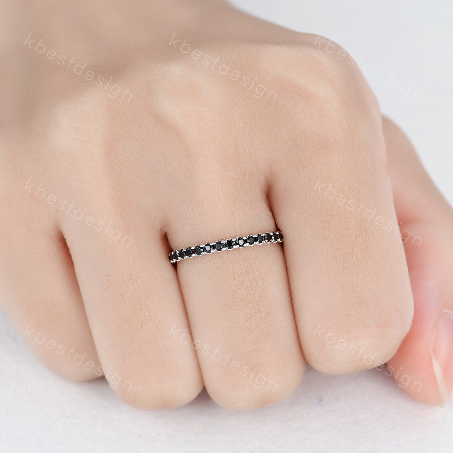 This is 1.5mm Eternity Black Spinel Wedding Band Minimalist Pave Wedding Band White Gold Black Gemstone Stacking Band Anniversary Ring for Her.