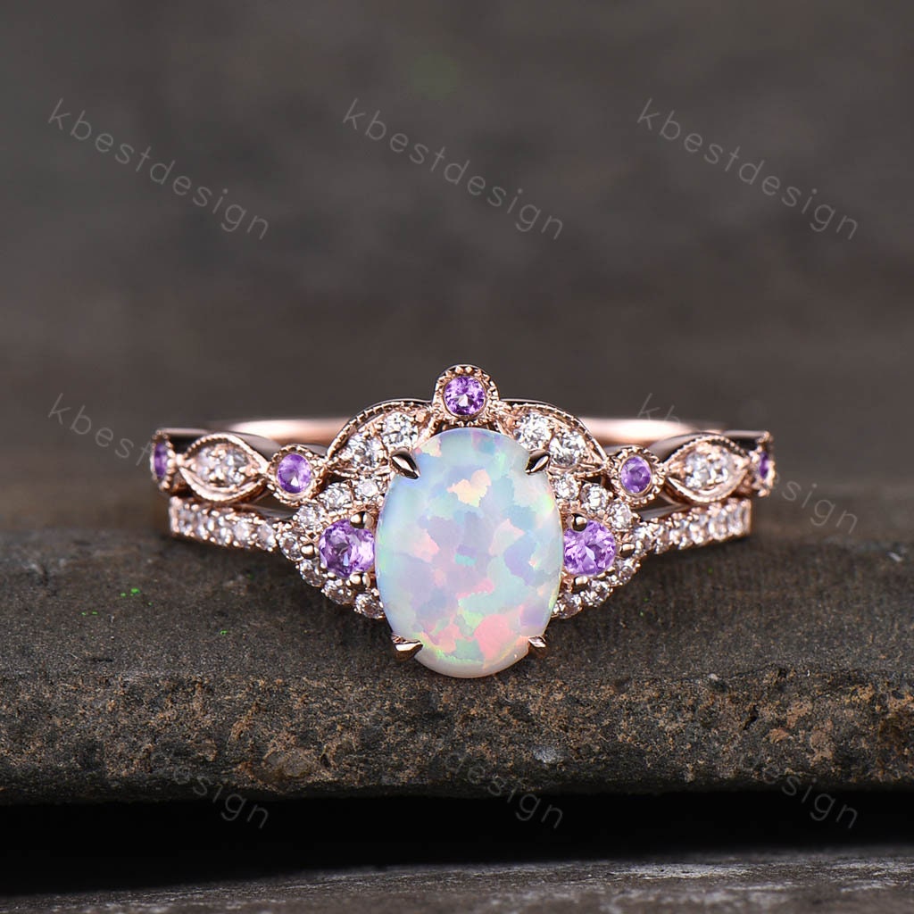 14K Rose Gold Opal Engagement Ring Set Vintage Oval Opal Amethyst Bridal Set Unique Curved Moissanite Wedding Ring Anniversary Promise Gift