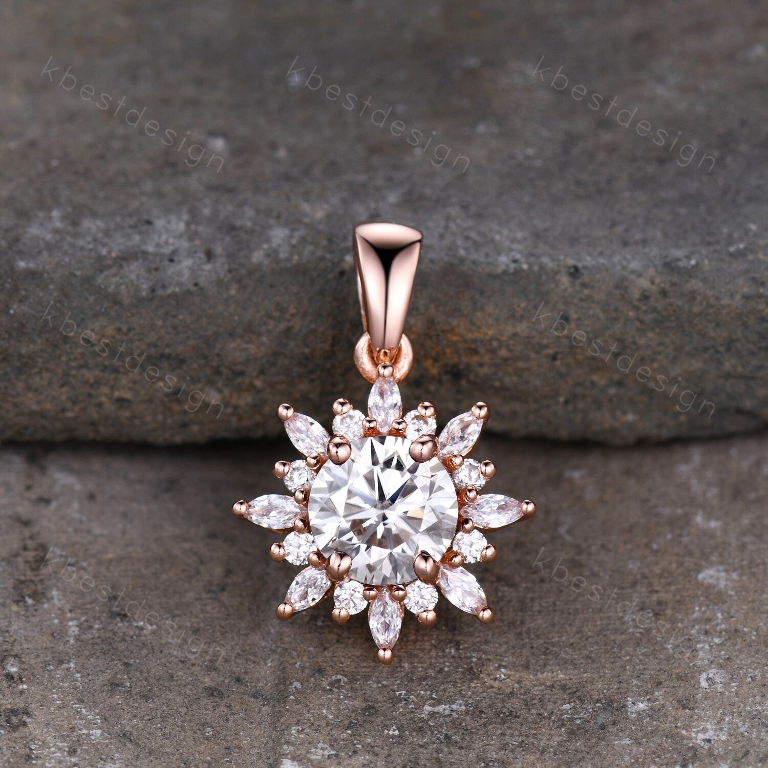 1CT Round Moissanite Pendant Necklace, Vintage Necklace For Women, Art Deco Floral Gold Pendant, Moissanite Necklace Anniversary/Bridal Gift