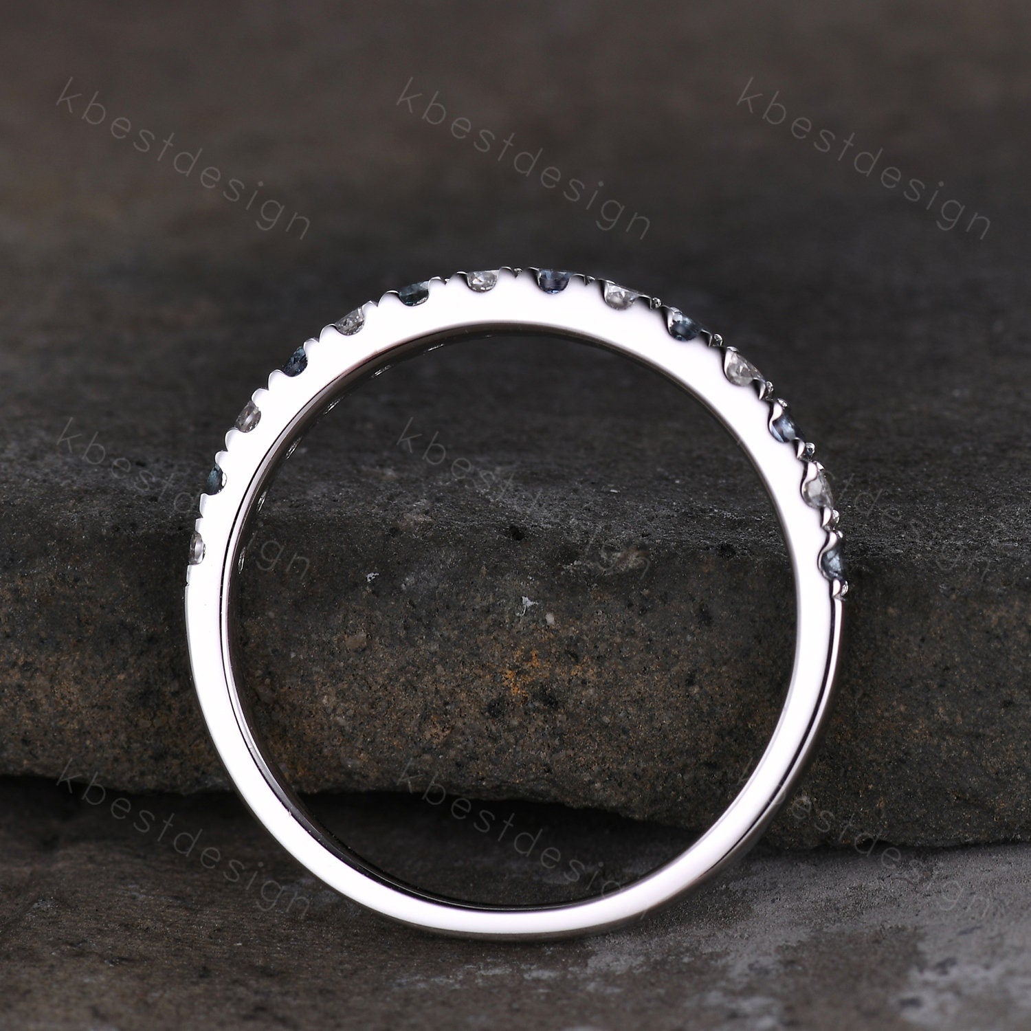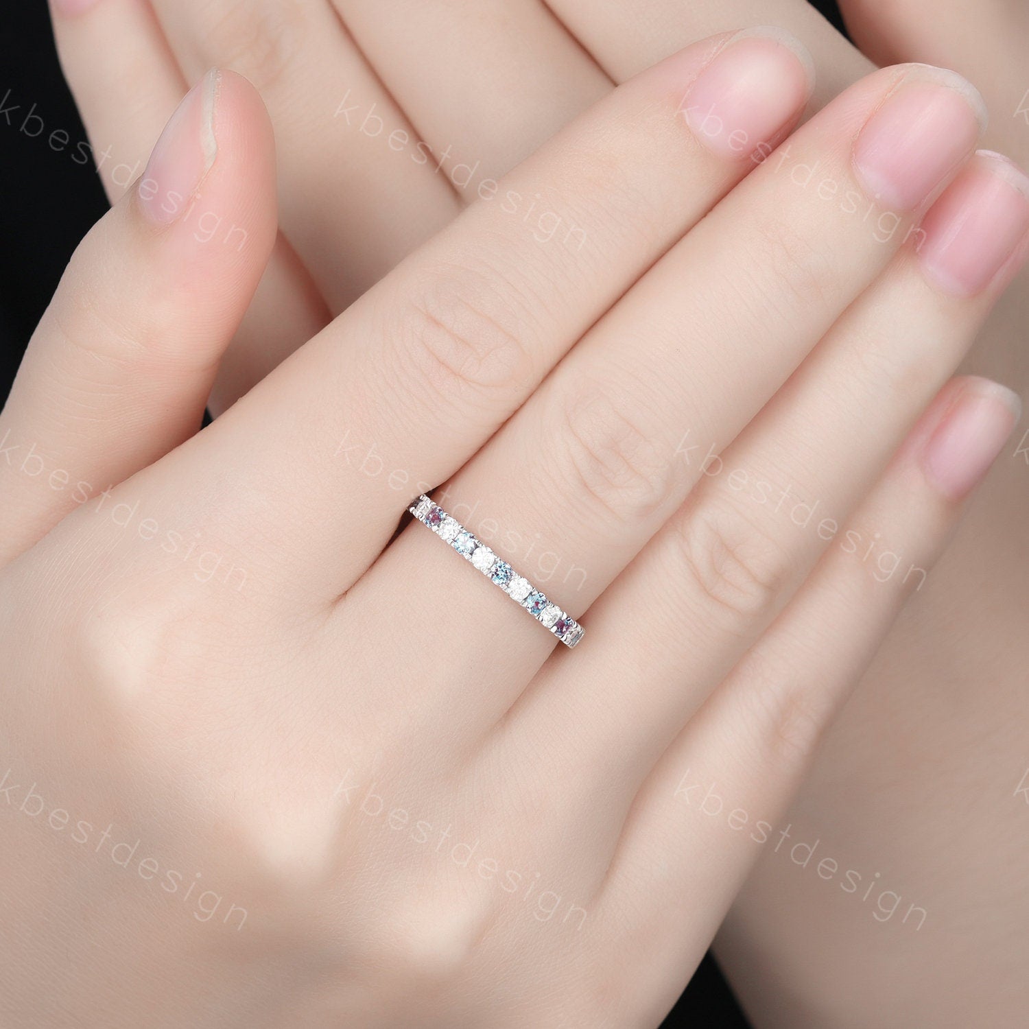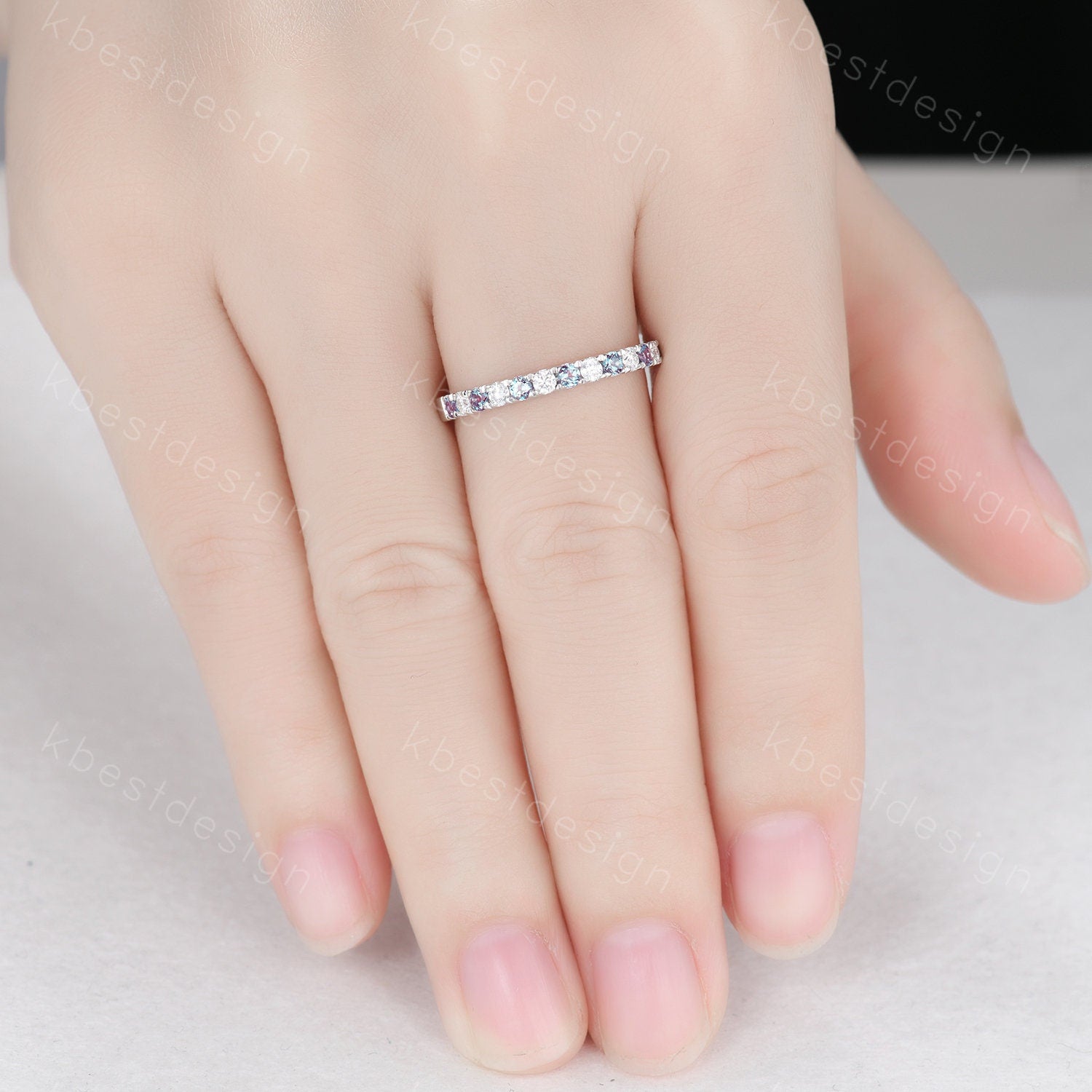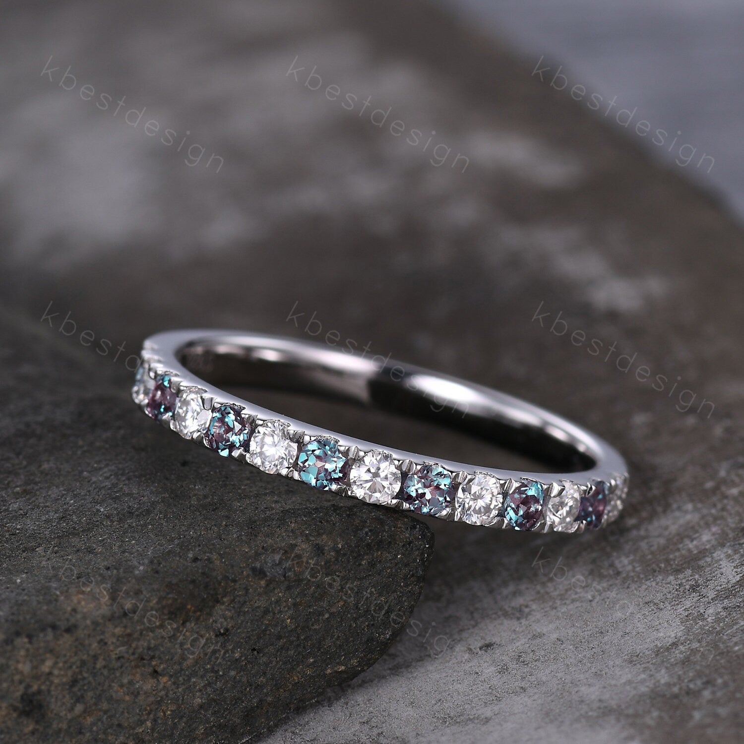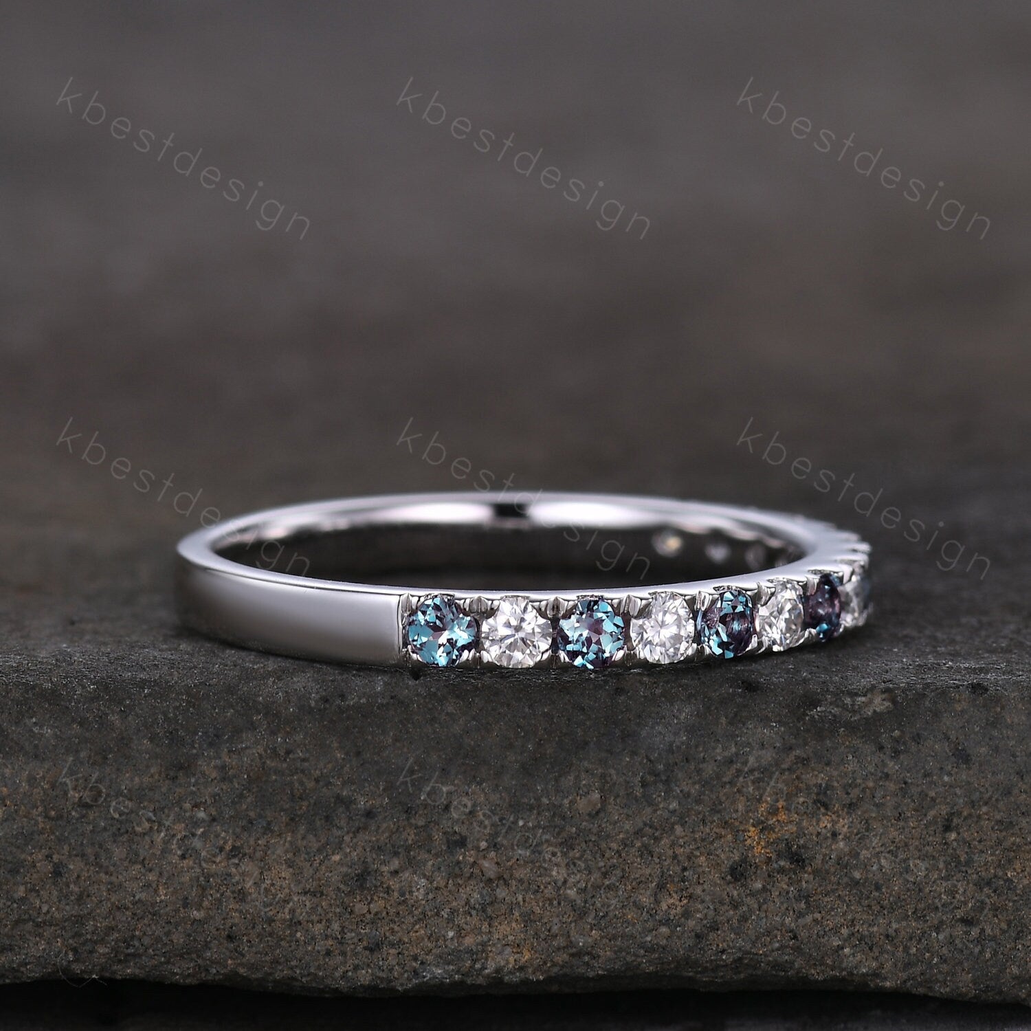 2mm Moissanite Alexandrite Wedding Band Half Eternity Stacking Band Colorless Moissanite Ring Women Matching Band Promise Anniversary Ring