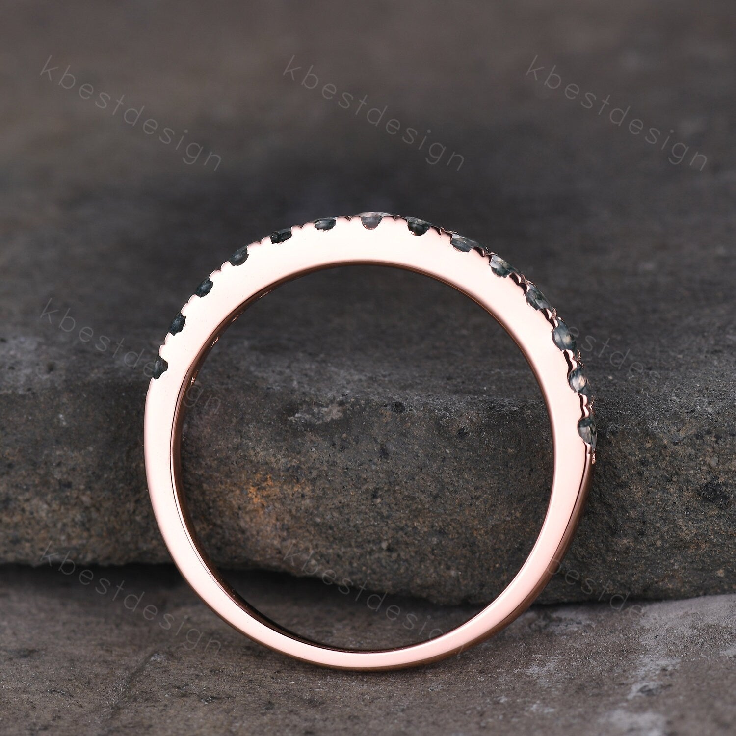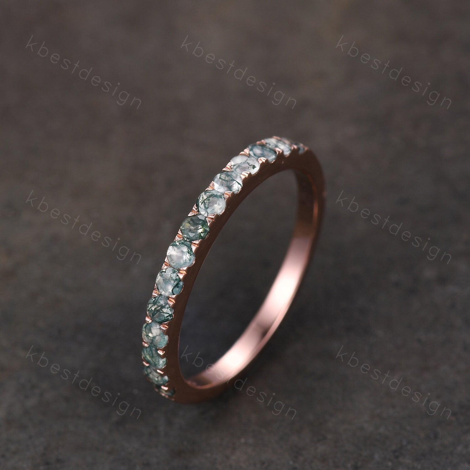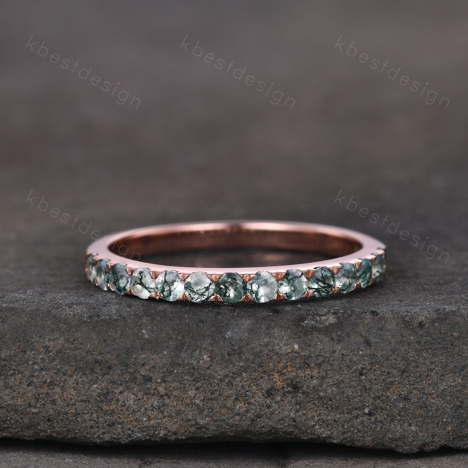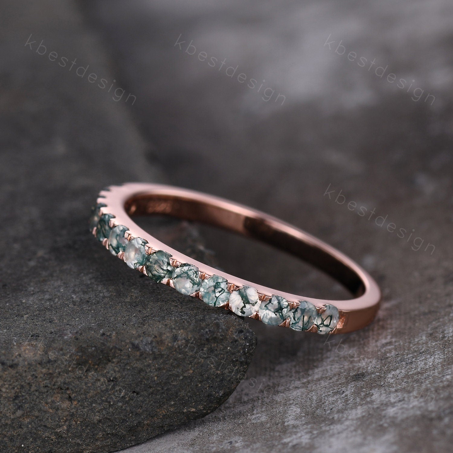 2MM Round cut Moss Agate Wedding Band Rose Gold Half Eternity Wedding Band Natural Moss Agate Stacking Band Minimalist Bridal Promise Gift