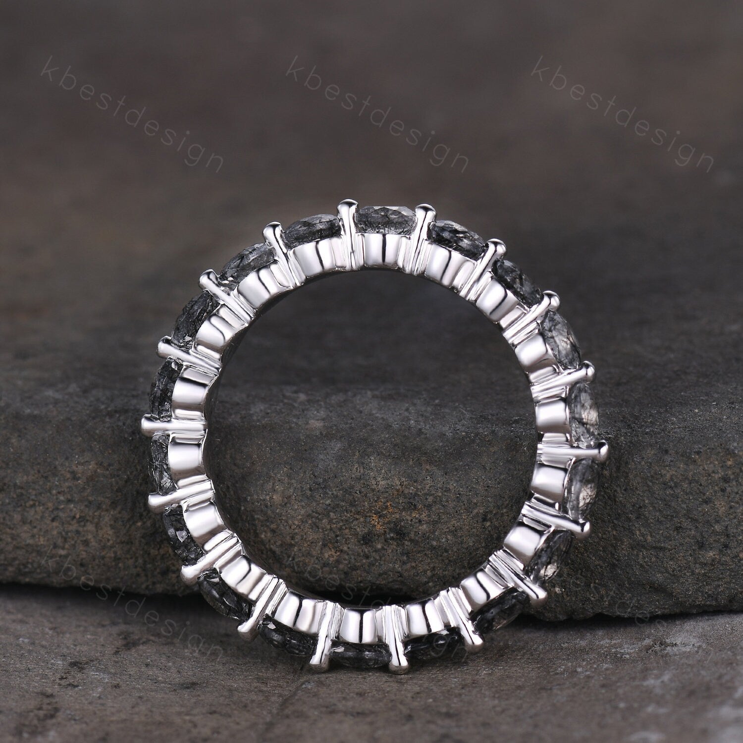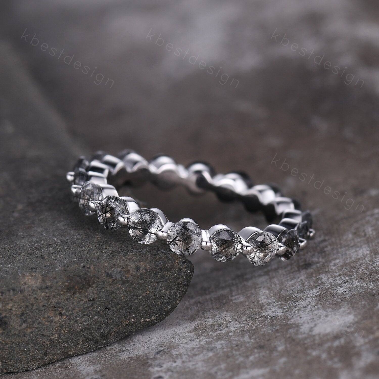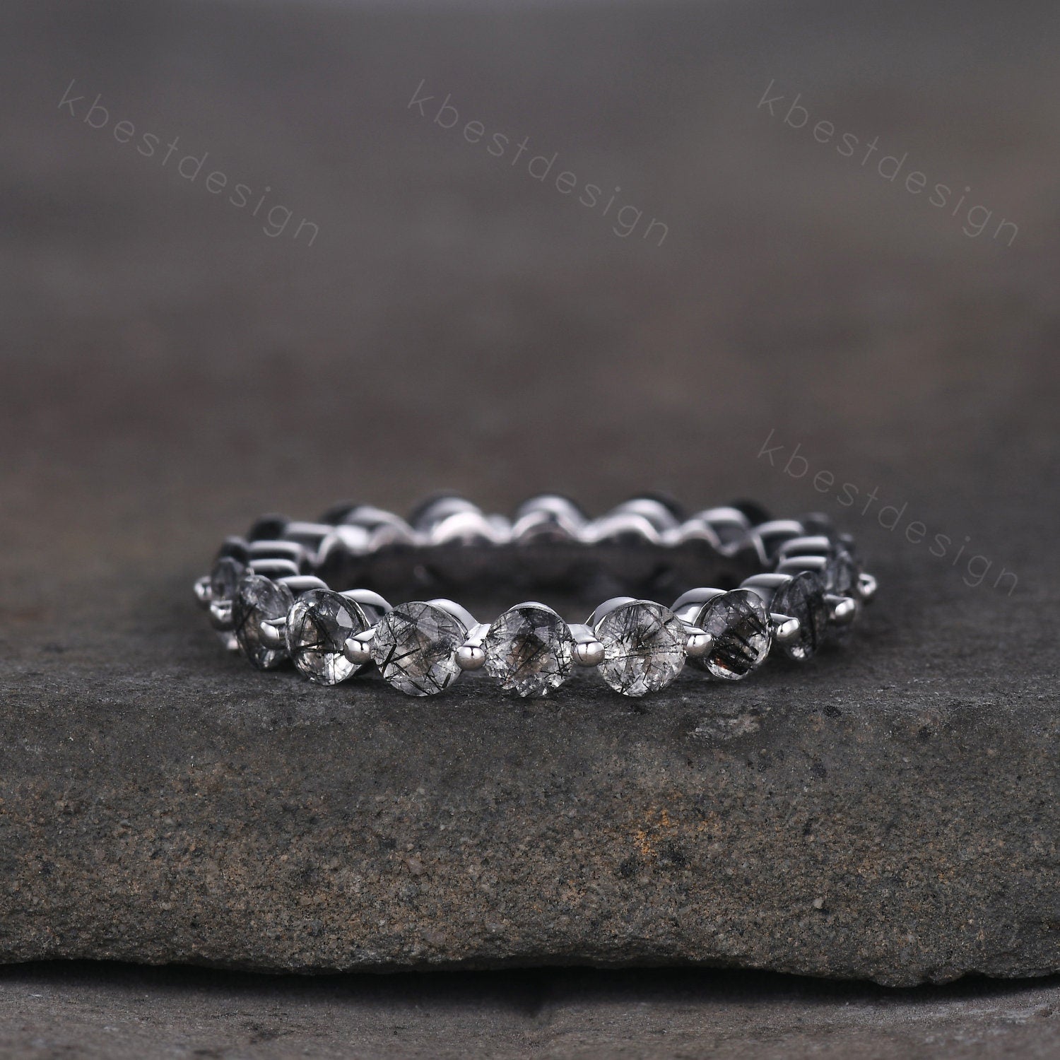 3MM Round Cut Natural Black Rutilated Quartz Wedding Ring Unique Black Gemstone Eternity Band Sterling Silver Ring Promise Ring Antique Ring