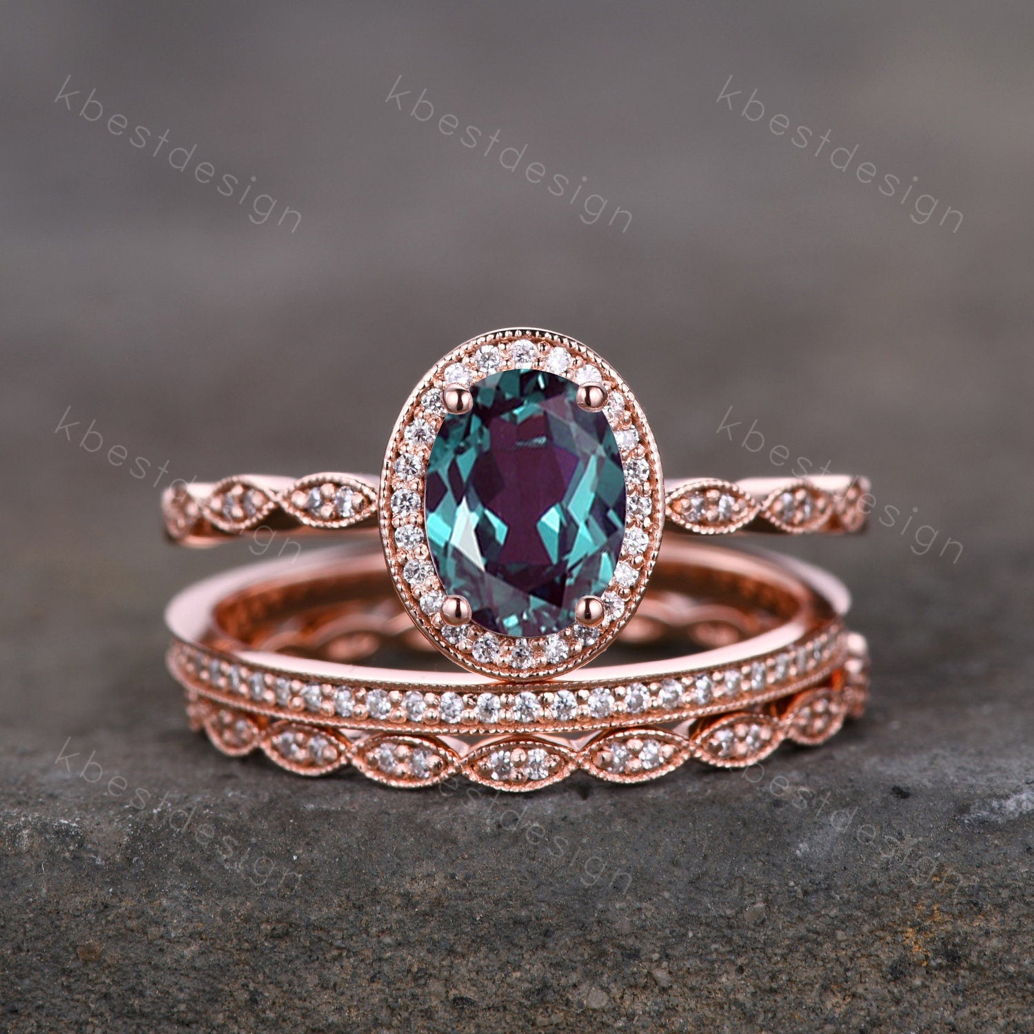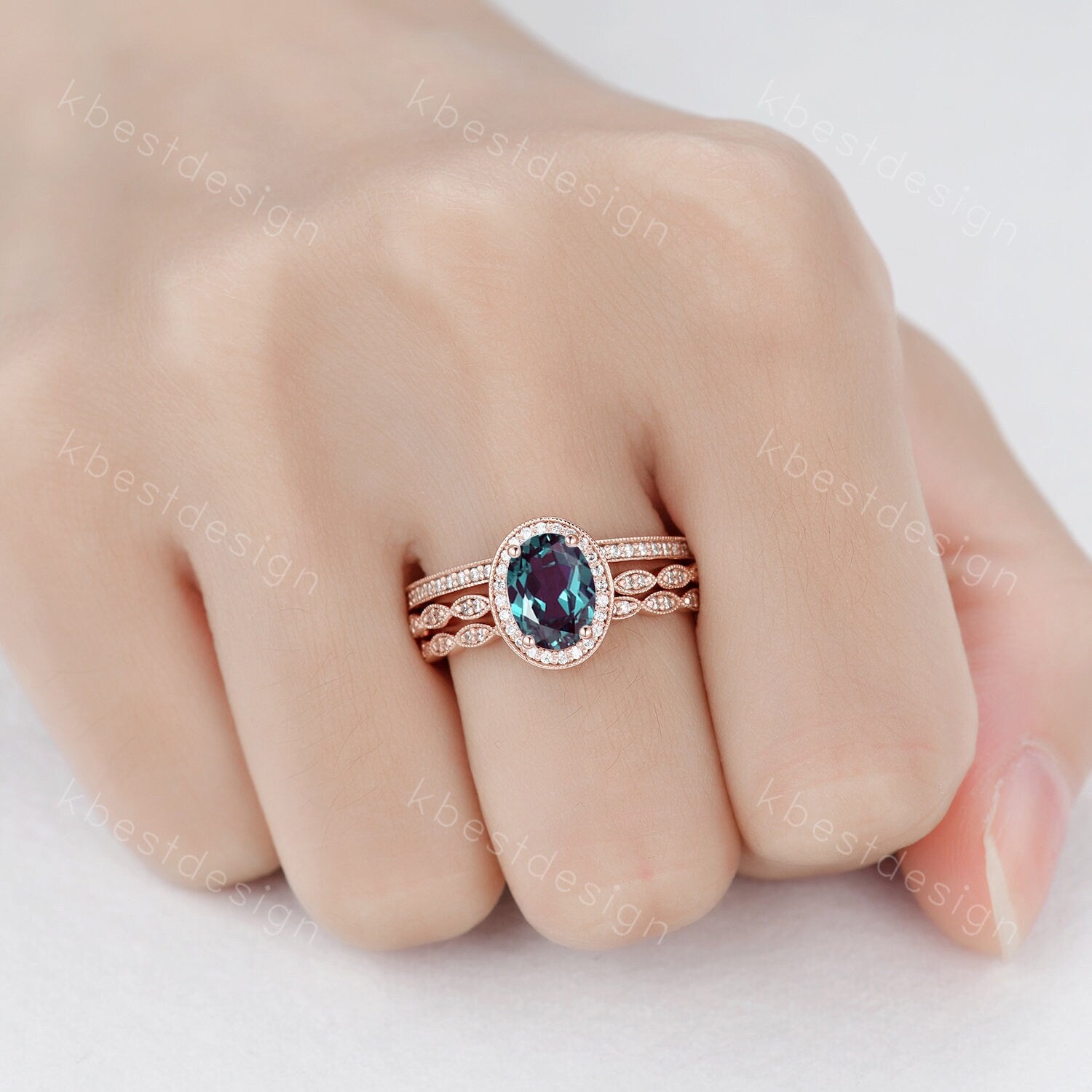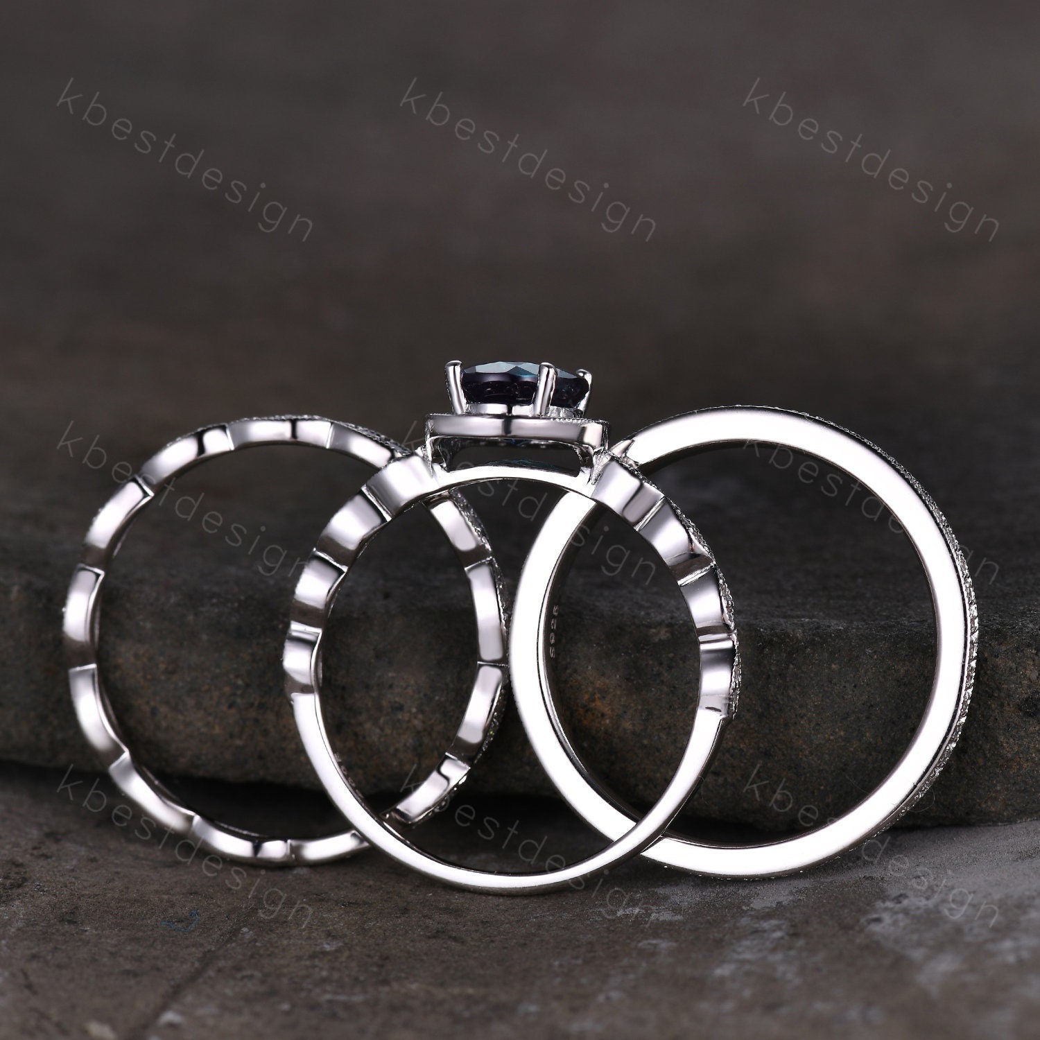 3pcs Alexandrite bridal set oval cut Alexandrite engagement ring set sterling silver vintage moissanite ring unique art deco stacking bands