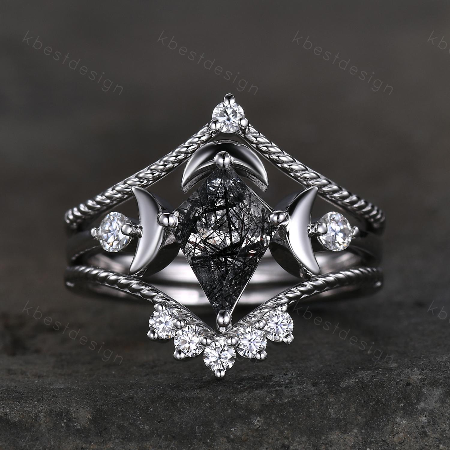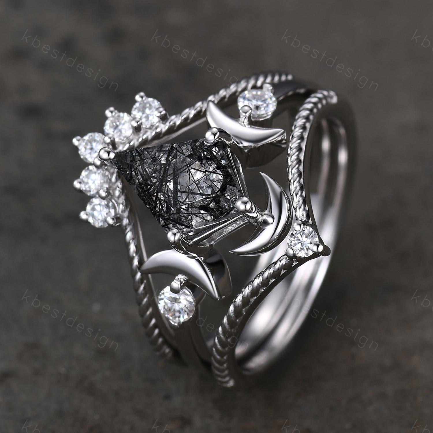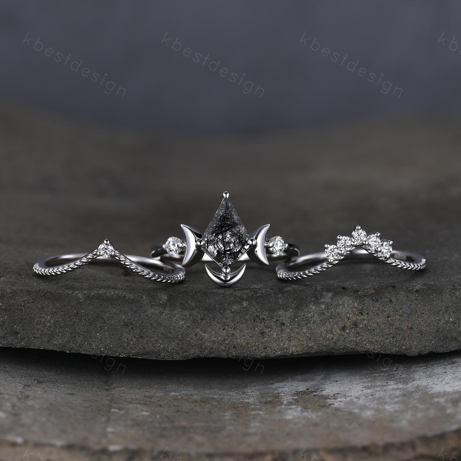 This is a beautiful 3PCS black rutilated quartz engagement ring set unique moon goddess ring art deco curved mopissanite stacking bridal promise wedding set