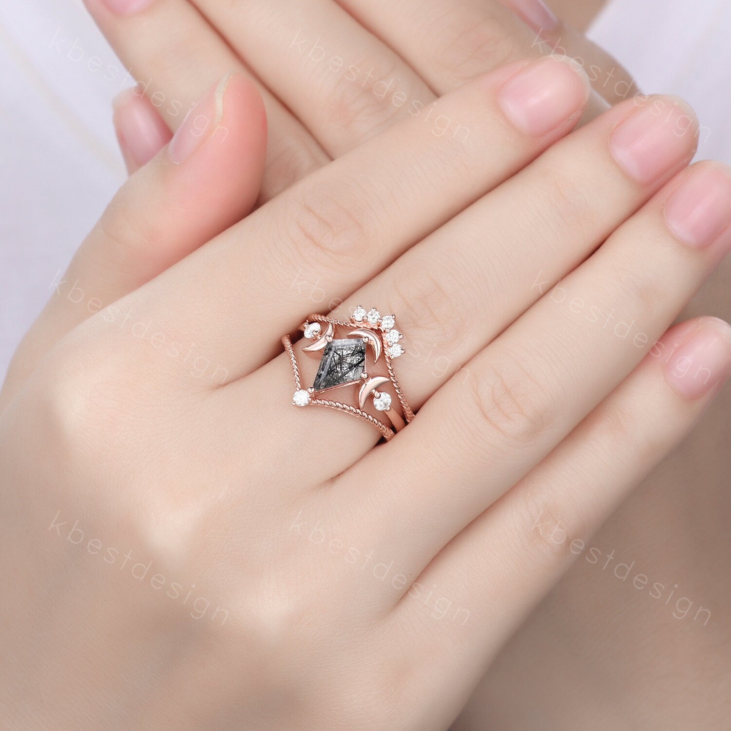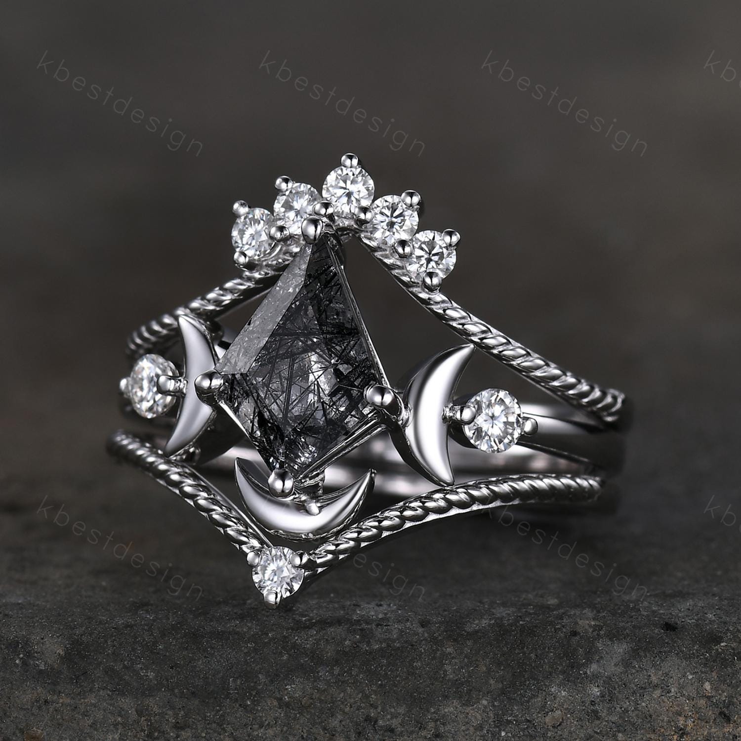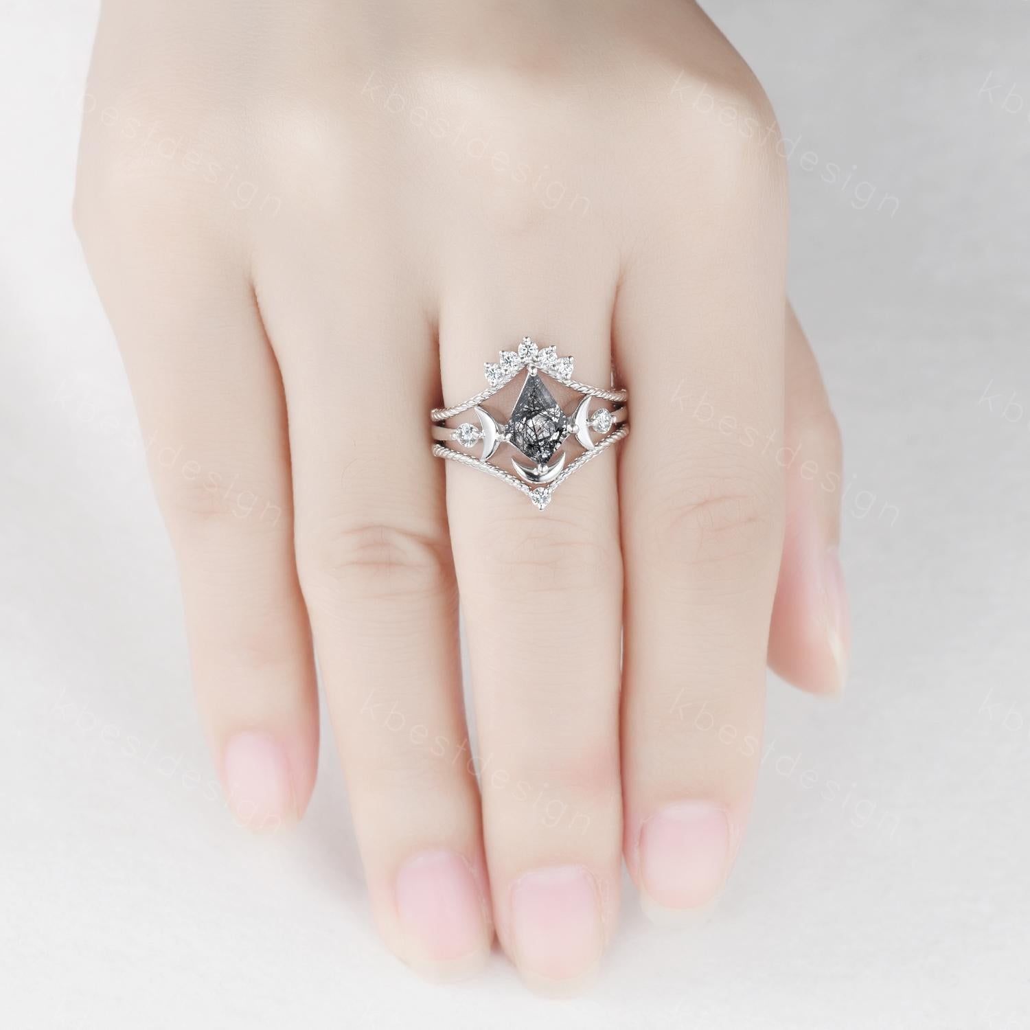 This is a beautiful 3PCS black rutilated quartz engagement ring set unique moon goddess ring art deco curved mopissanite stacking bridal promise wedding set