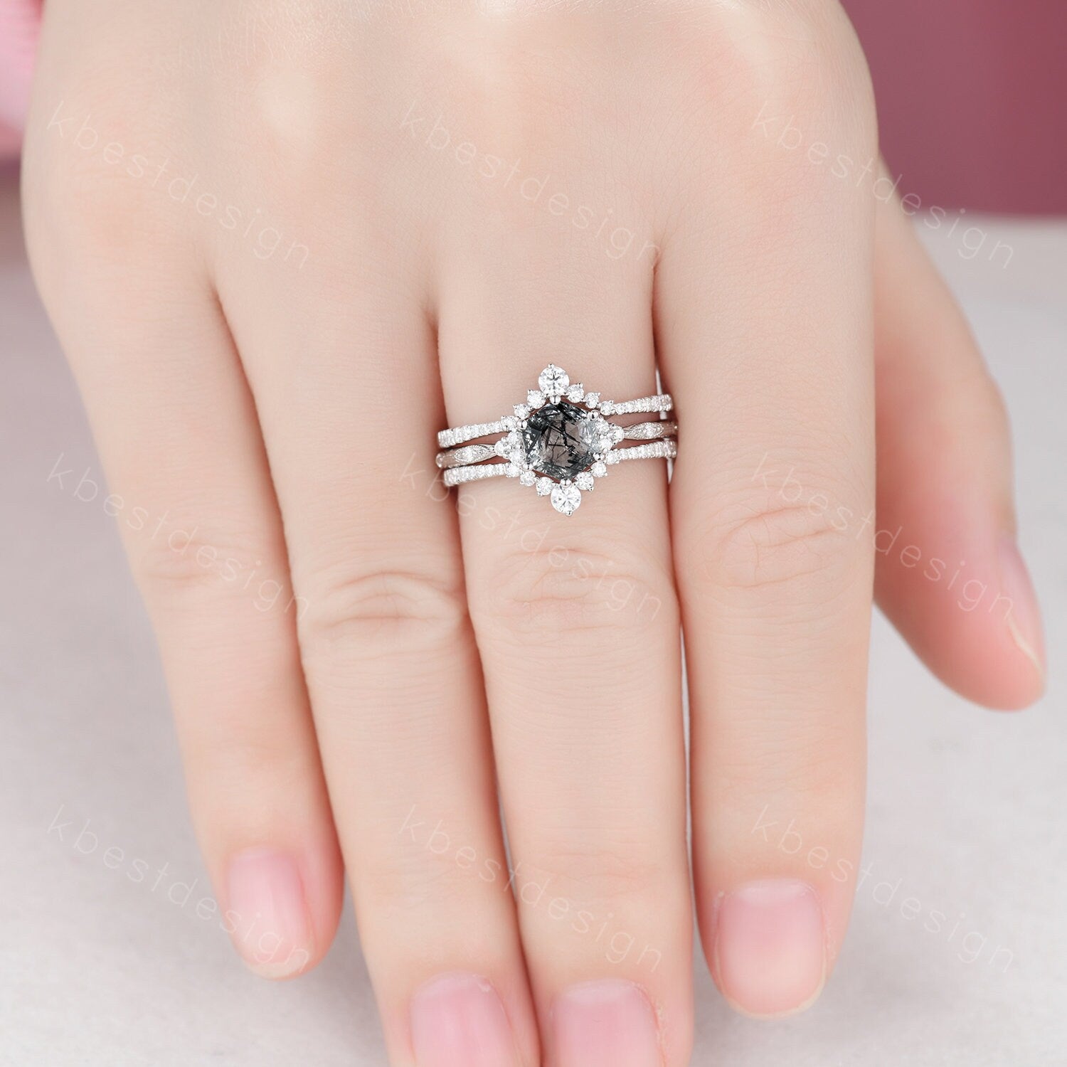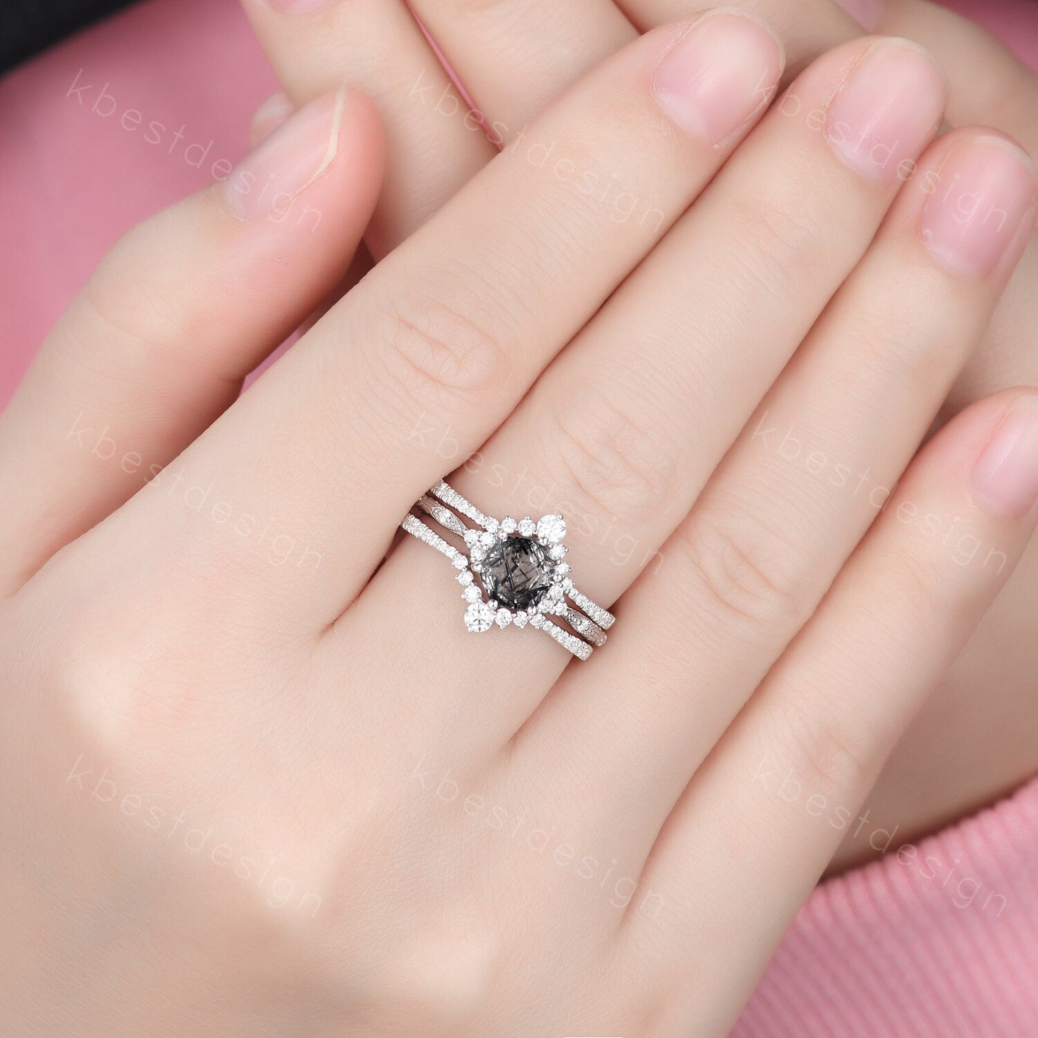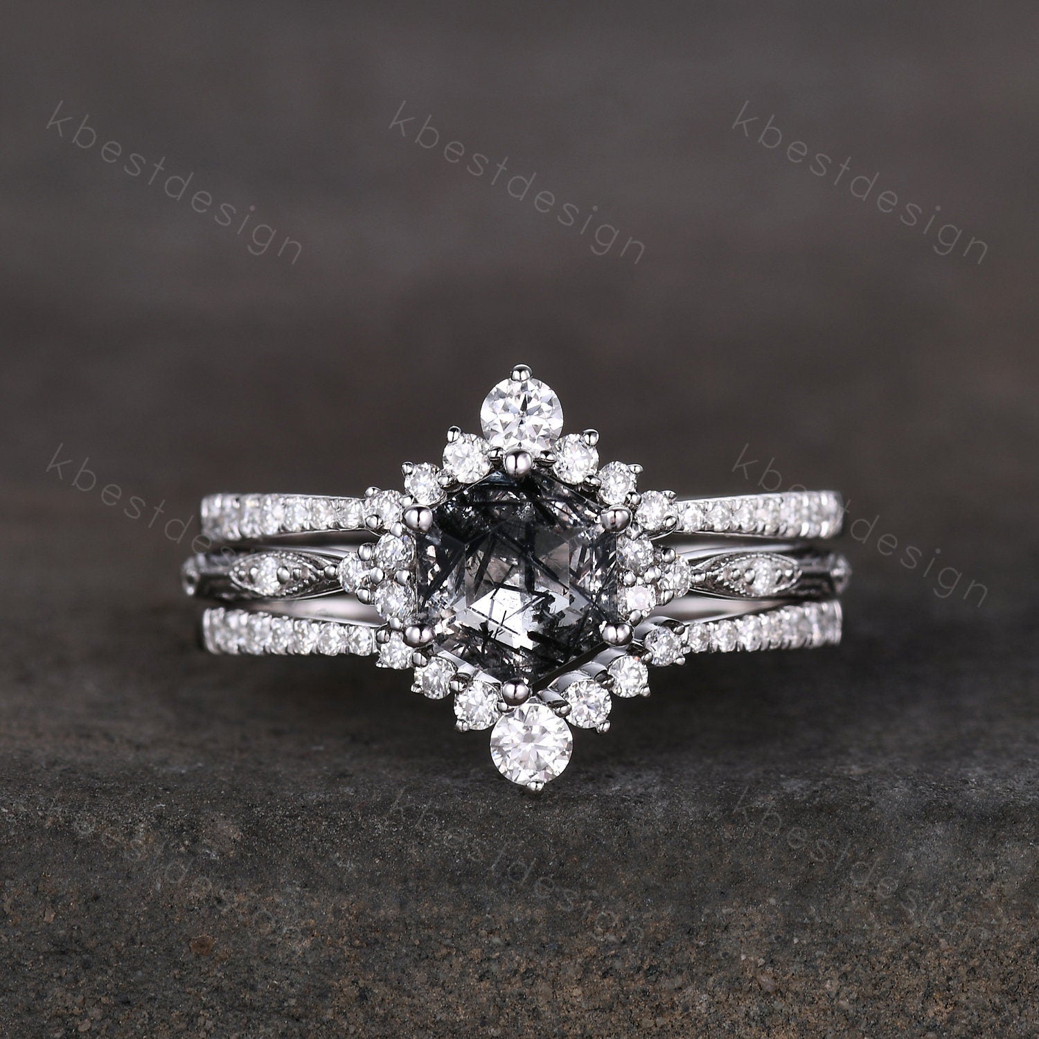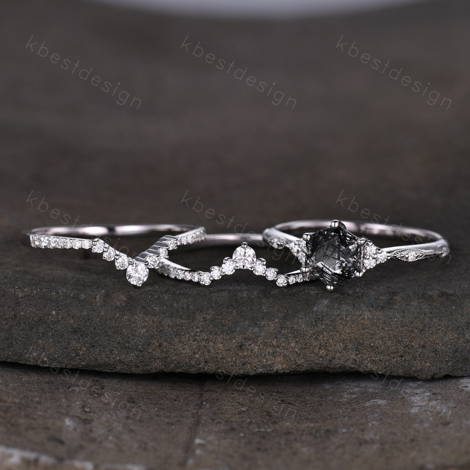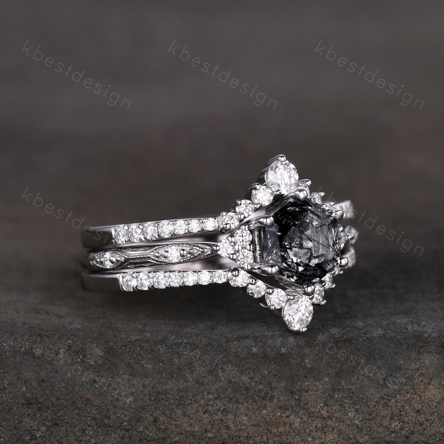 3pcs hexagon cut black rutilated quartz engagement ring silver art deco moissanite ring women stacking matching band unique wedding ring set