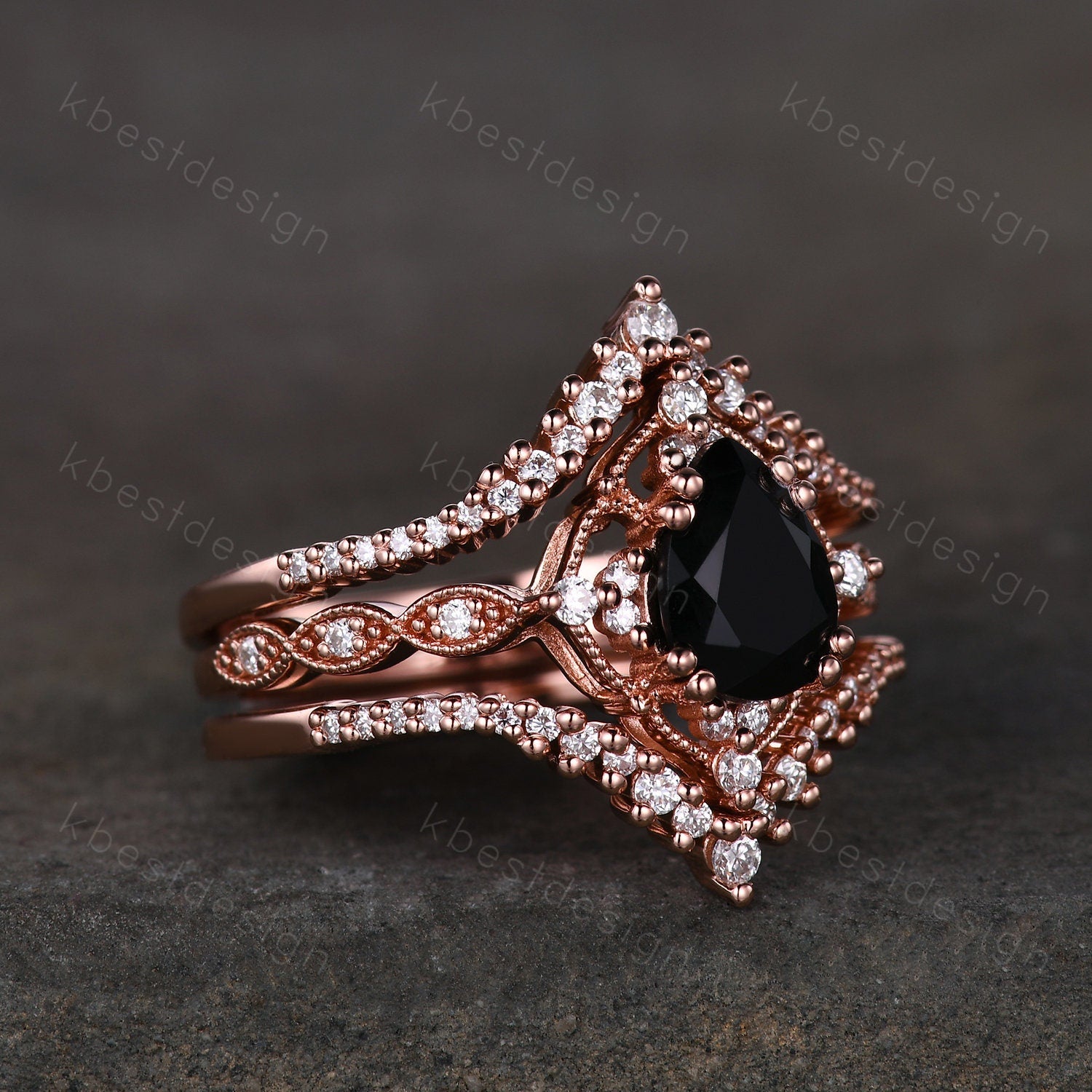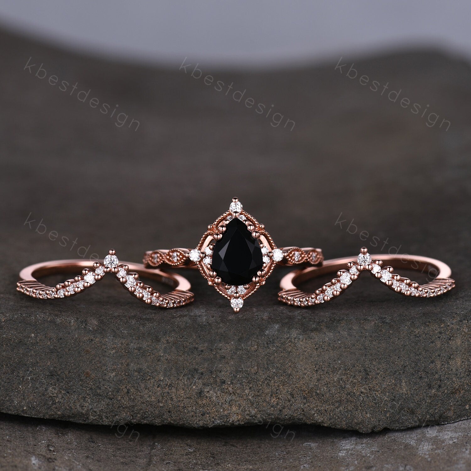 3PCS Vintage black onyx engagement ring rose gold ring art deco curved stacking band pear shaped bridal set unique moissanite wedding set