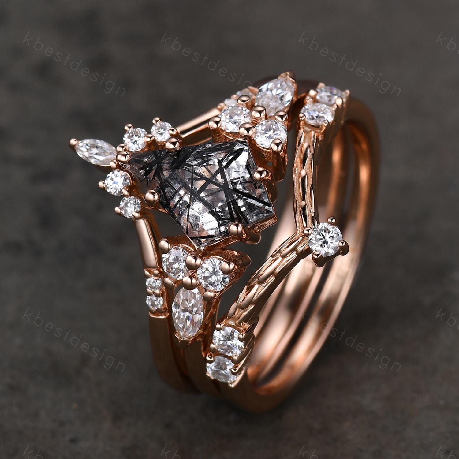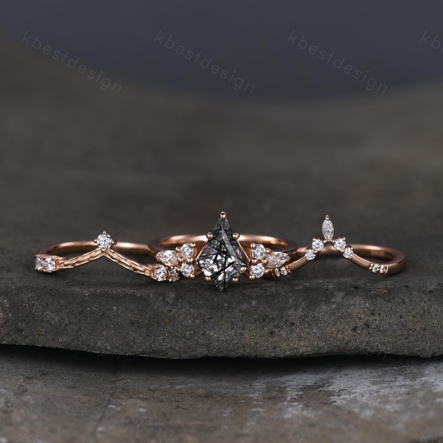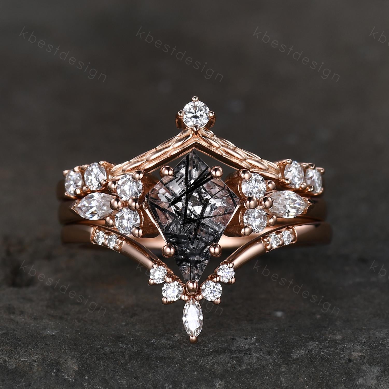 3PCS Vintage black rutilated quartz engagement ring rose gold ring art deco curved bands kite cut bridal set unique moissanite wedding set