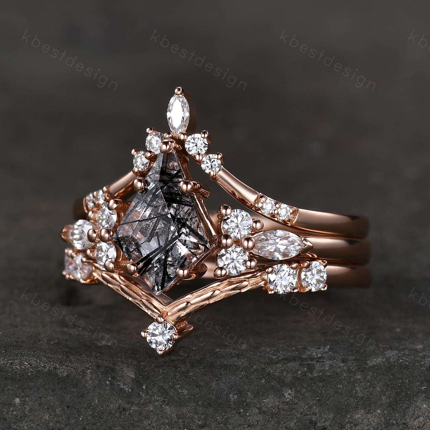 This is a beautiful 3PCS Vintage black rutilated quartz engagement ring rose gold ring art deco curved bands kite cut bridal set unique moissanite wedding set