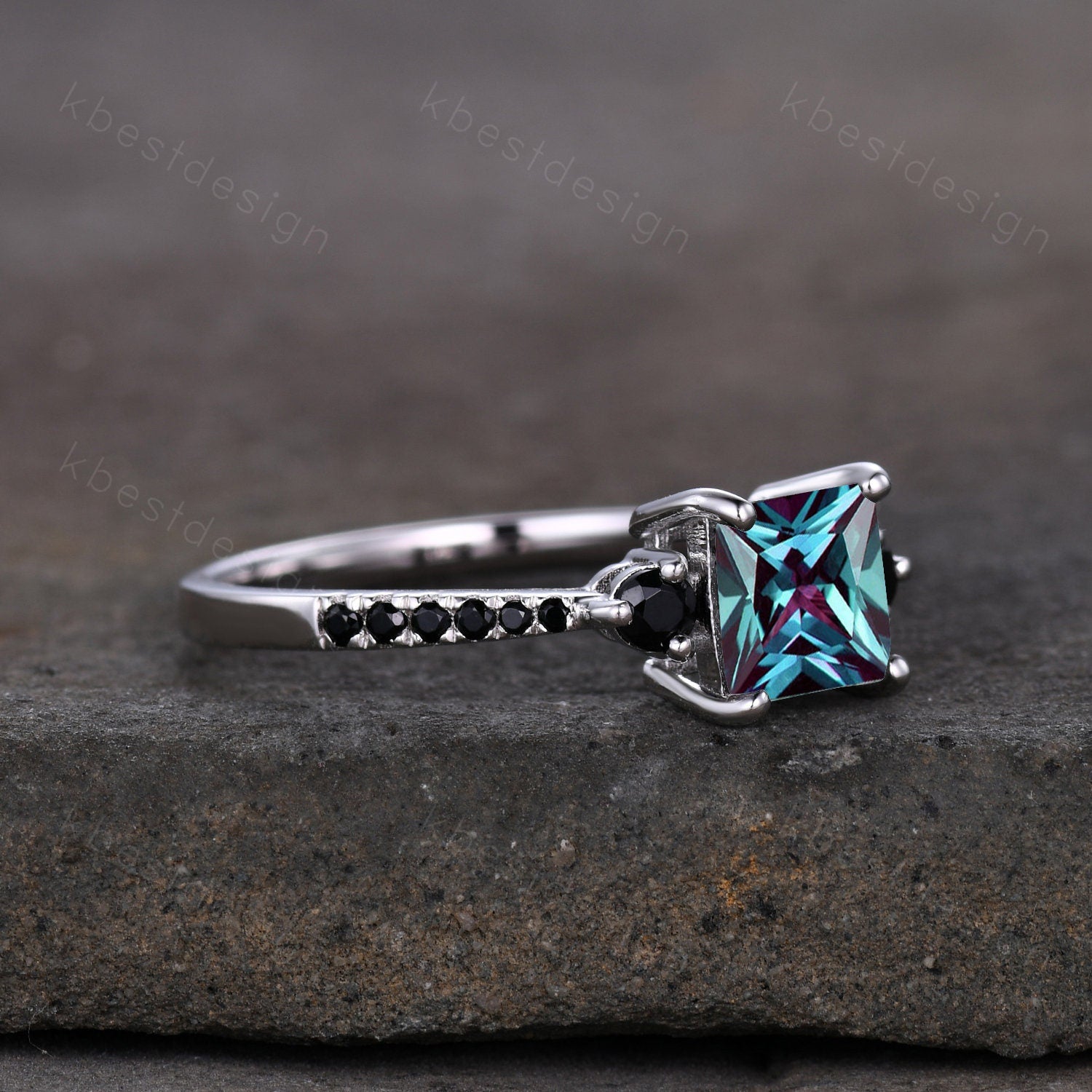 This is a unique princess cut lab created Alexandrite and black spinel engagement ring in 925 sterling silver.