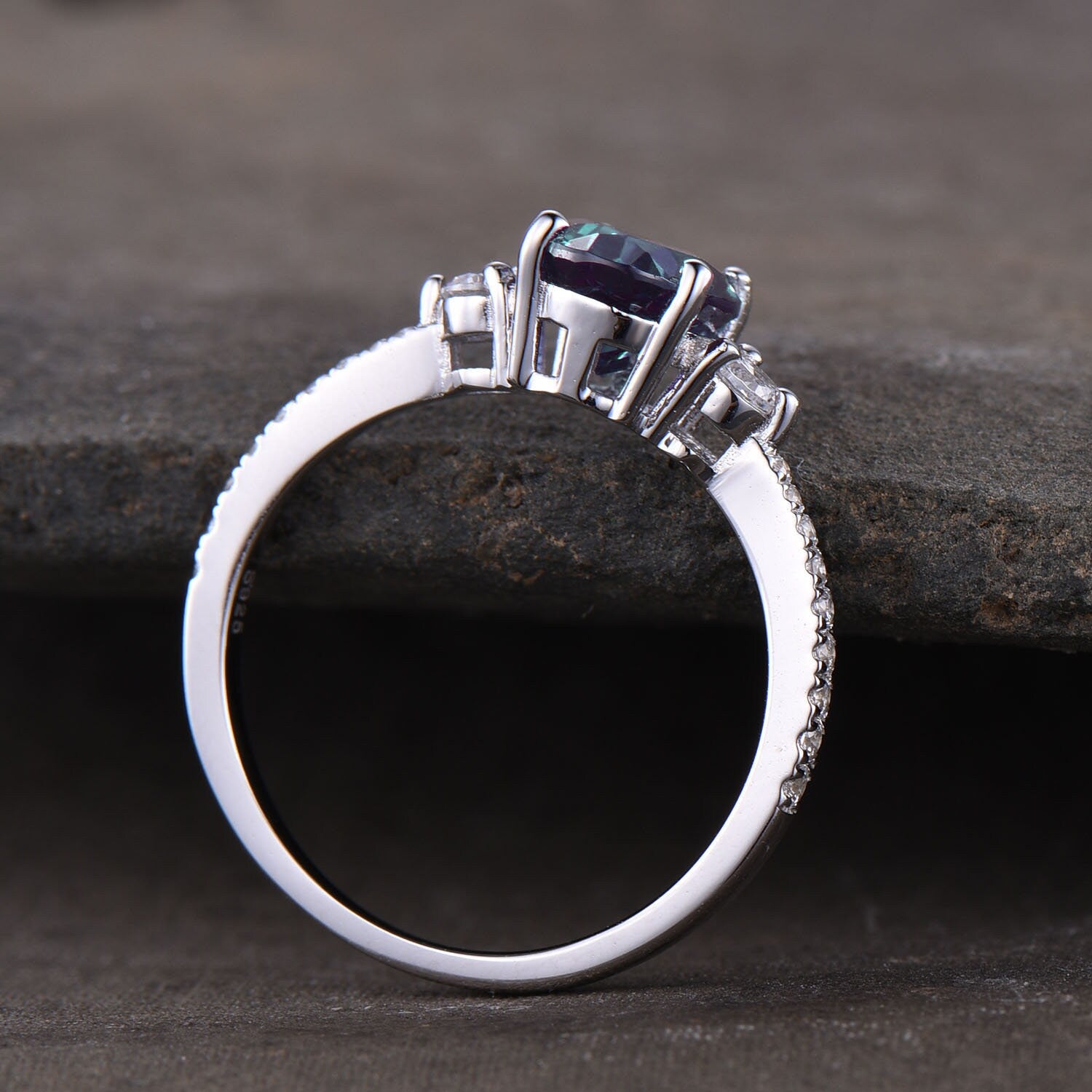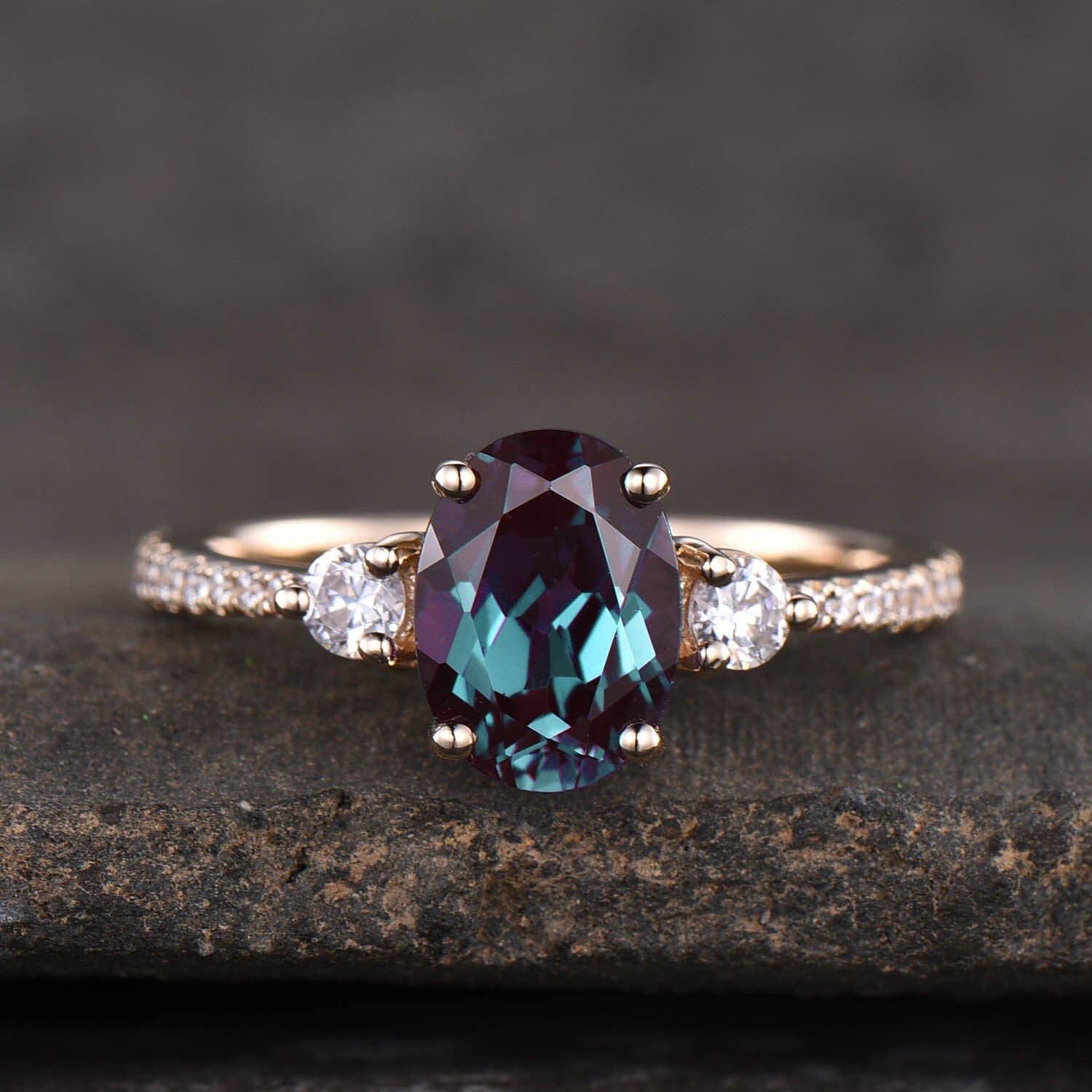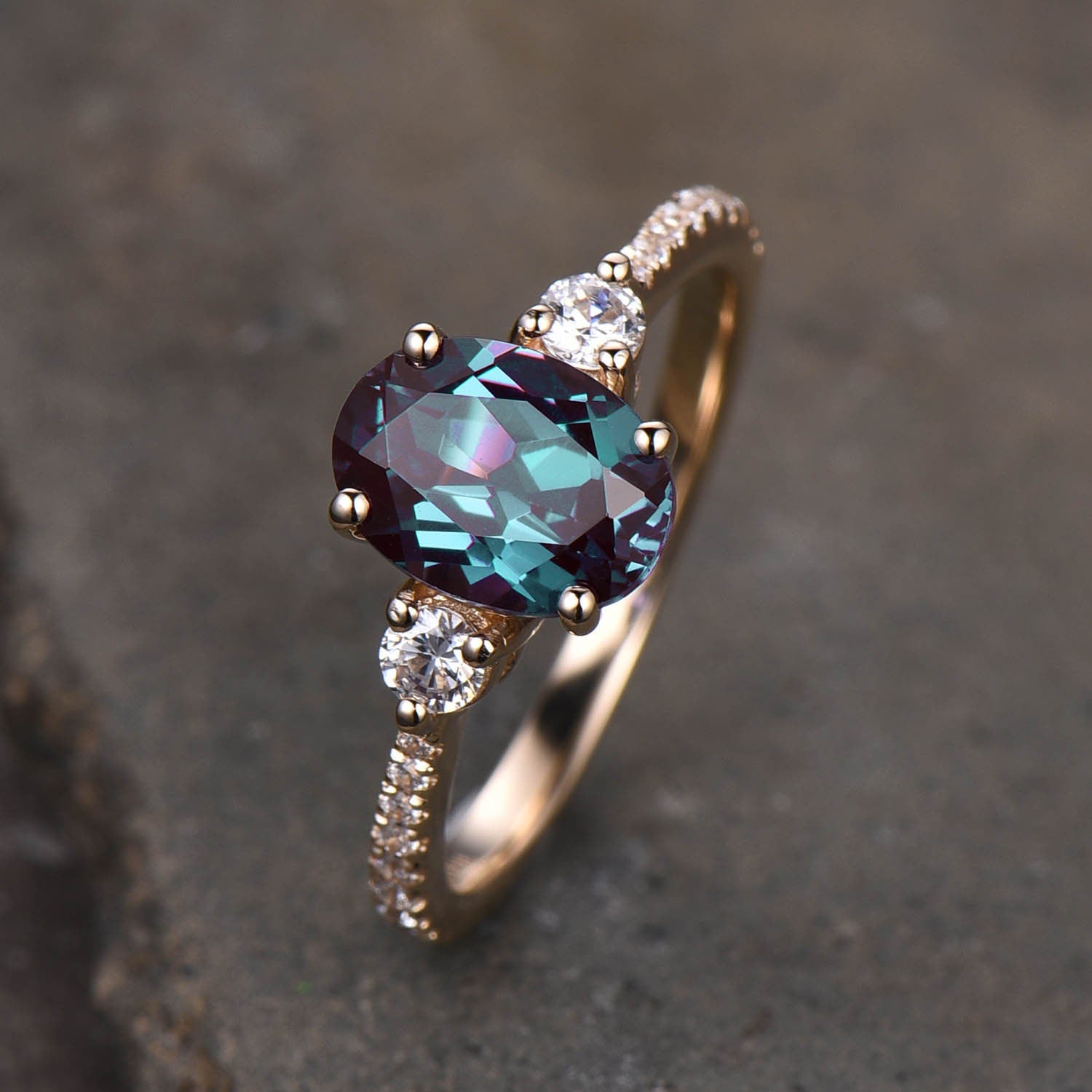 Alexandrite Ring, Oval Alexandrite Engagement Ring, Three Stone Design, June Birthstone Ring, Promise Ring, Anniversary Ring