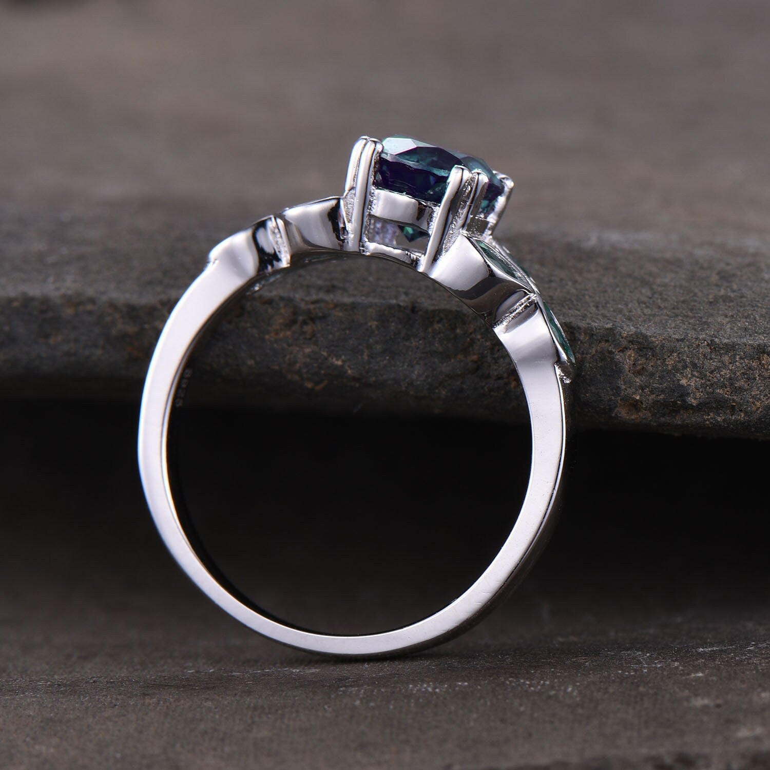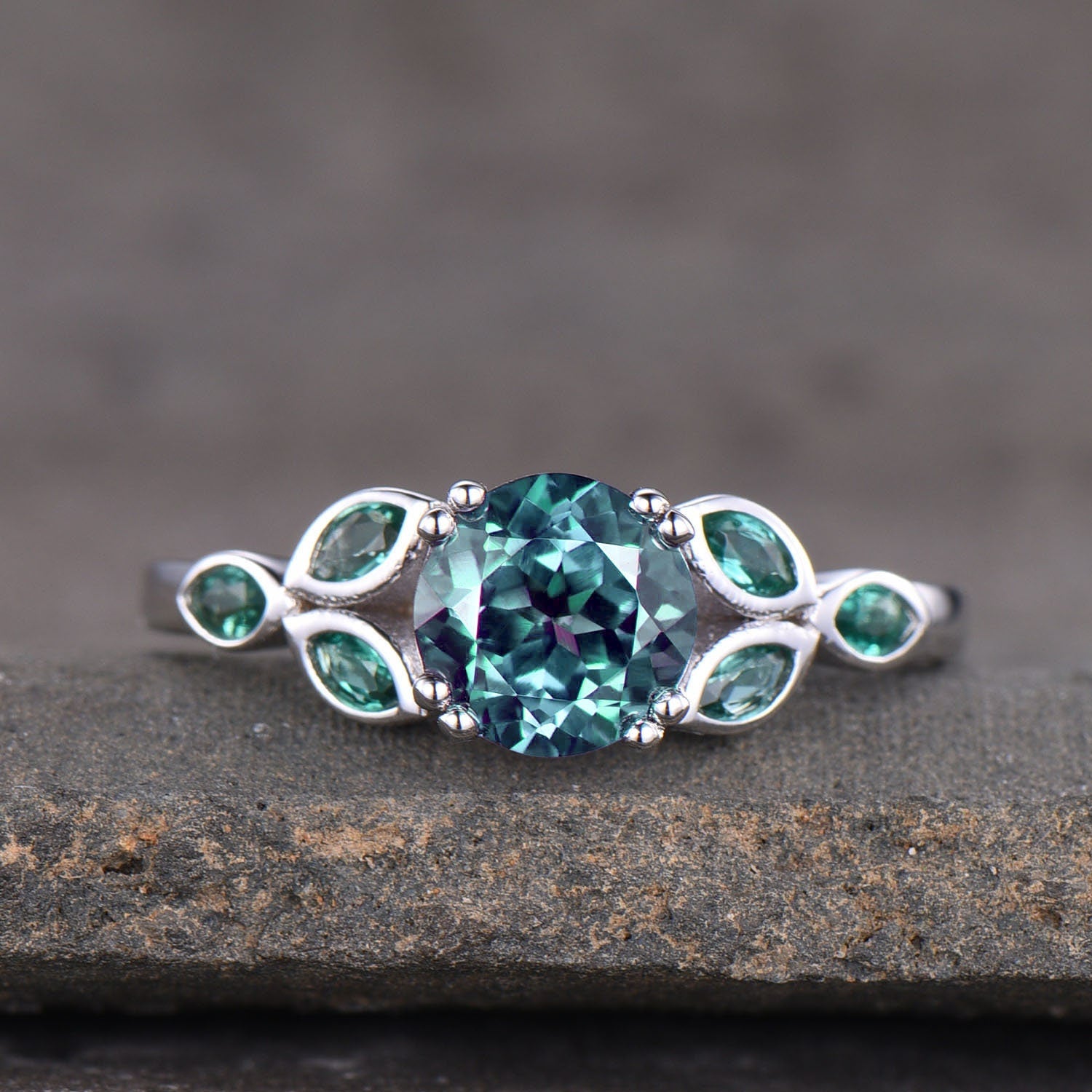 Alexandrite Ring, Round Cut Engagement Ring, Color Changing Ring, June Birthstone, Emerald Side Stone, Promise Ring, Sterling Silver