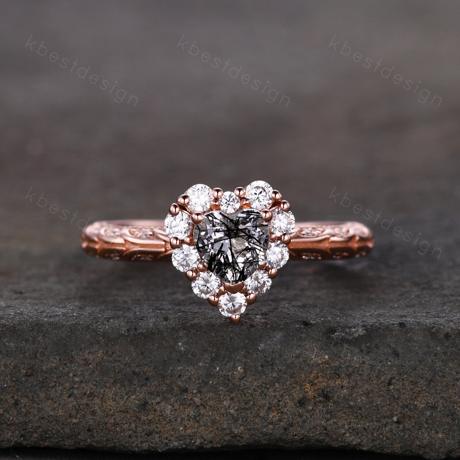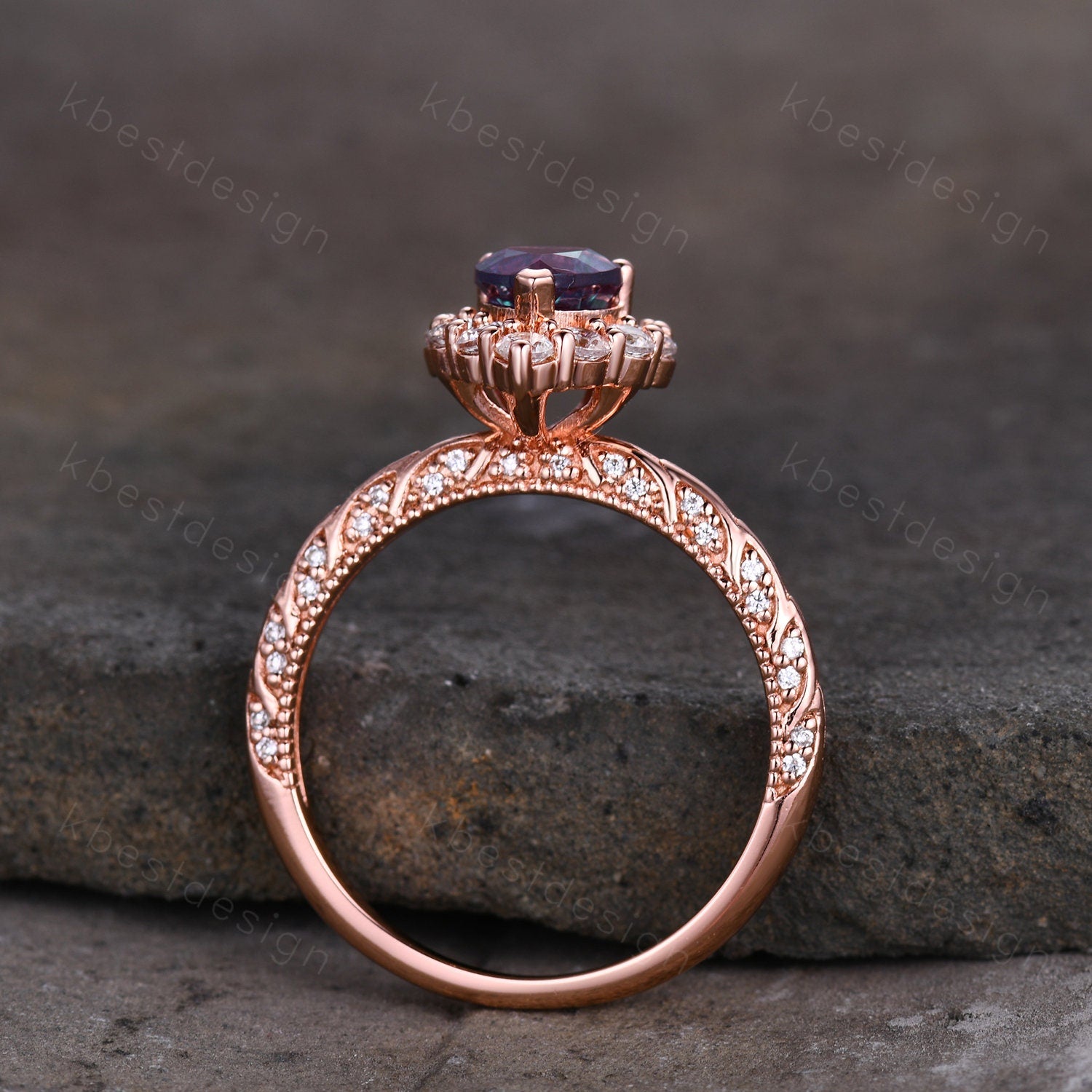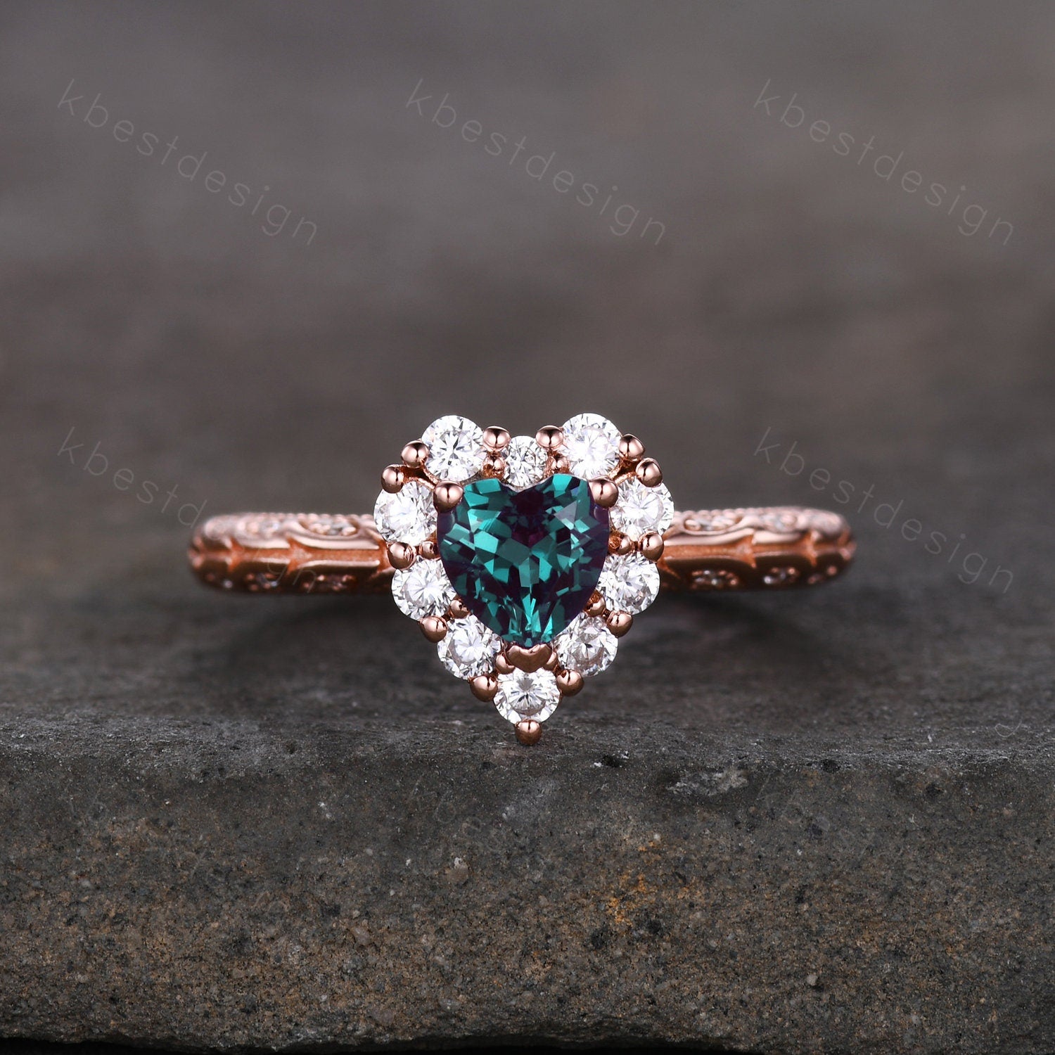 Antique Alexandrite Engagement Ring Rose Gold Heart Shaped Ring Unique Halo Moissanite Ring Art Deco Promise Ring June Birthstone Ring