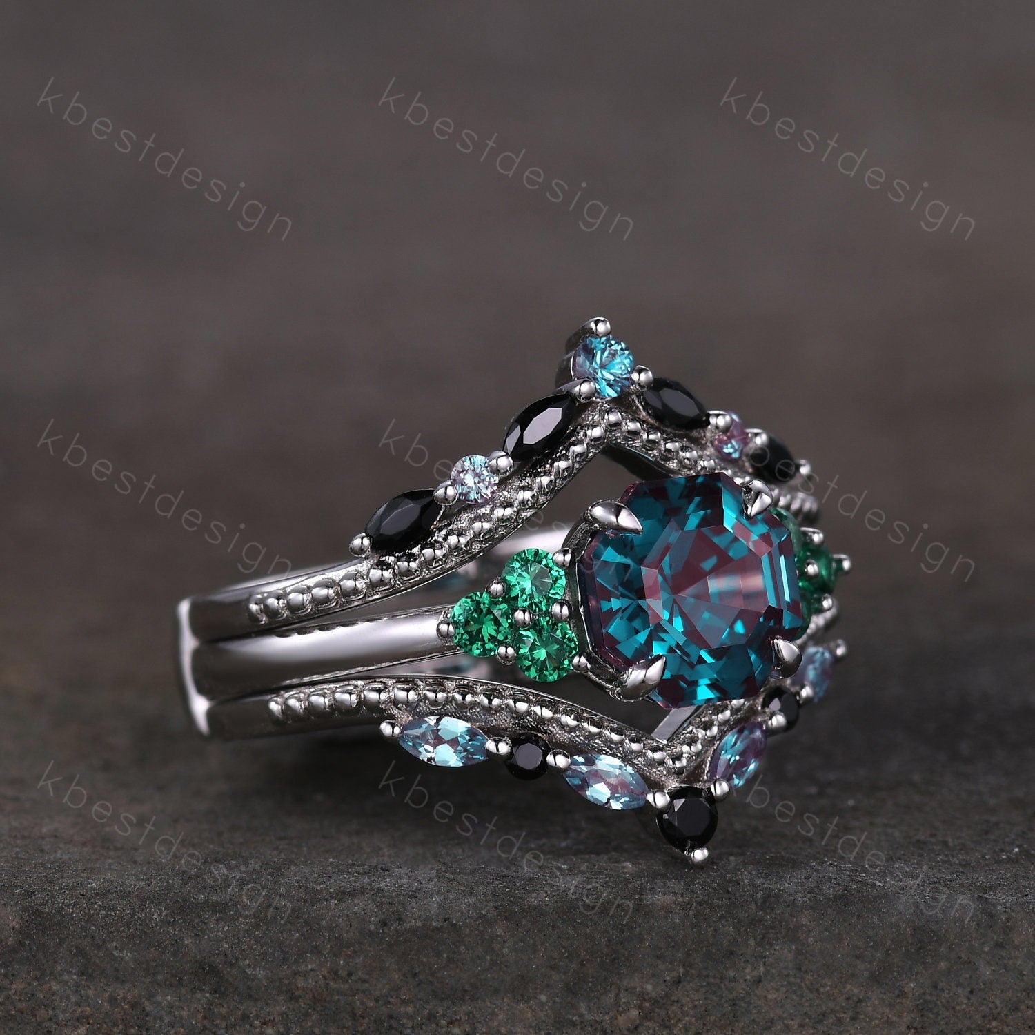 This is a retro Vintage Antique Alexandrite Engagement Ring Set Asscher cut Engagement Ring Unique Art Deco Black Spinel Stacking Matching Band Bridal Promise Set . A Modern asscher cut meets an intricate nature inspired design in this unique color changing stone engagement ring.