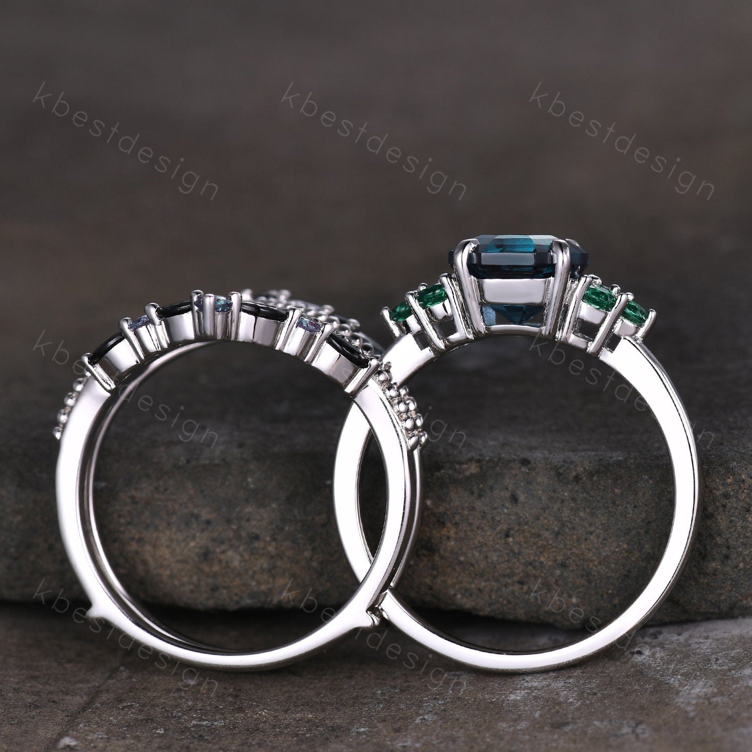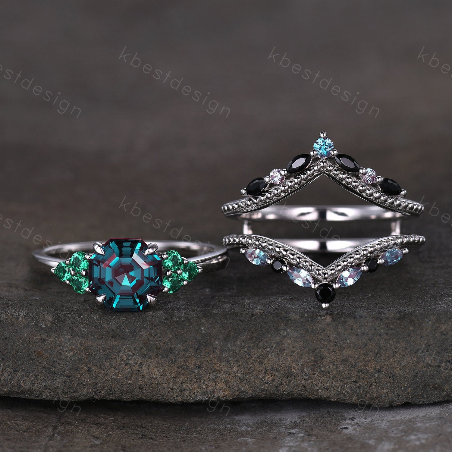 Antique Alexandrite Engagement Ring Set Asscher cut Engagement Ring Unique Art Deco Black Spinel Stacking Matching Band Bridal Promise Set