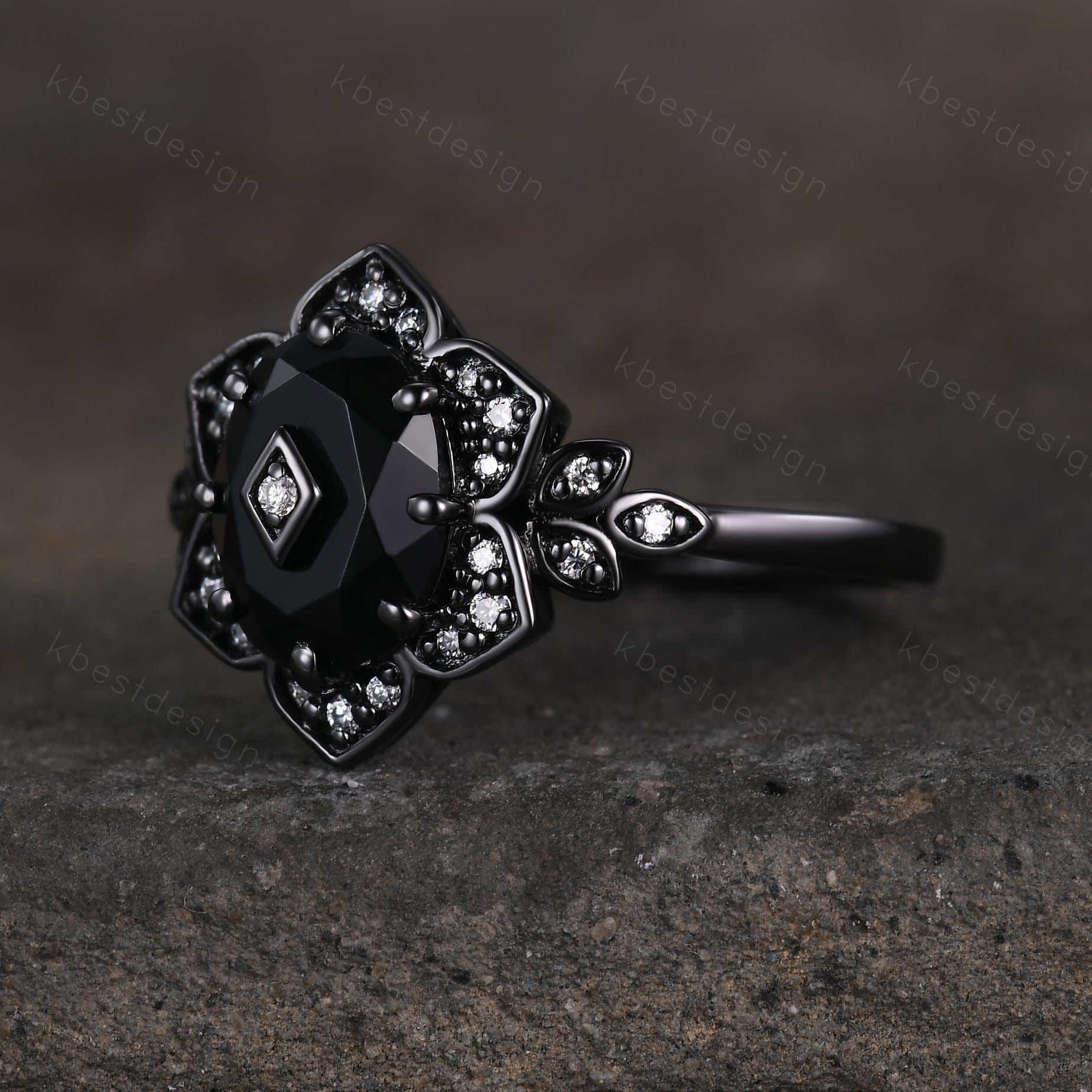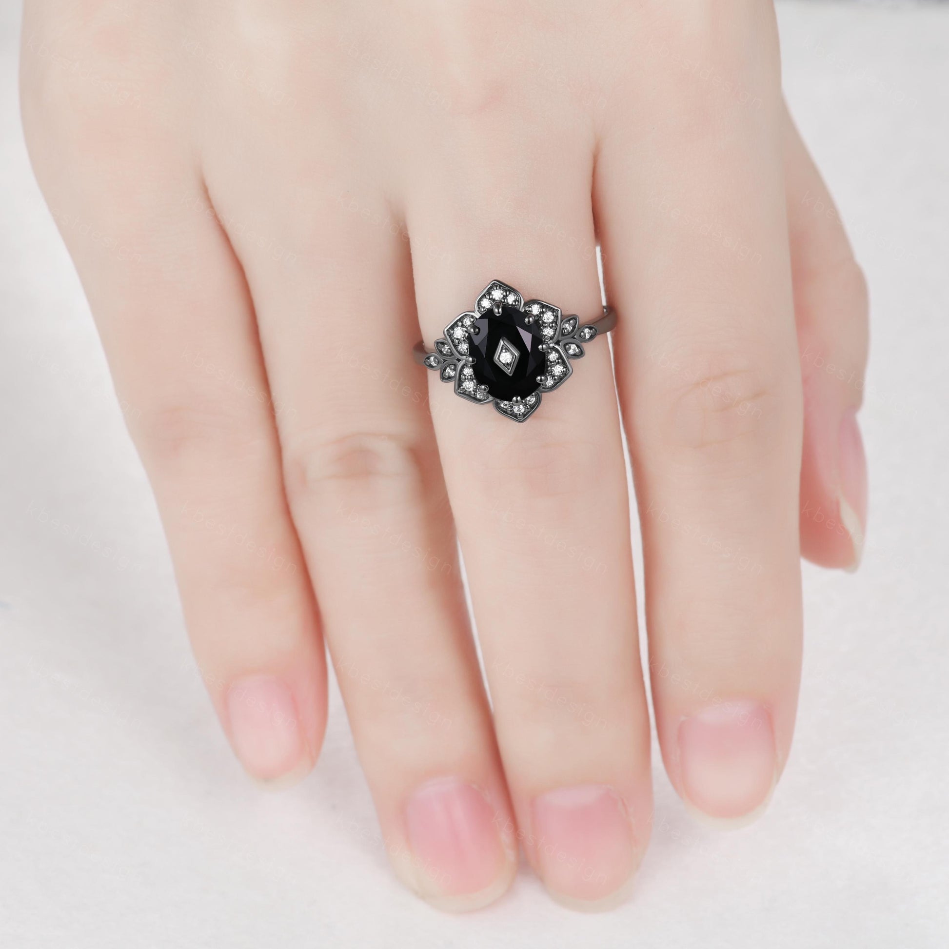Antique black onyx engagement ring Black gold ring Art deco floral design moissanite wedding ring unique petal ring bridal promise ring