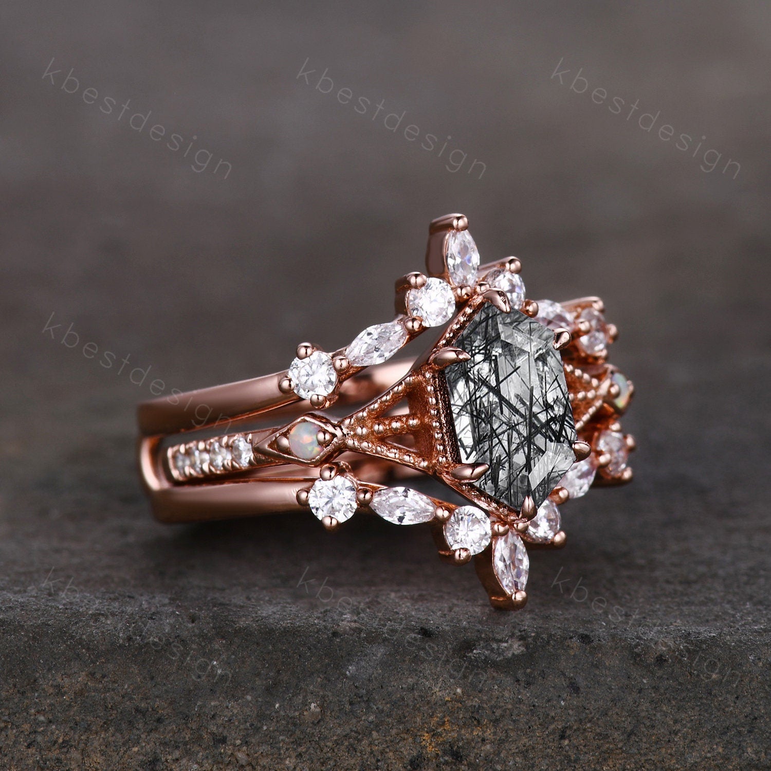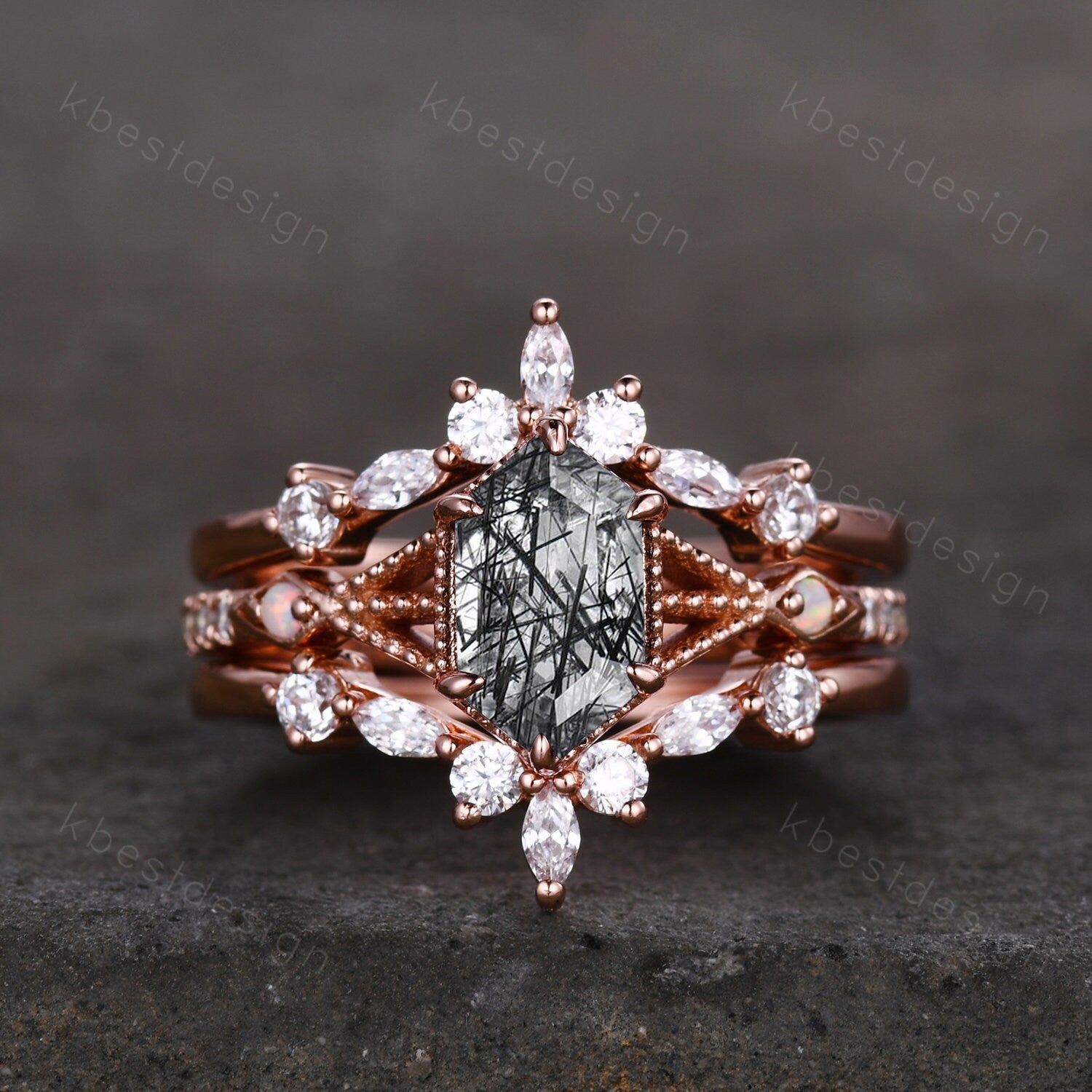 Antique Black Rutilated Quartz Engagement Ring Set Hexagon cut Engagement Ring Unique Art Deco Moissanite Stacking Band Bridal Promise Set