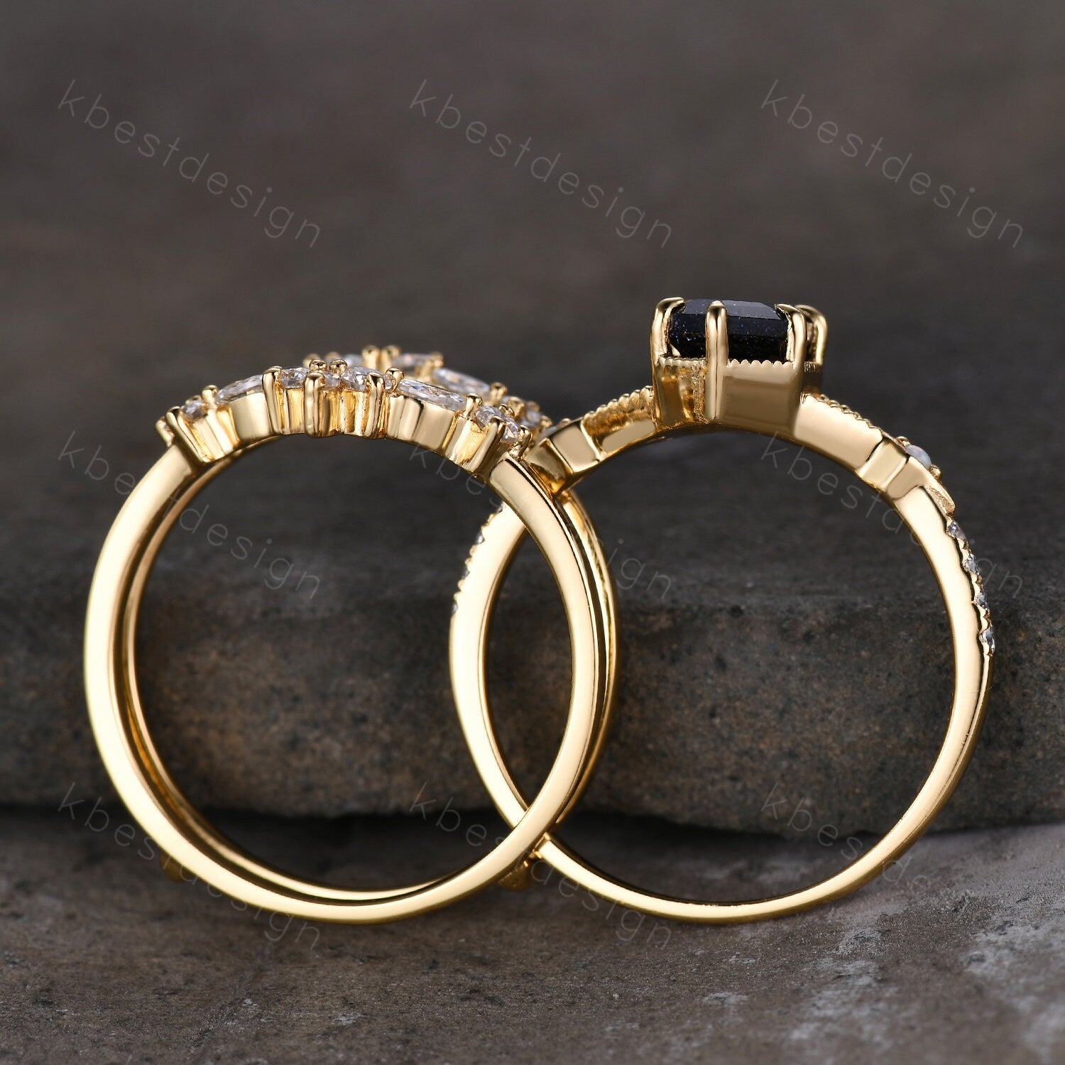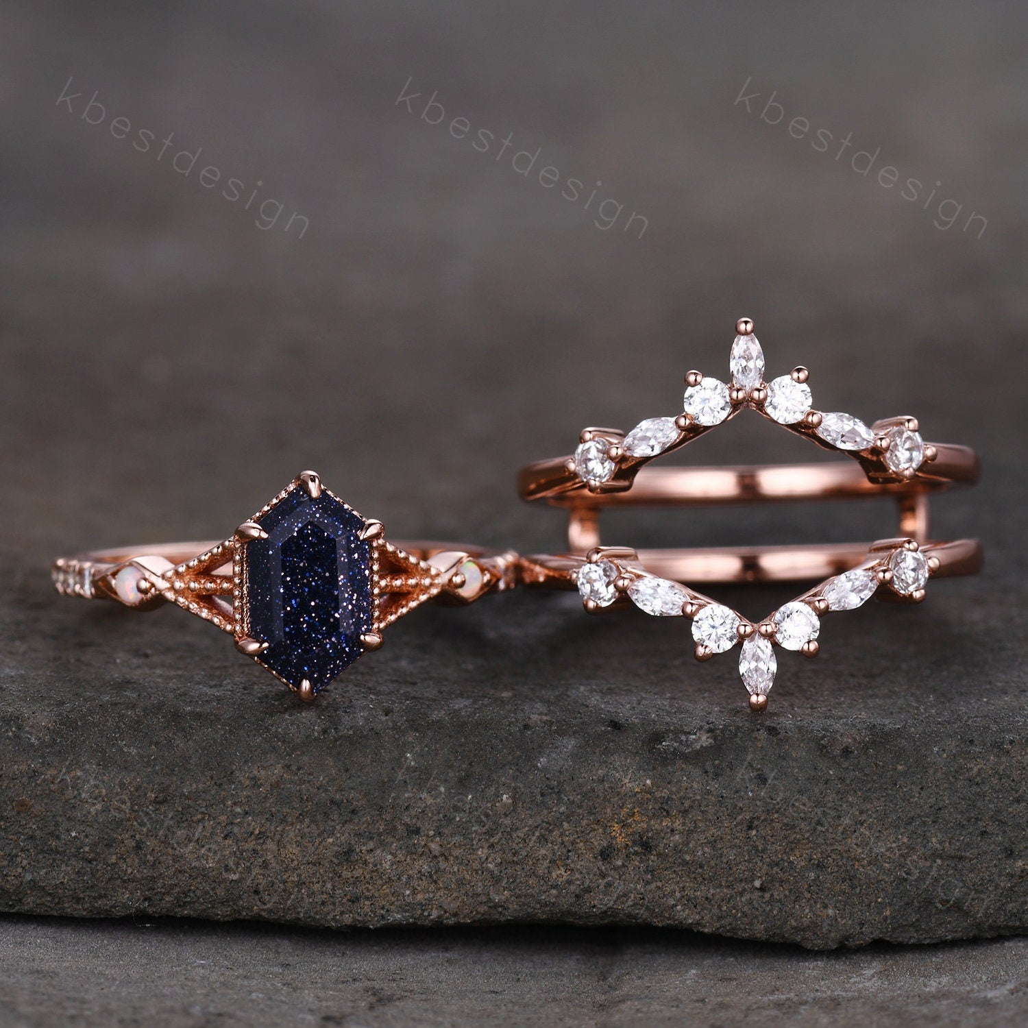 This is a Antique Blue Sandstone Engagement Ring Set Yellow Gold Hexagon cut Ring Unique Art Deco Moissanite Stacking Matching Band Bridal Promise Set. A Modern Long Hexagon cut meets an intricate nature inspired design in this unique galaxy sandstone stone engagement ring.