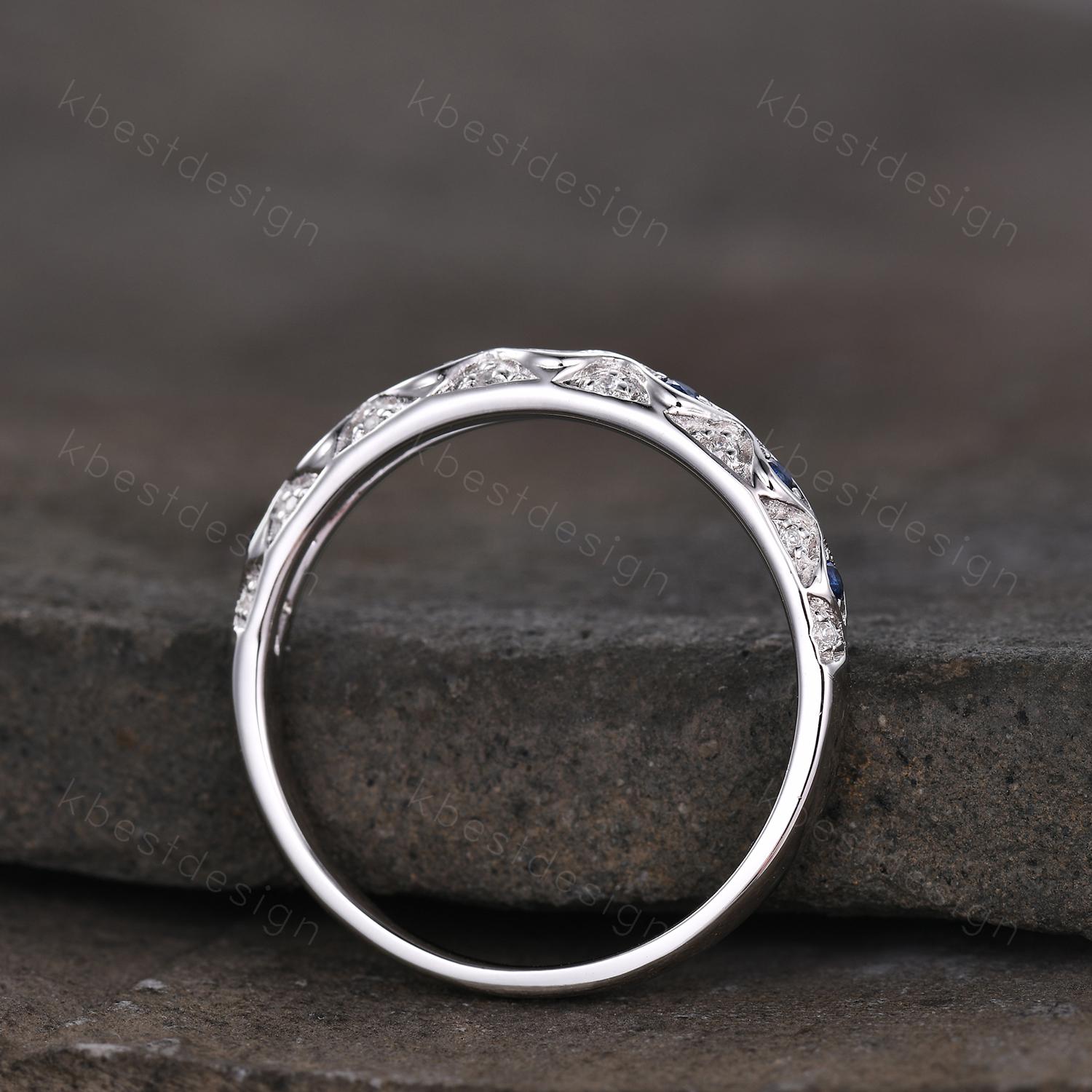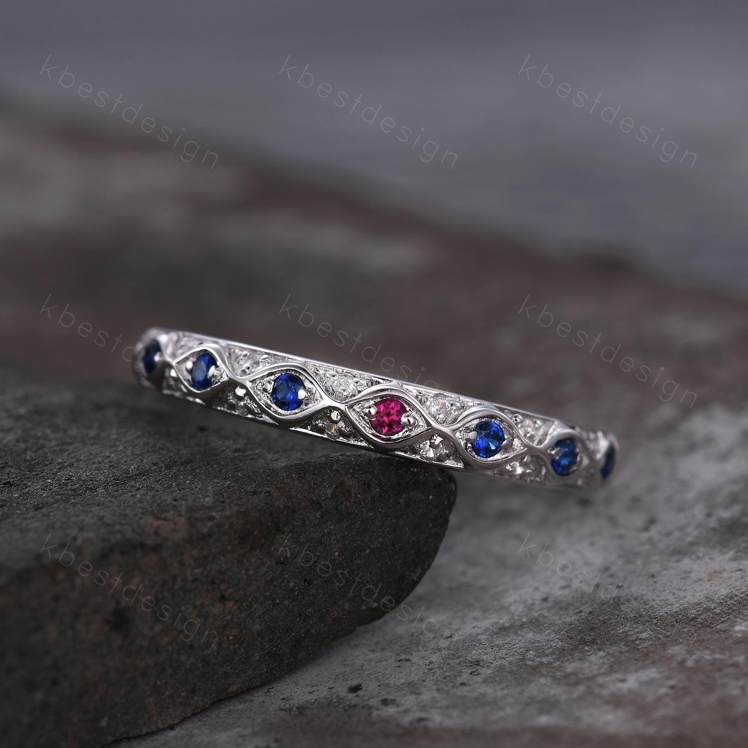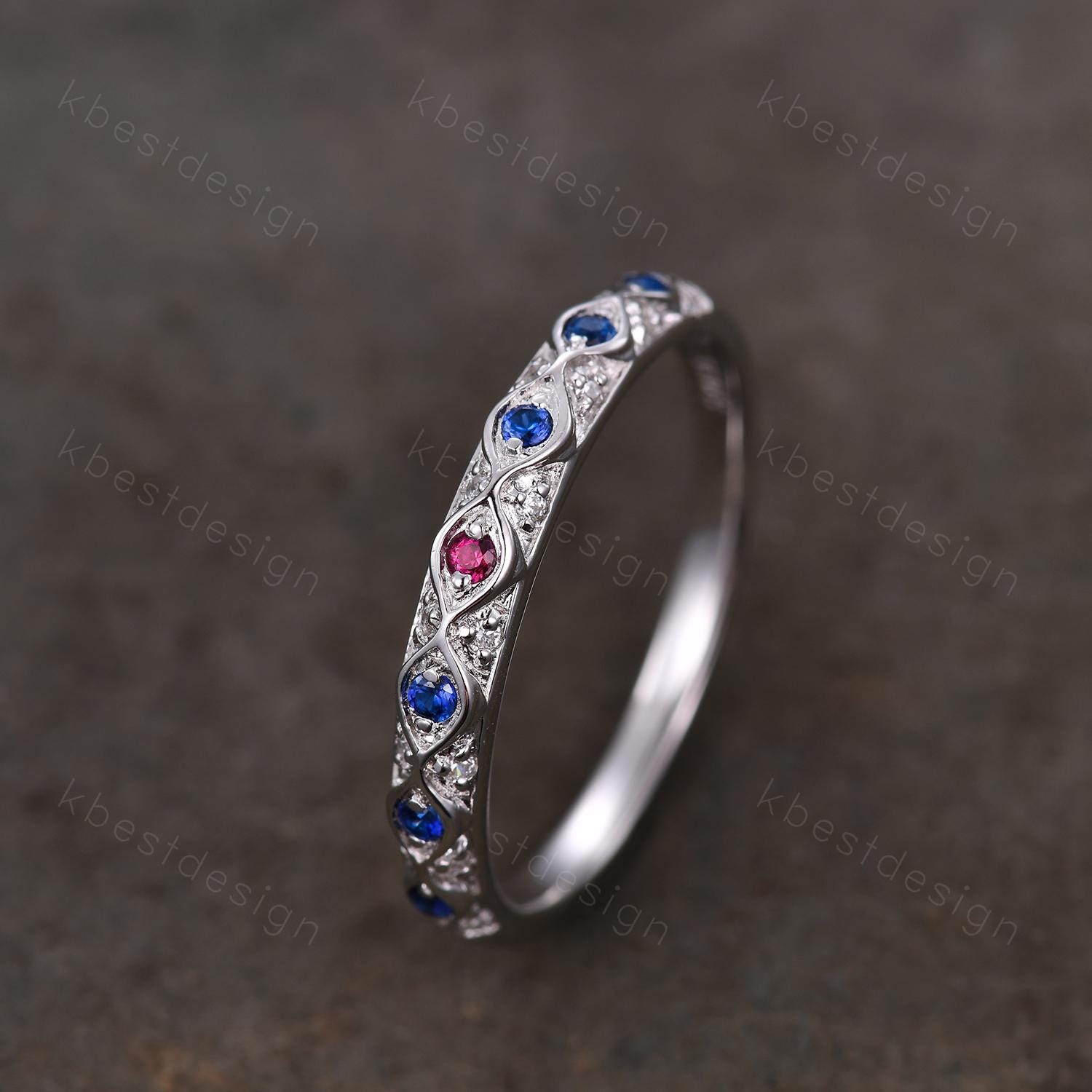 Antique Blue Sapphire Wedding Band Women Vintage Ruby Wedding Band Multi Gemstone Band Art Deco Stacking Matching Band Anniversary Ring
