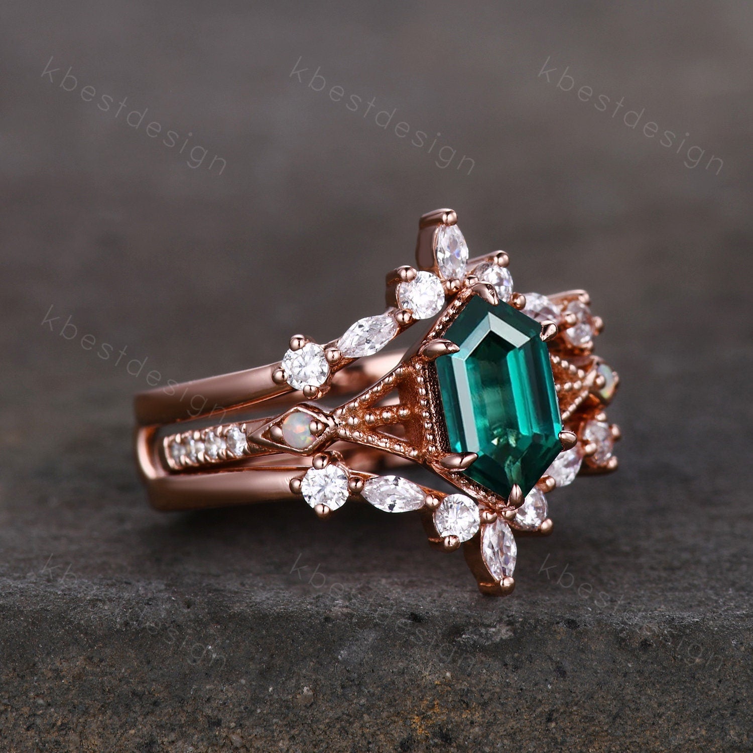 This is a Antique Green Emerald Engagement Ring Set Hexagon cut Engagement Ring Unique Art Deco Moissanite Stacking Matching Band Bridal Promise Set. A Modern Long Hexagon cut meets an intricate nature inspired design in this unique green emerald stone engagement ring.