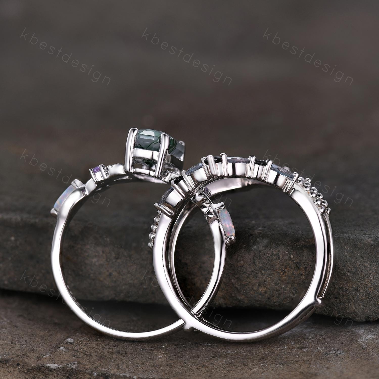 Antique Moss Agate Engagement Ring Set Retro Emerald cut Engagement Ring Unique Double Curved Alexandrite Stacking Band Bridal Promise Set