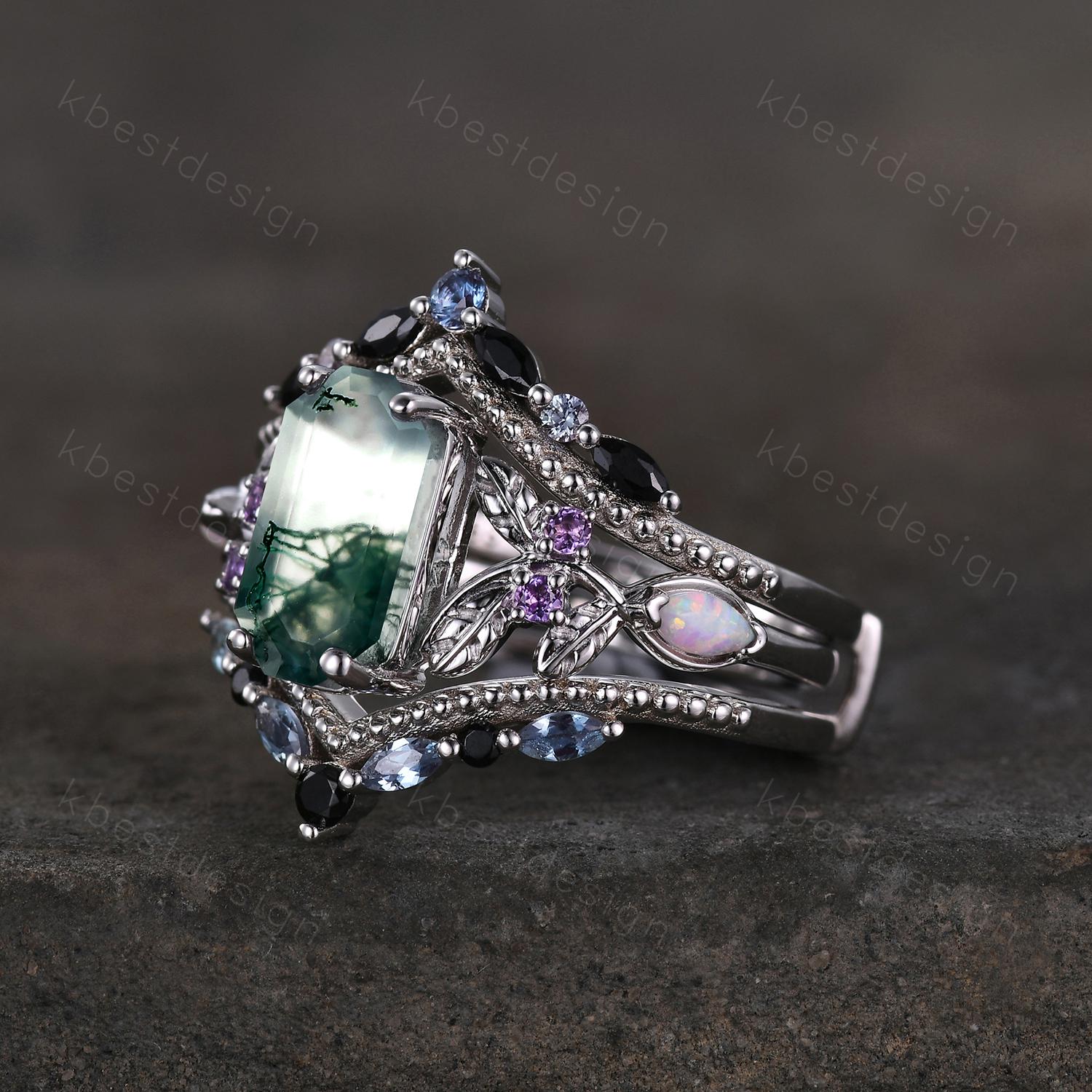 This is a Antique Moss Agate Engagement Ring Set Retro Emerald cut Engagement Ring Unique Double Curved Alexandrite Stacking Band Bridal Promise Set. A Modern Emerald cut meets an intricate nature inspired design in this unique green moss agate stone engagement ring.