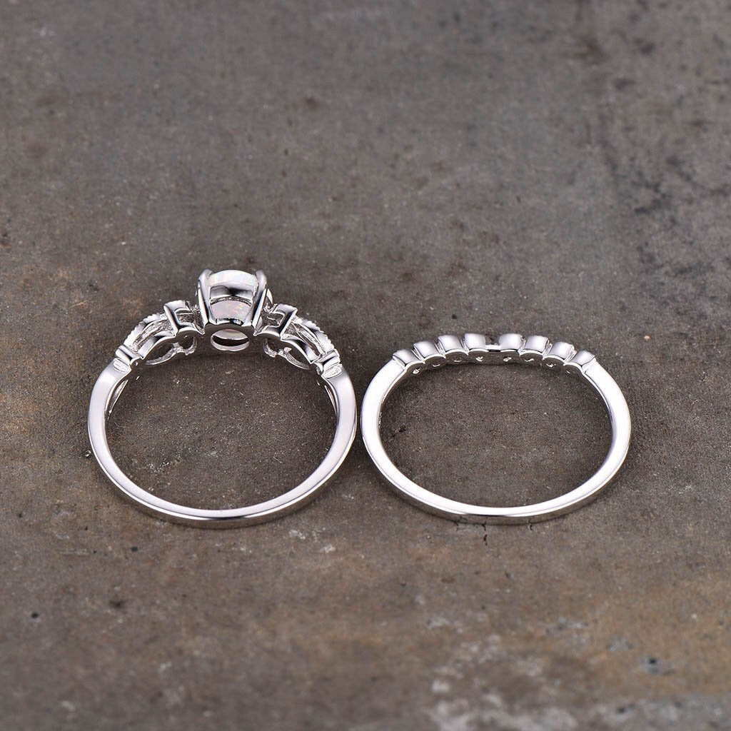 Antique Opal Wedding Ring Set/White Fire Opal Engagement Ring/October Birthstone Ring/Art deco Stacking Band/Wedding Ring/Promise Ring