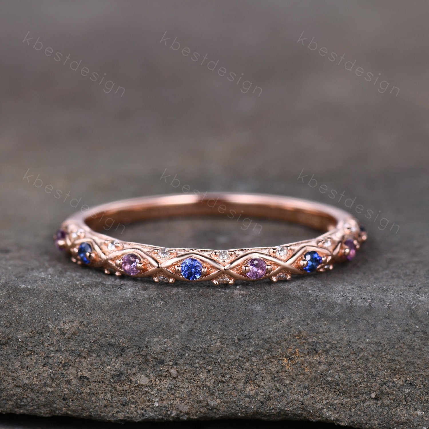 Stones: half eternity Sapphire + Amethyst alternating, the colorless stones are moissanite.
