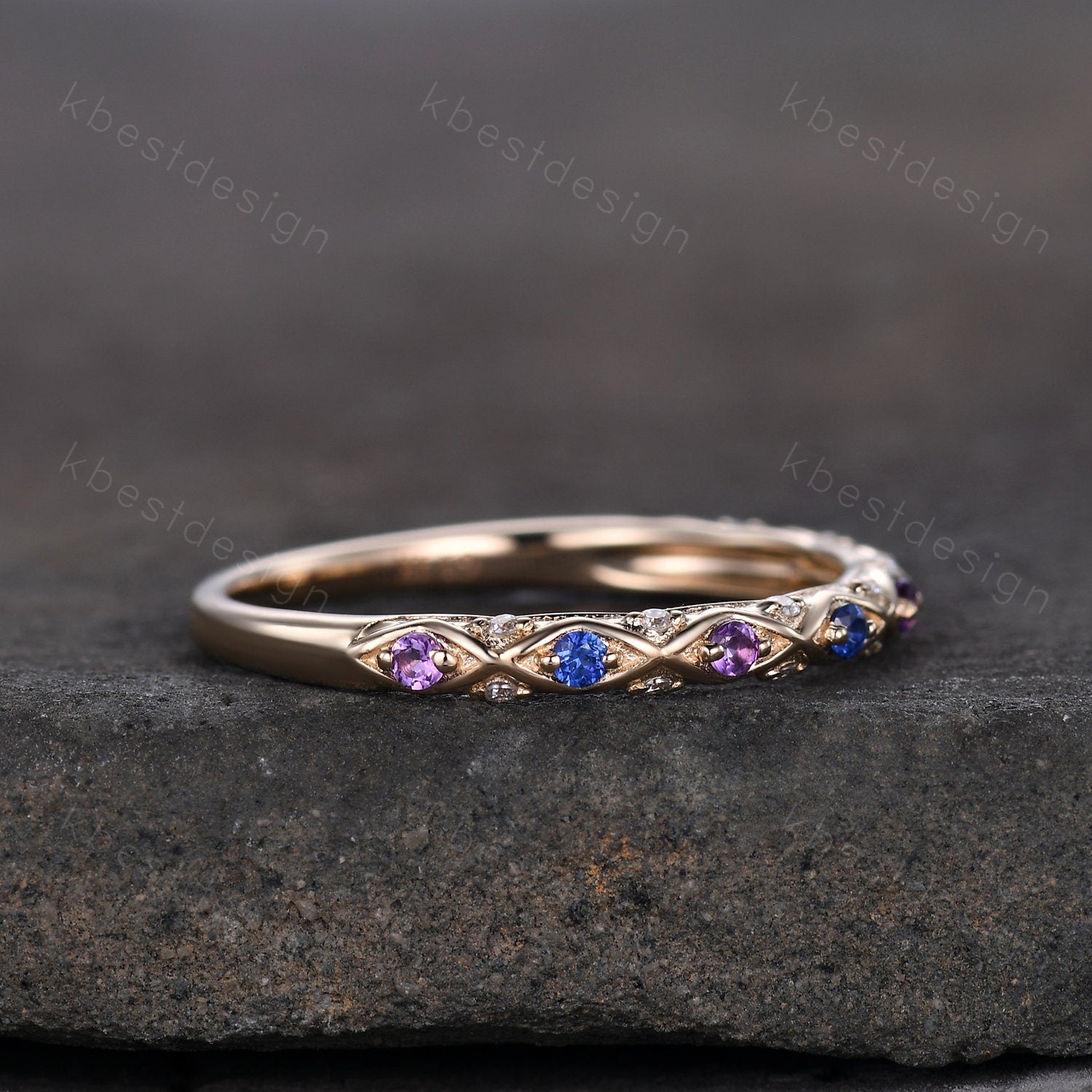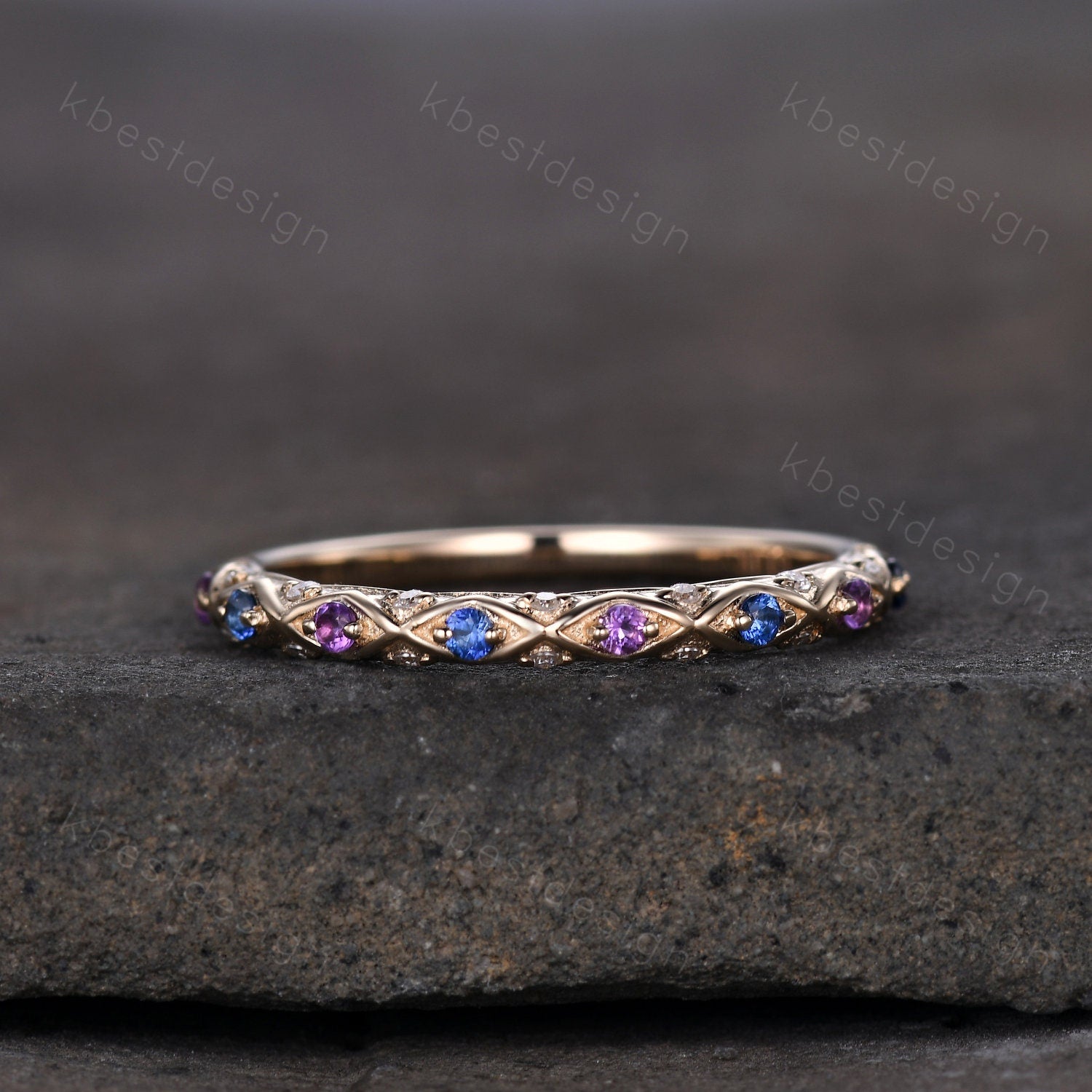 This is an unique vintage Sapphire and Amethyst wedding band in yellow gold. (The stones can be changed, please feel free to contact me if needed)