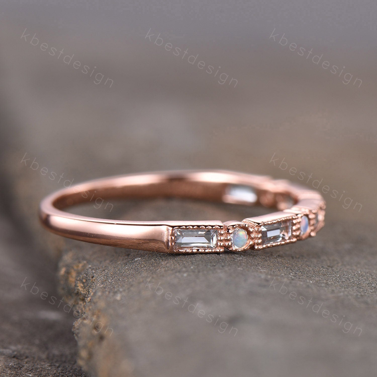 Aquamarine Ring, Women Rose Gold Wedding Band, Half Eternity Aquamarine Opal Band, Art Deco Stacking Matching Band, Anniversary Ring