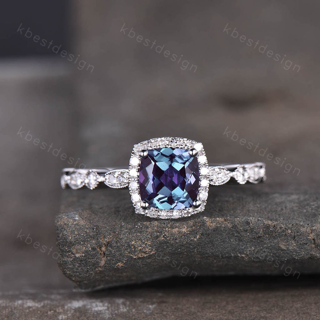 Art Deco Alexandrite Engagement Ring Cushion cut Ring Dainty Women Silver Wedding Ring Moissanite Halo Ring Promise Ring Anniversary Gift