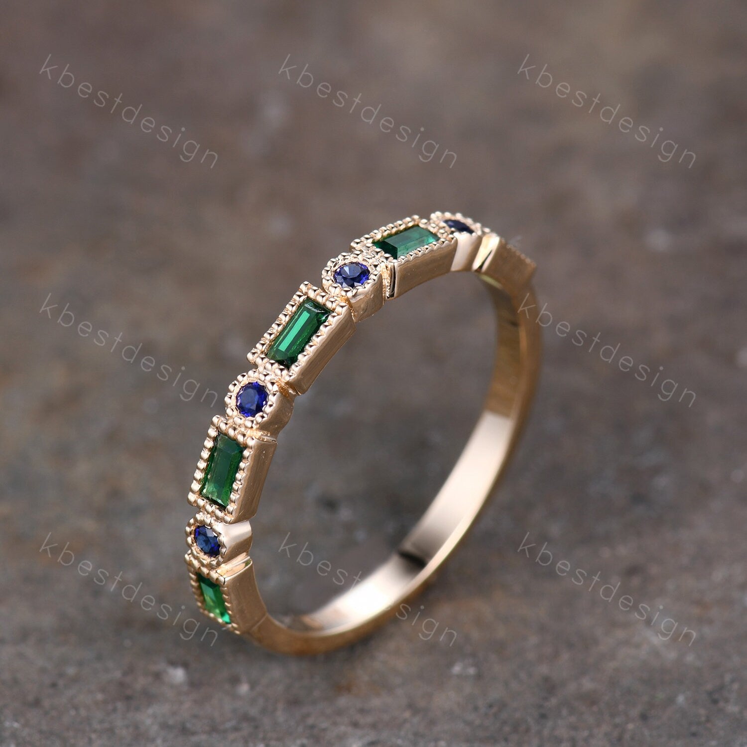 Art Deco Emerald wedding band 14K Gold emerald sapphire wedding band vintage Milgrain band matching Stacking band Anniversary band