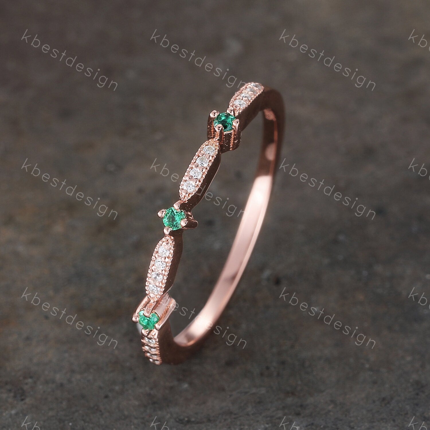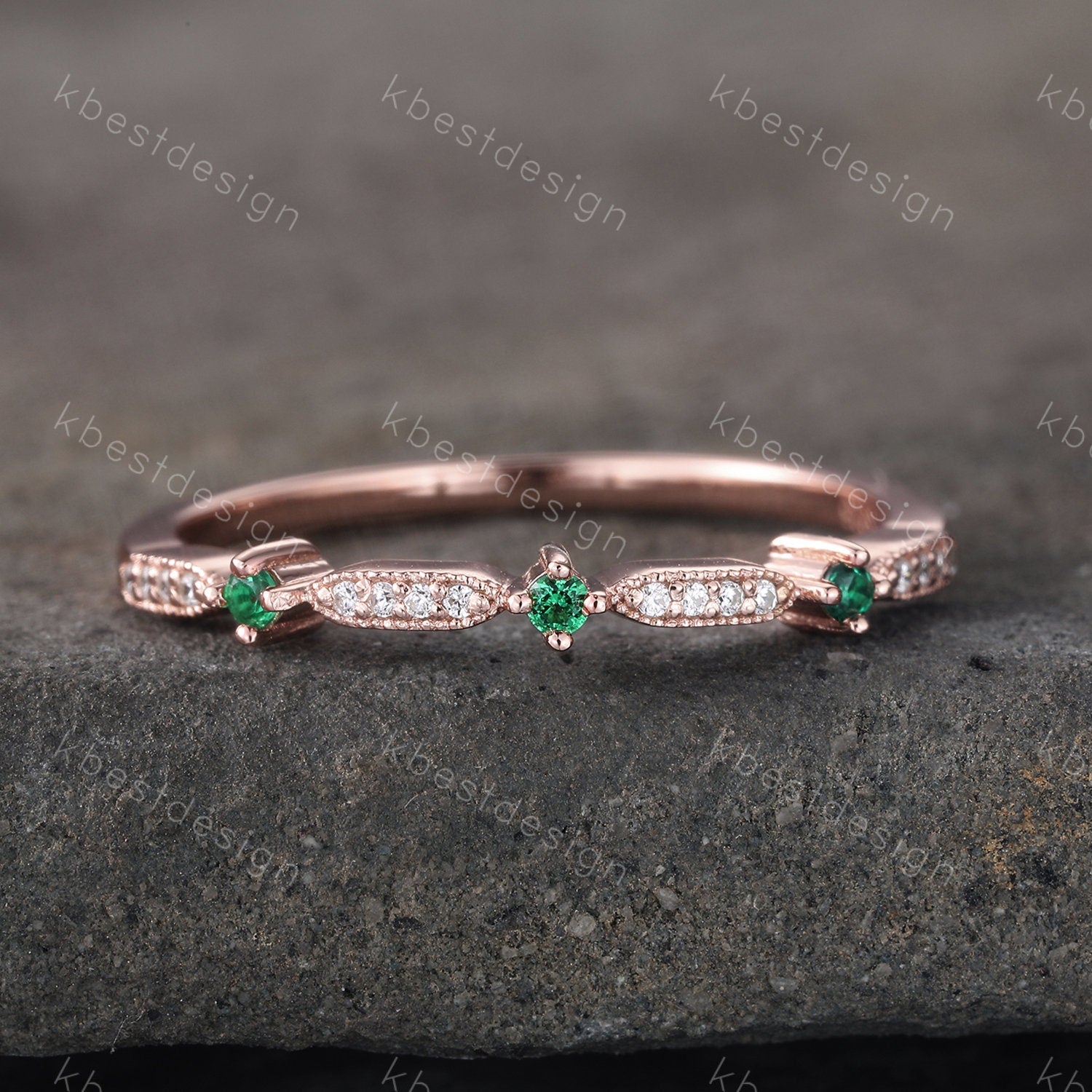 Art Deco Emerald Wedding Band, Rose Gold Emerald Stacking Band, Minimalist Ring, Simulated Diamond CZ Wedding Band Ring, Anniversary Ring