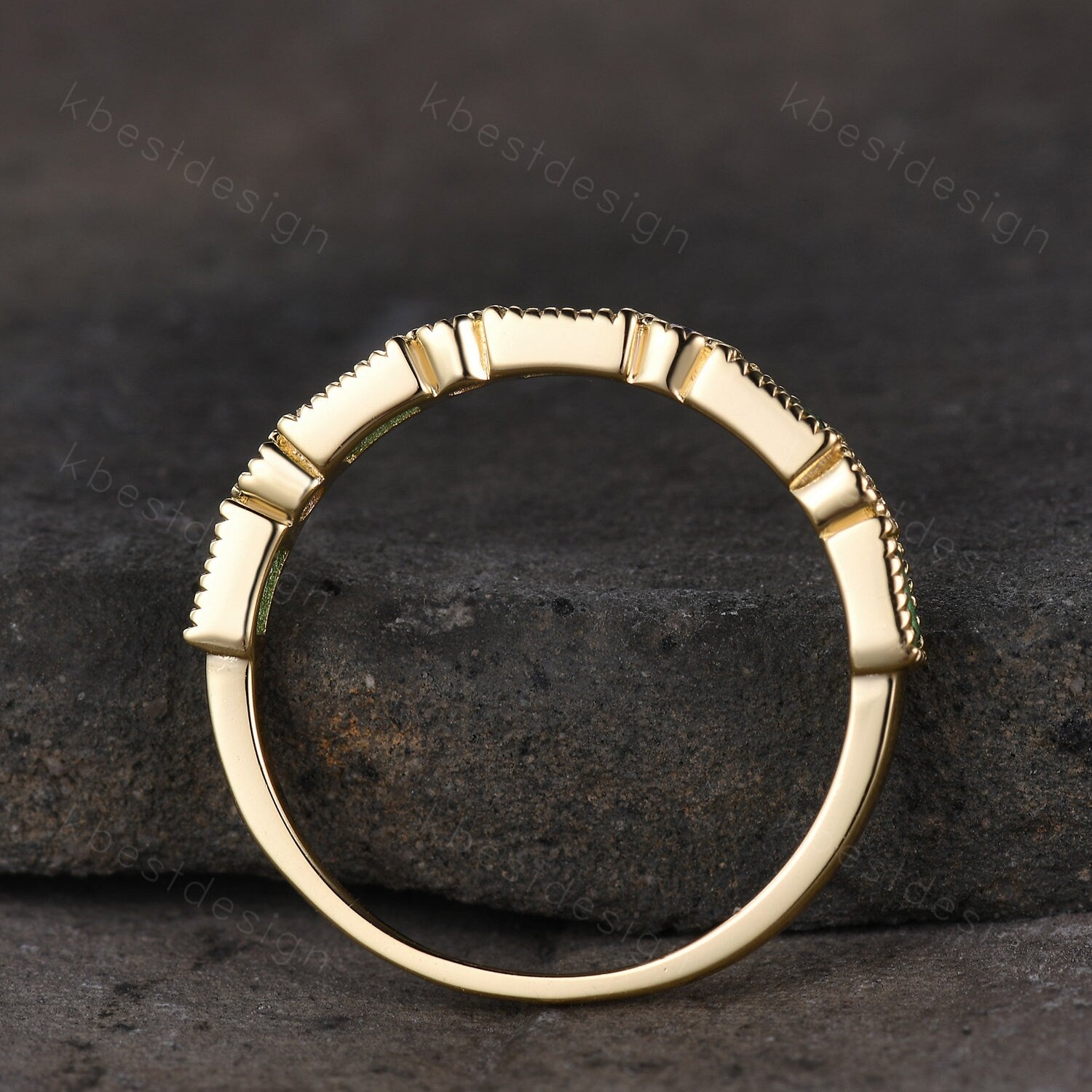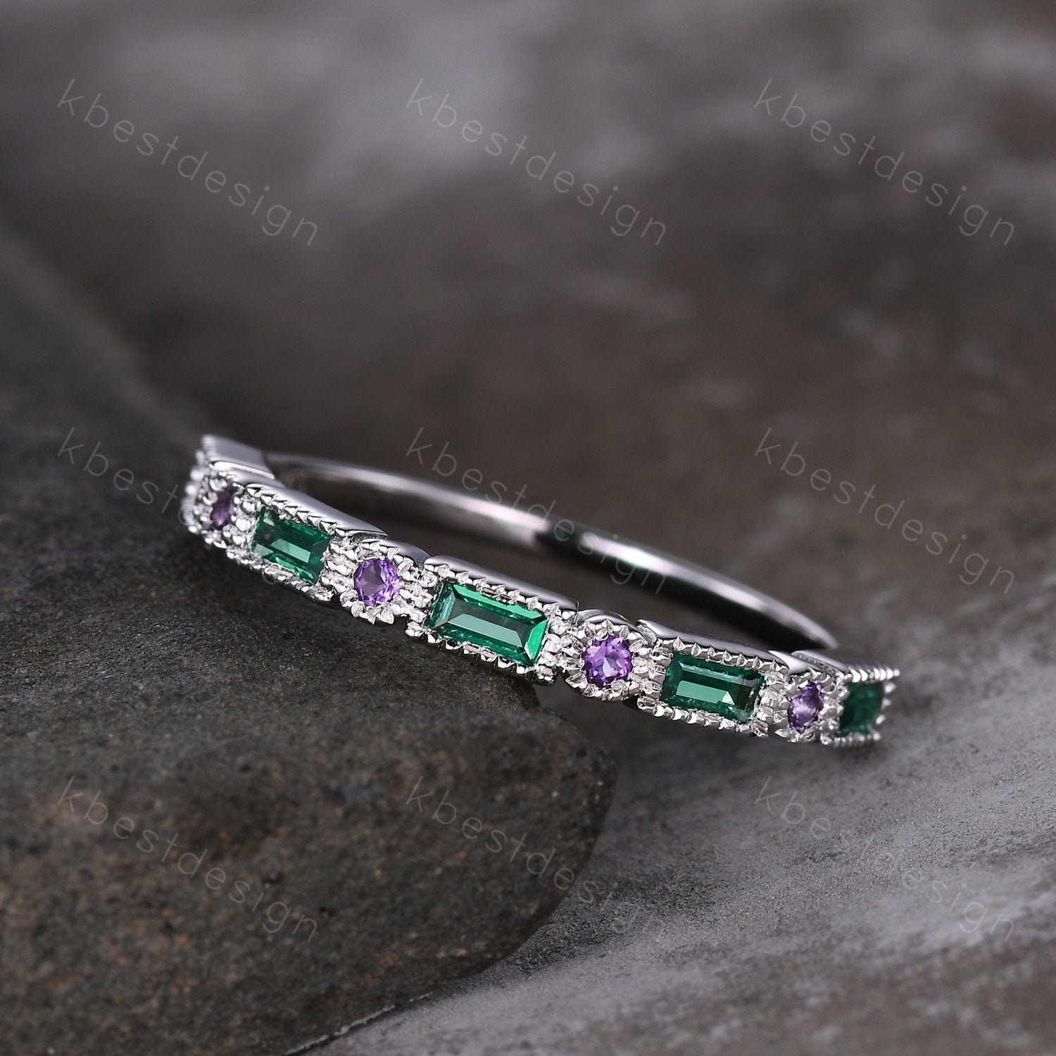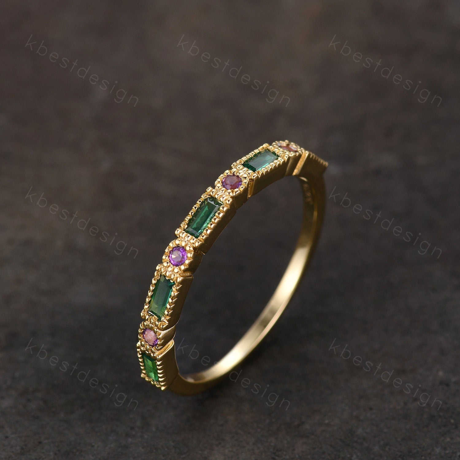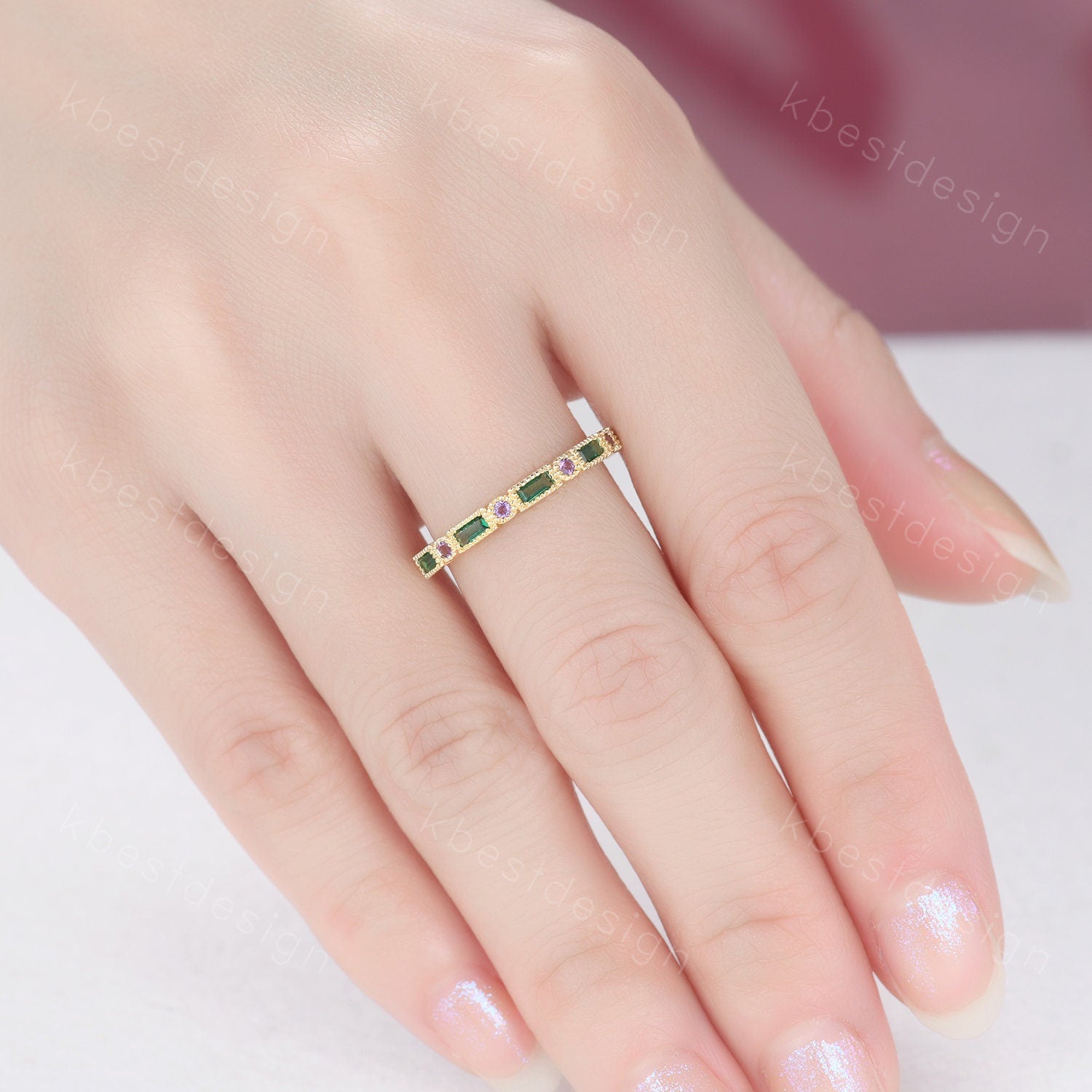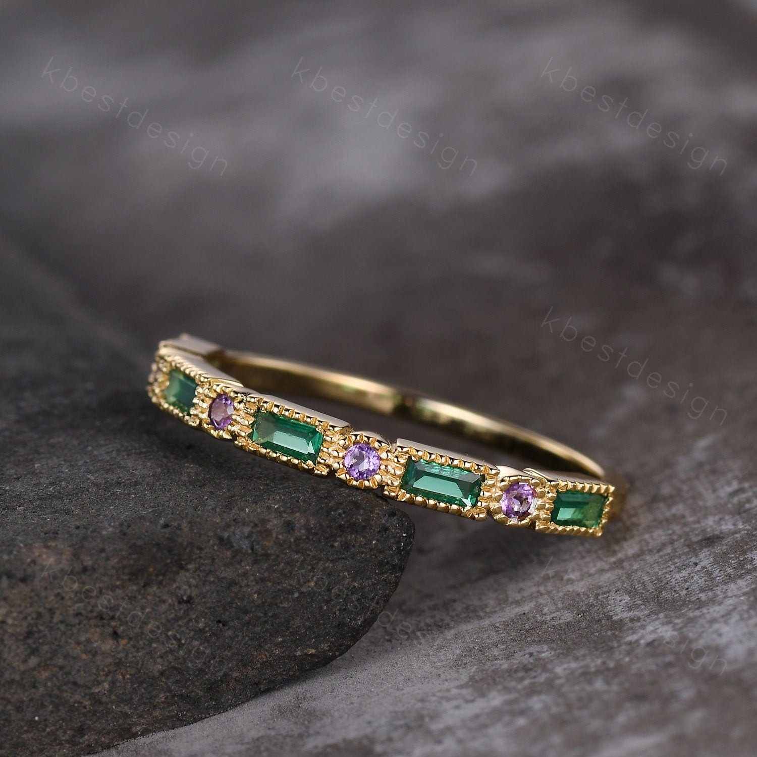 Art Deco Emerald wedding band solid 14k Yellow gold emerald amethyst wedding band vintage baguette Stacking ring women Anniversary band