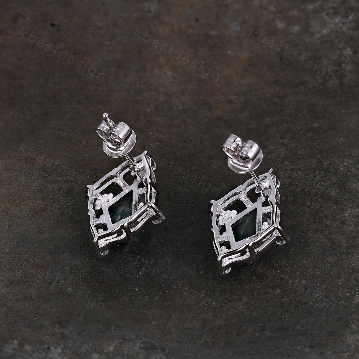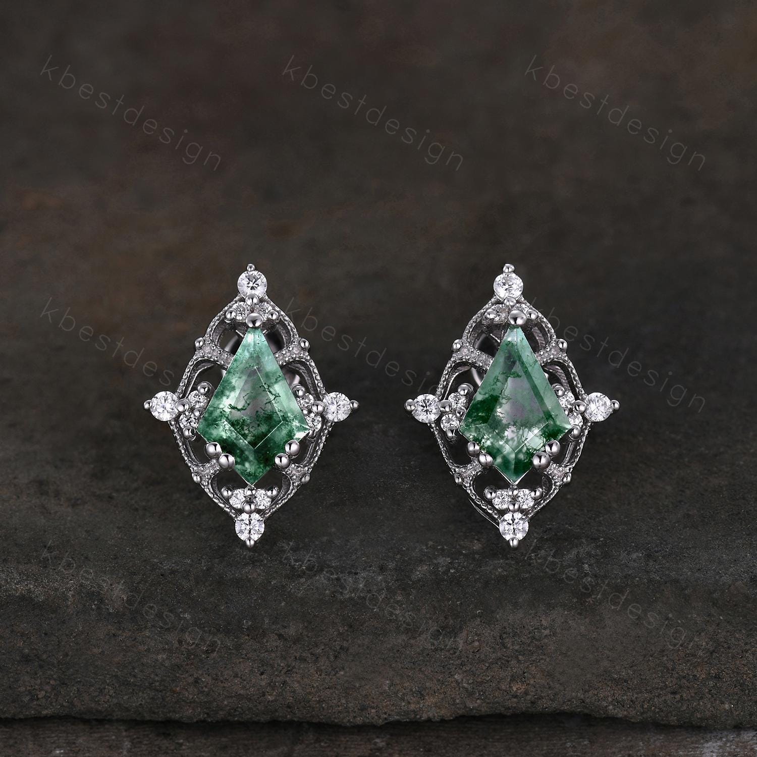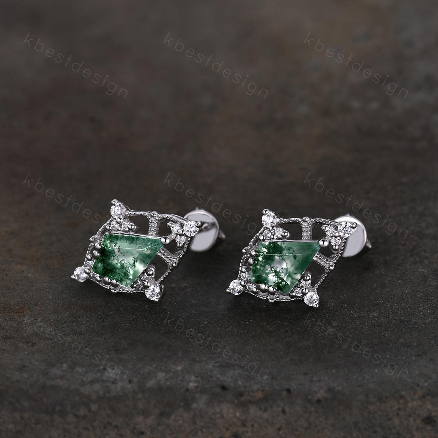 Art deco moss agate earrings women sterling silver earring studs kite cut earrings vintage green agate studs anniversary gift for her