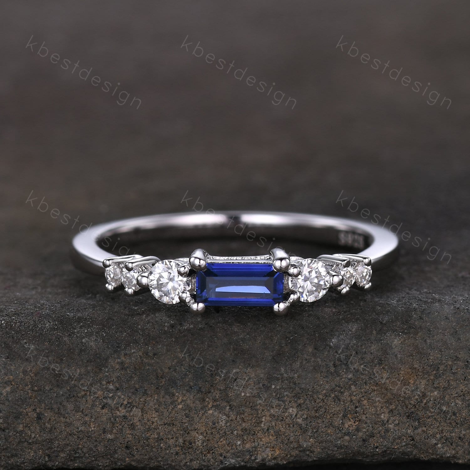 Stone size: 2.5x5mm baguette cut blue sapphire + Moissanite