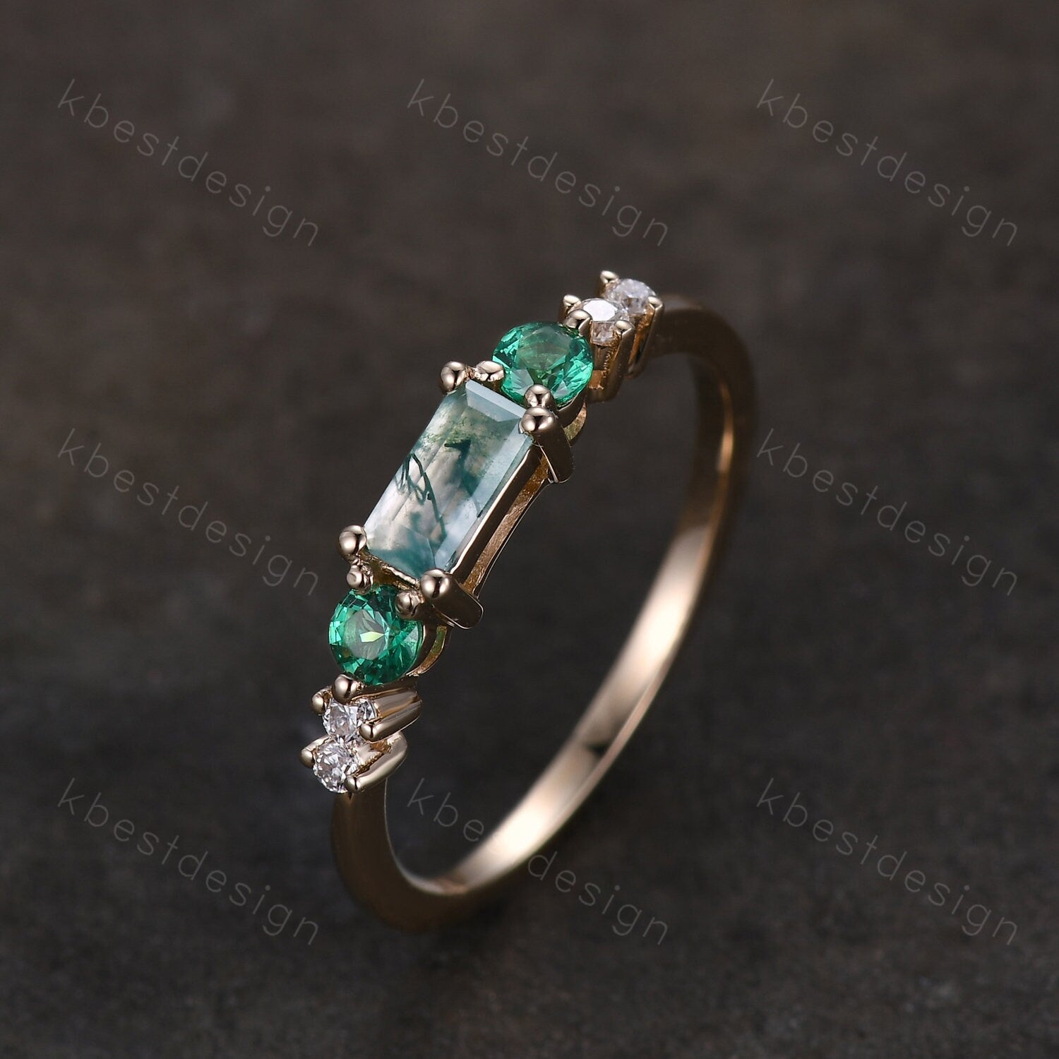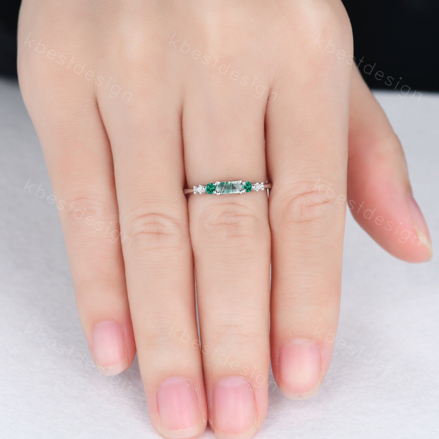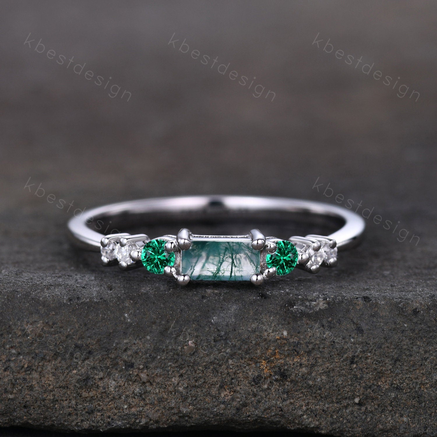 Baguette cut Moss Agate Wedding Band Unique Green Gem Ring Women Silver Ring Antique Moissanite Ring Minimalist Bridal Anniversary Gift