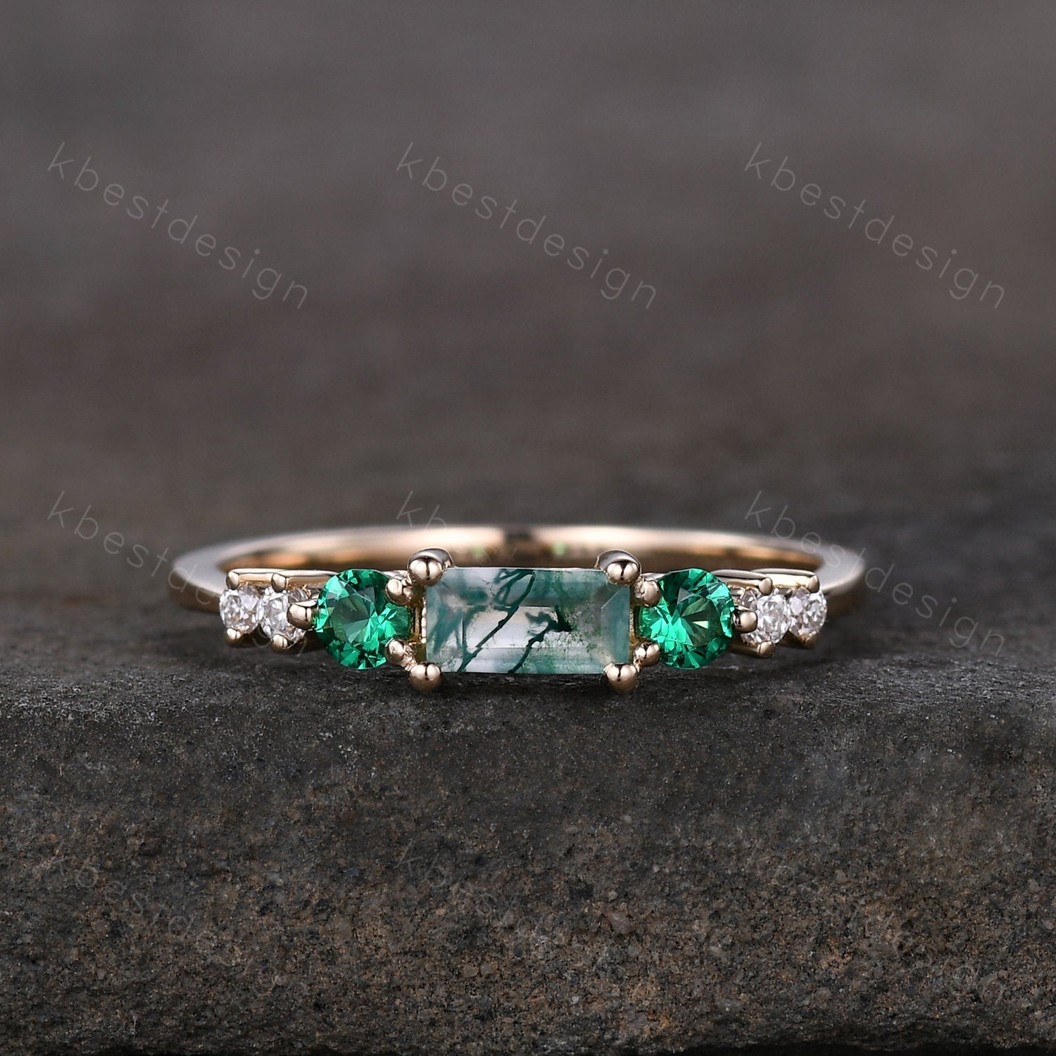 Stone size: 2.5x5mm baguette cut moss agate + Emerald + Moissanite