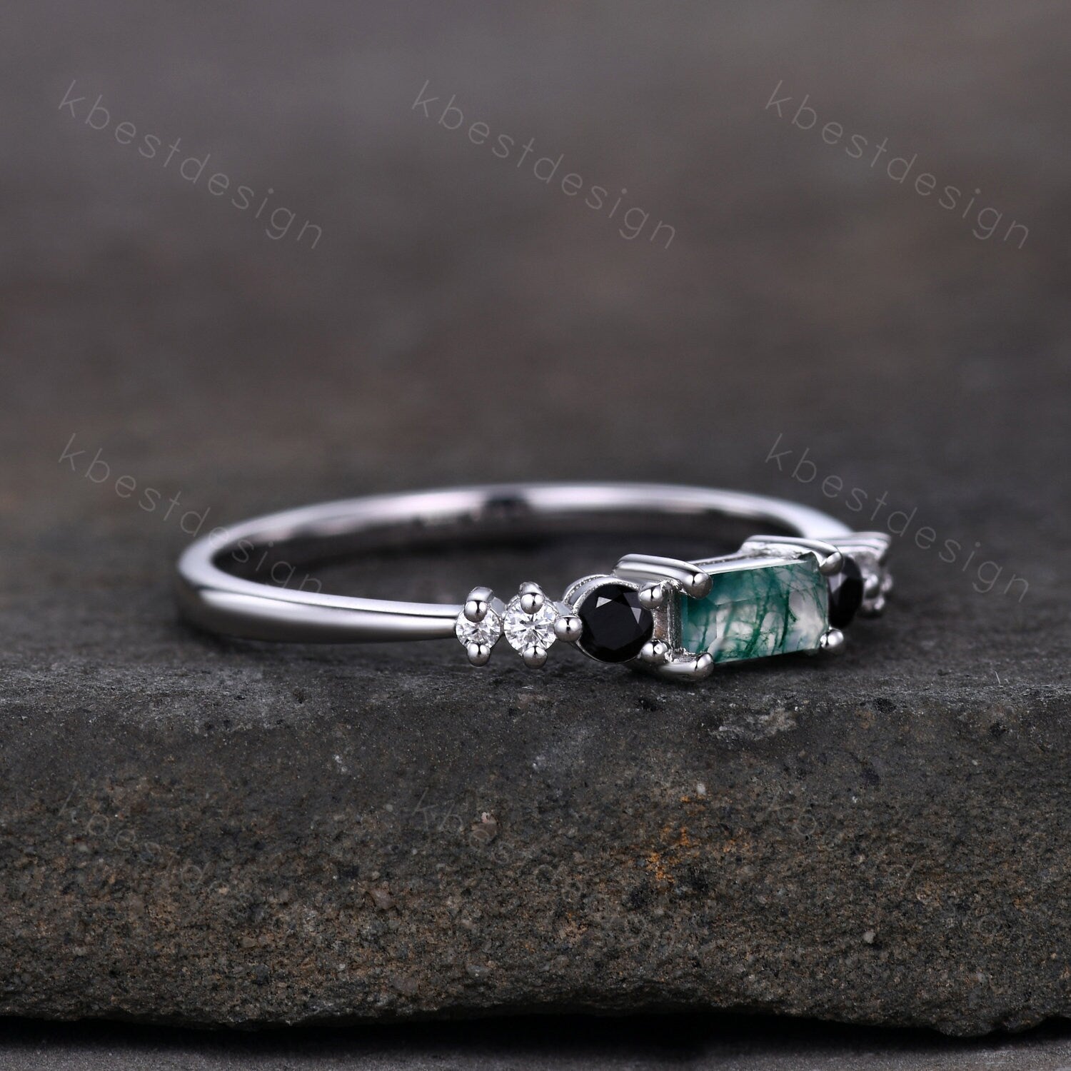 Baguette cut Moss Agate Wedding Band Unique Sterling Silver Band Antique Black Spinel Ring Minimalist Bridal Matching Stackable band