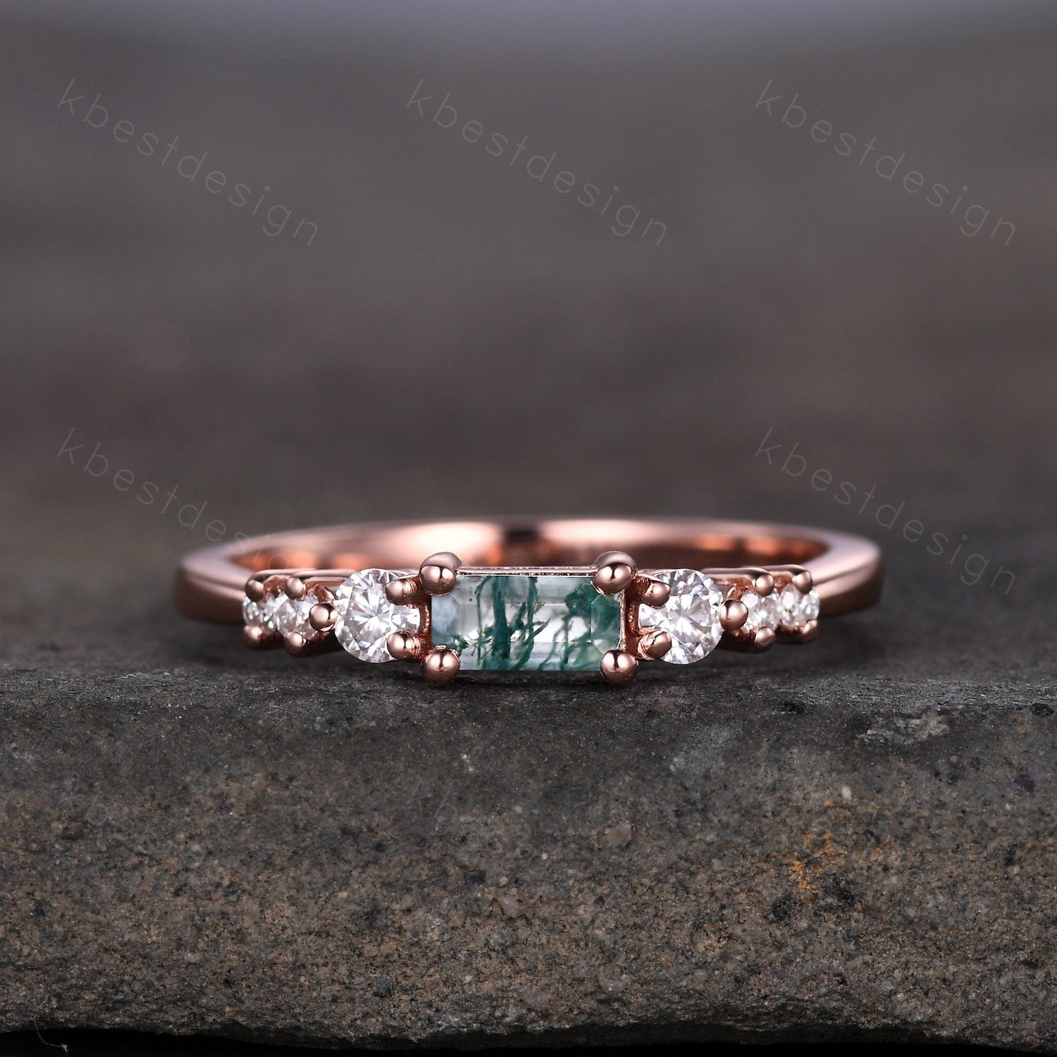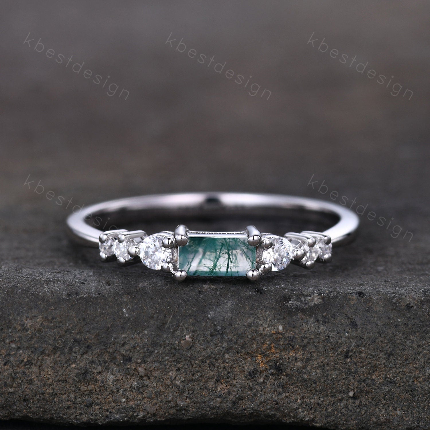 Baguette cut Moss Agate Wedding Band Unique Sterling Silver Wedding Band Antique Moissanite Ring Minimalist Bridal Matching Stackable band