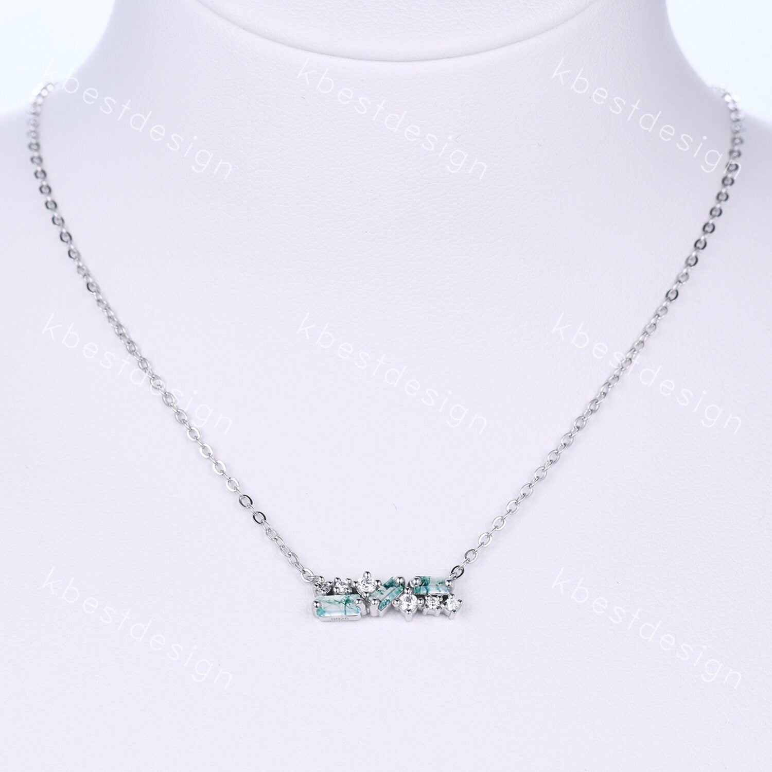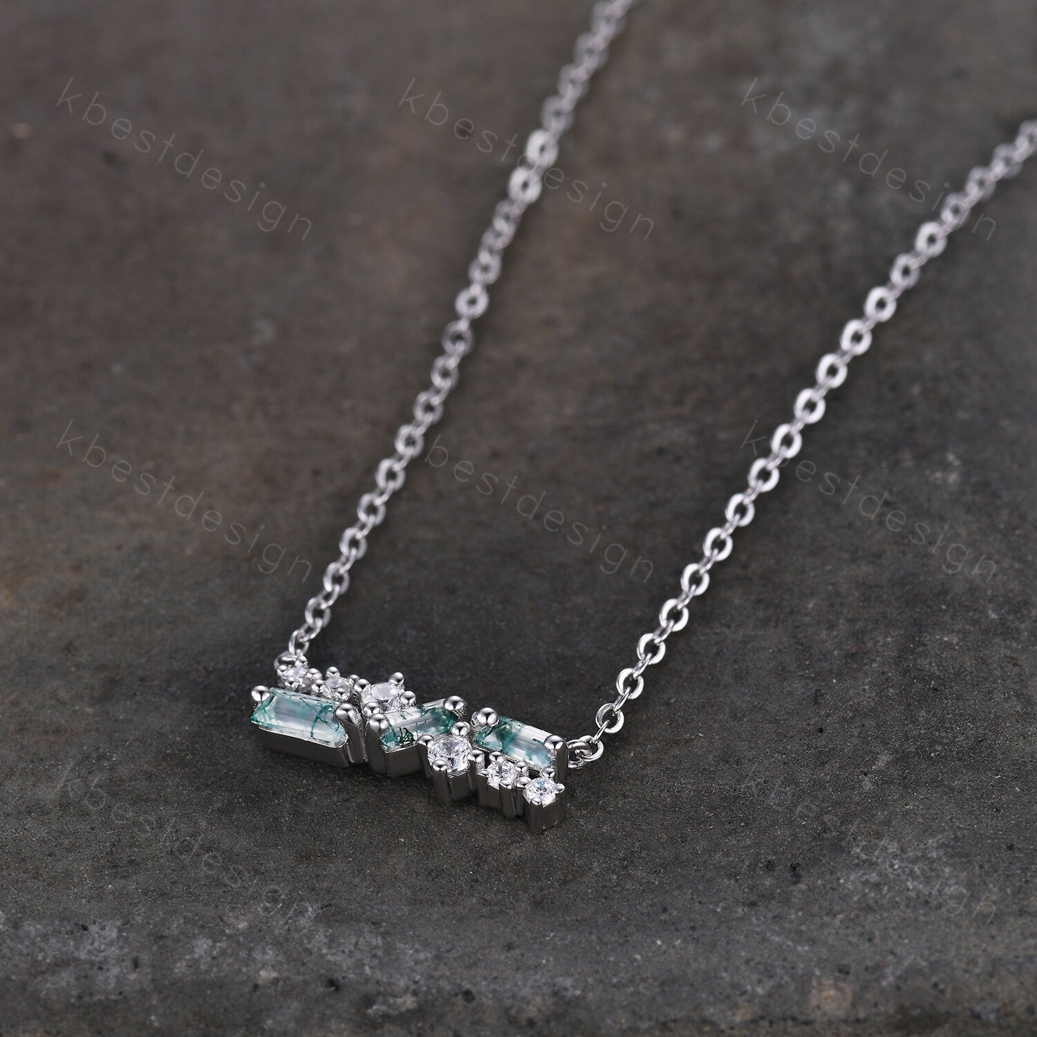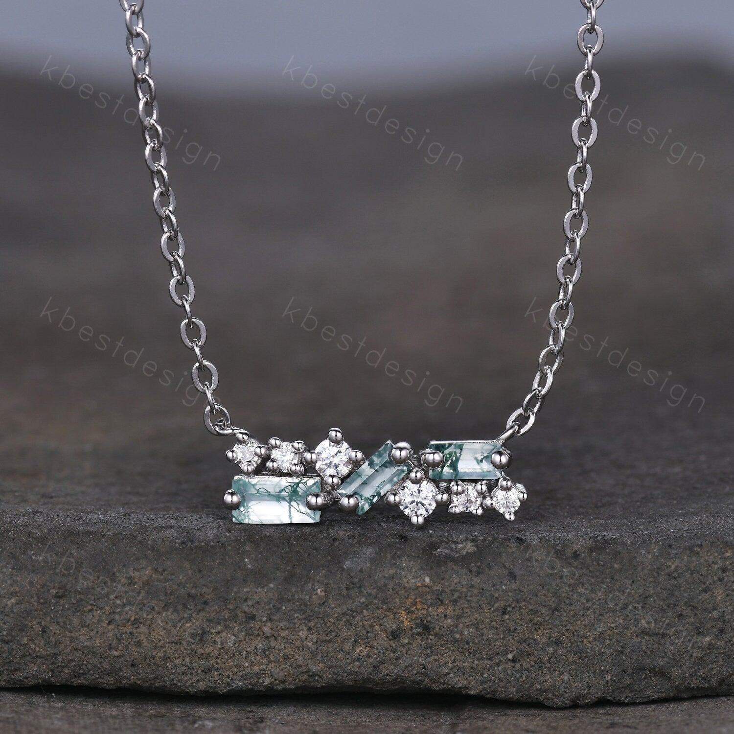This beautiful Cluster Moss Agate Necklace features 3 baguette cut natural green Moss Agate stonea, side stones are Moissanite/Simulated Diamonds. For those who are looking for agate jewelry which is handcrafted in details, this unique agate necklace would be a perfect choice for you. Whether it be a Birthday gift for her, an anniversary gift her, or a celebration of yourself, this agate jewelry is the perfect gift from the heart.
