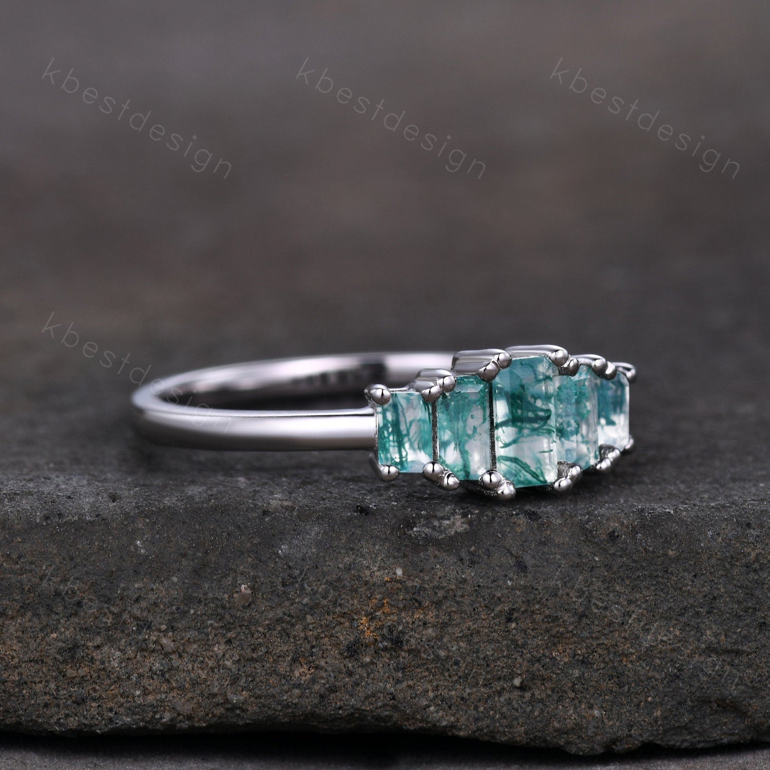Baguette Moss Agate Cluster Wedding Band Vintage Sterling Silver Wedding Band Antique 5 Stone Unique Women Bridal Promise Ring