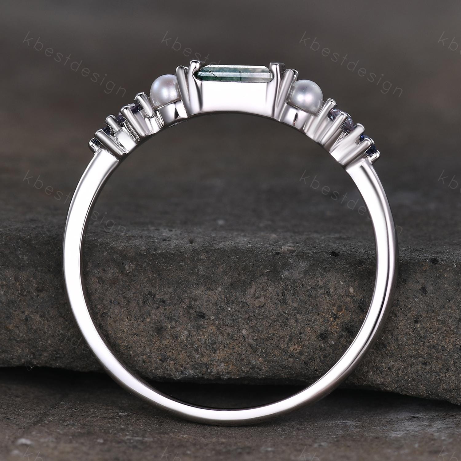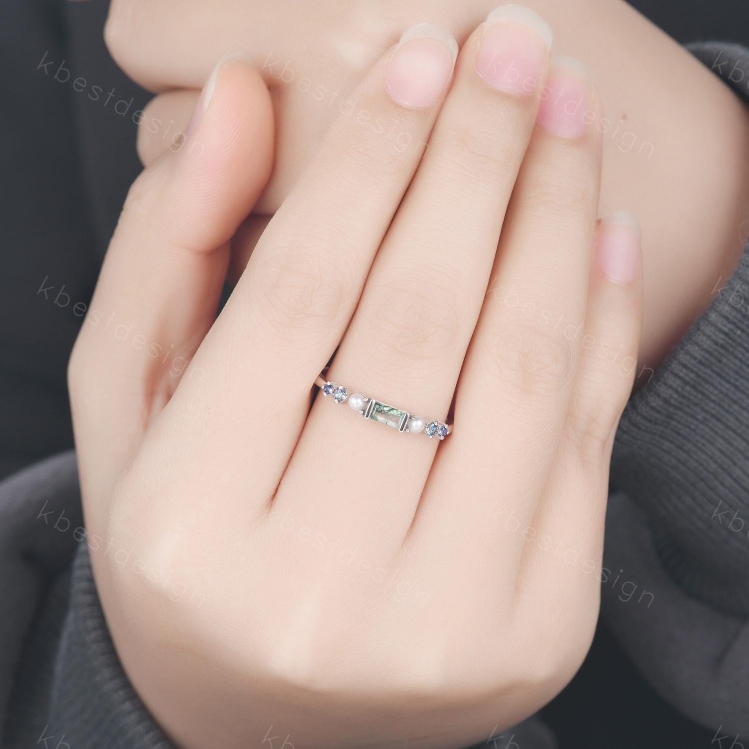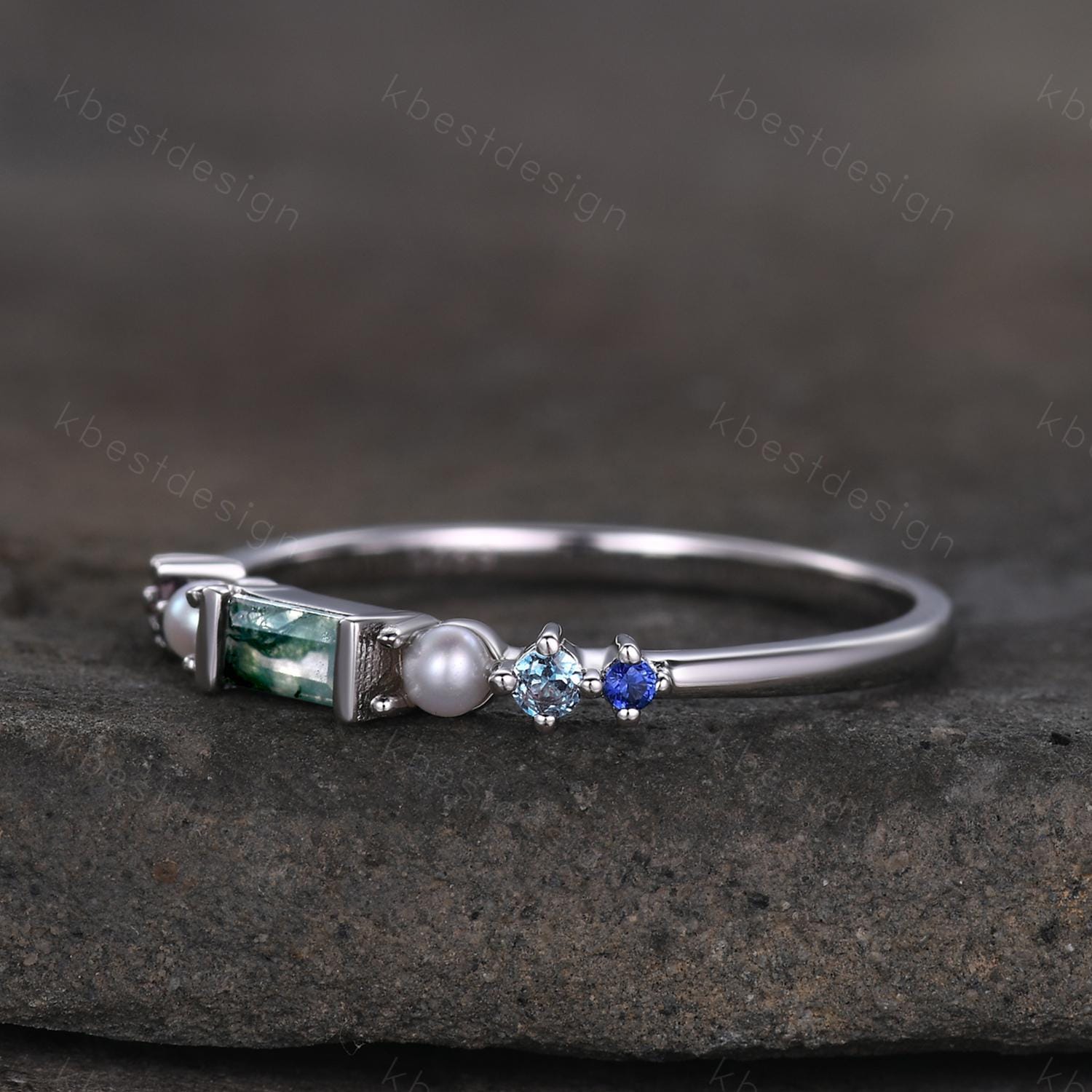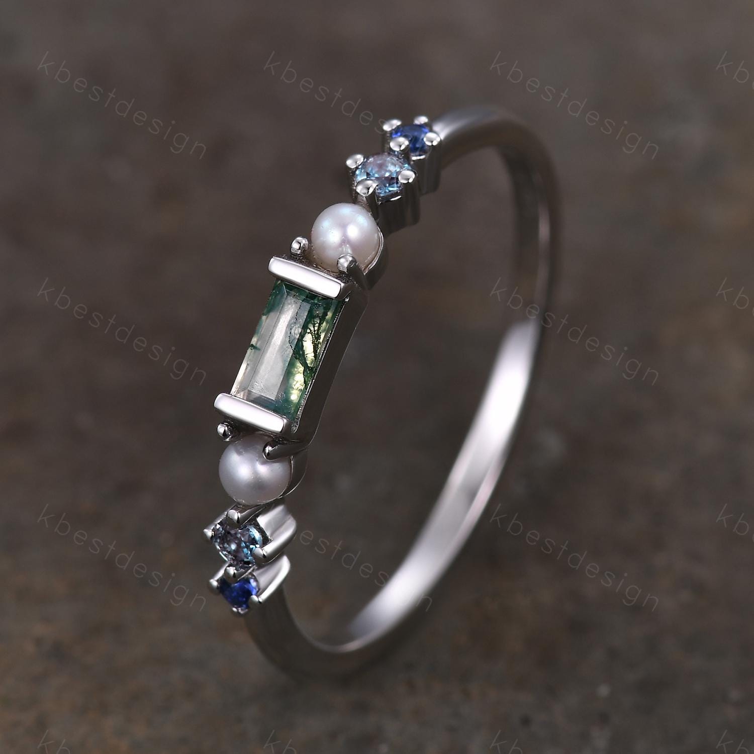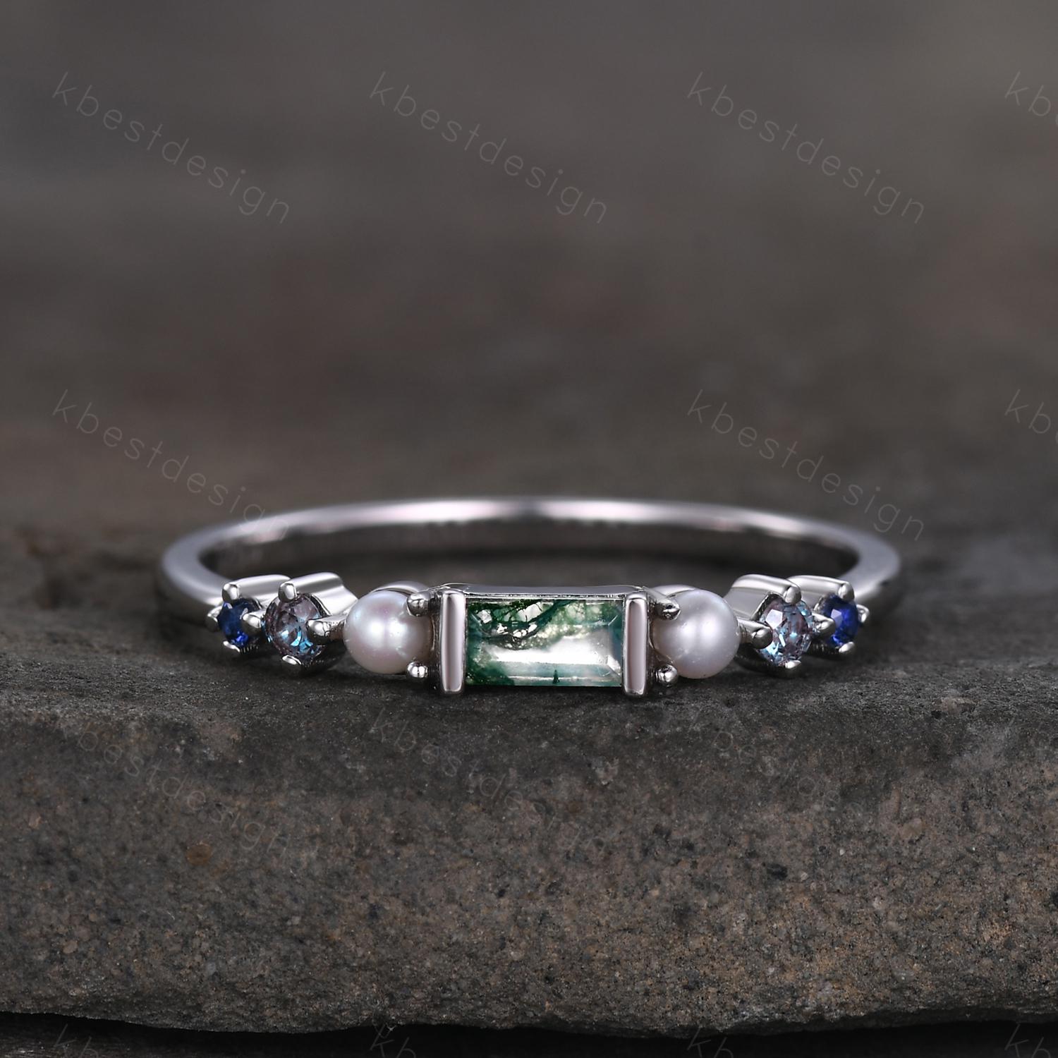 This is a Baguette Moss Agate Ring,Alexandrite and Pearl Wedding Band,Unique Multi Gemstone Ring,Birthstone Jewelry,Gift For Mom,Personalized Gift