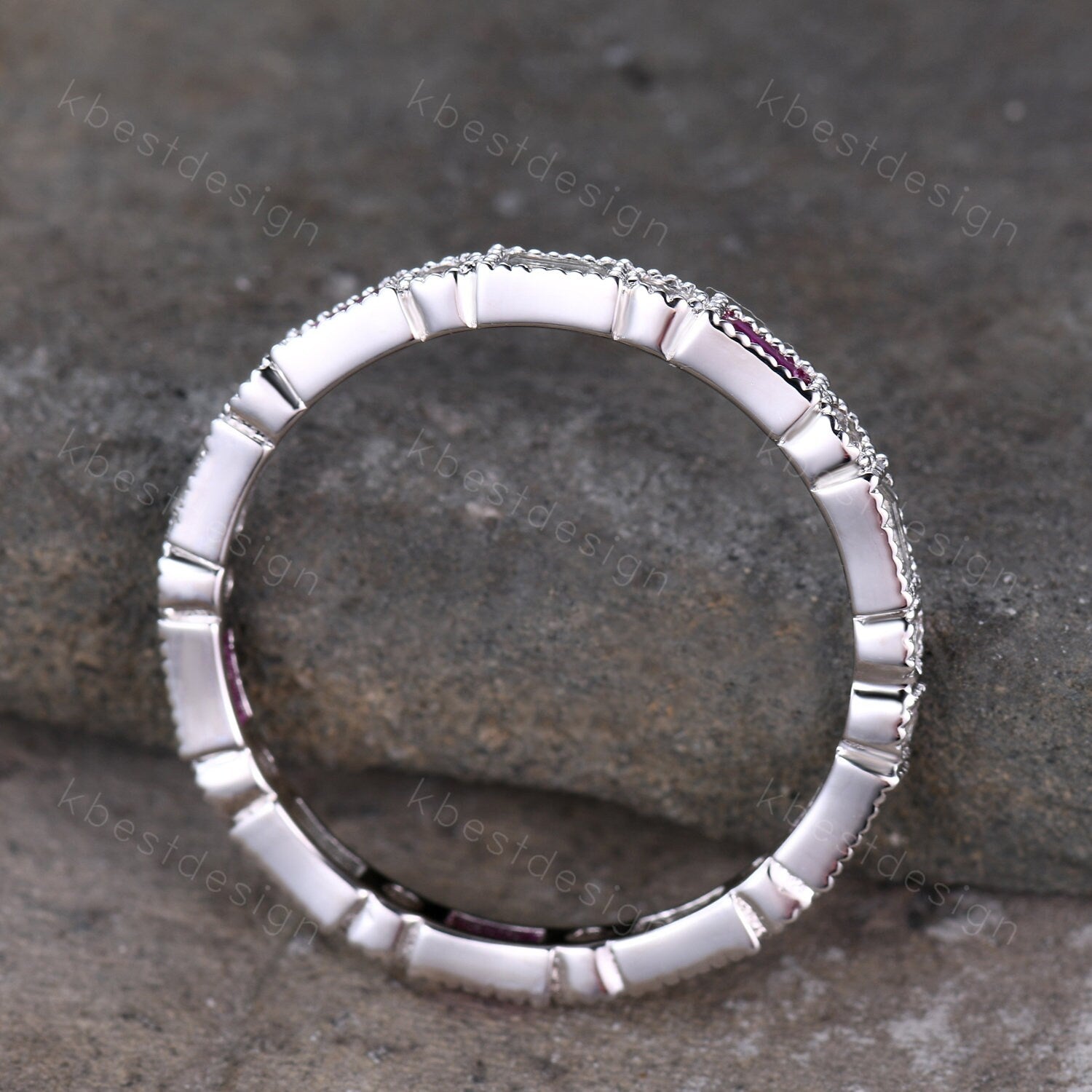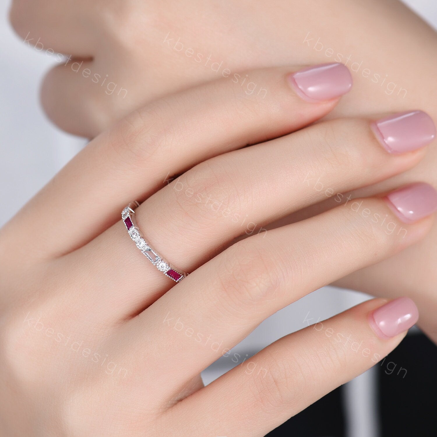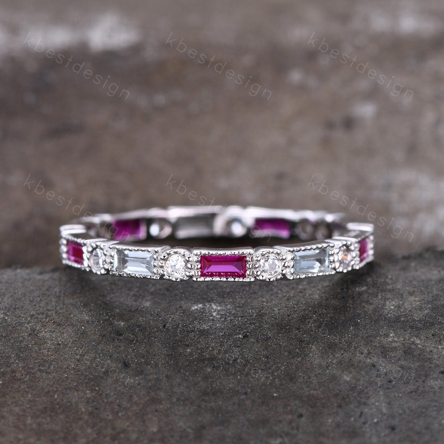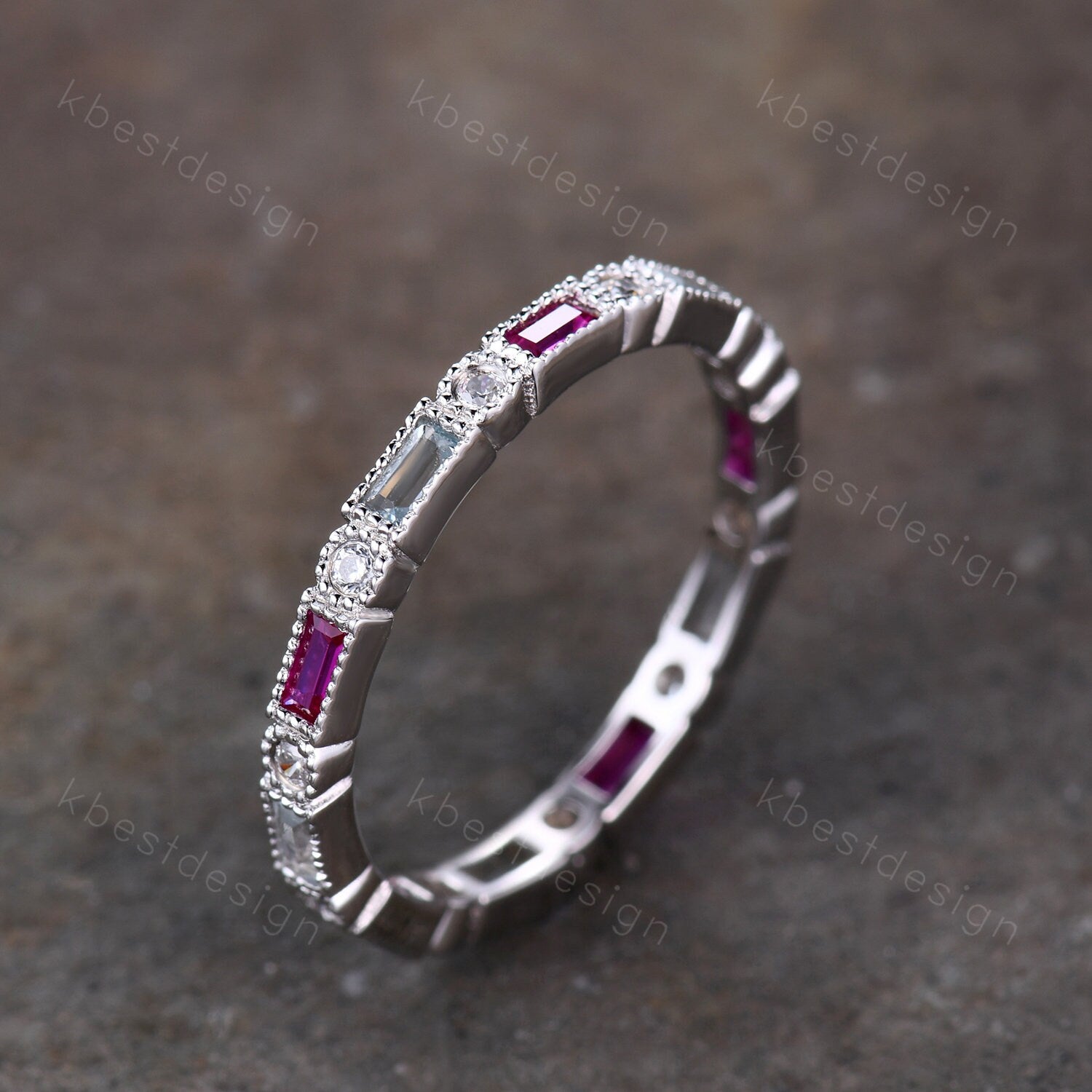 Baguette Ruby Eternity Band, Ruby and Aquamarine Wedding Band, Art Deco Stacking Band, July Birthstone Ring, Anniversary Gift, White Gold