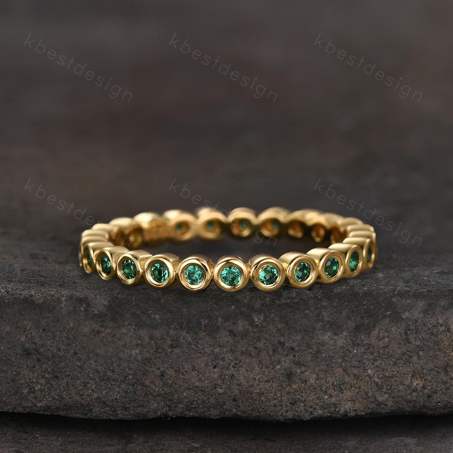 Bezel set Emerald wedding band yellow gold full eternity wedding band unique stacking matching band 1.5mm emerald ring Anniversary band