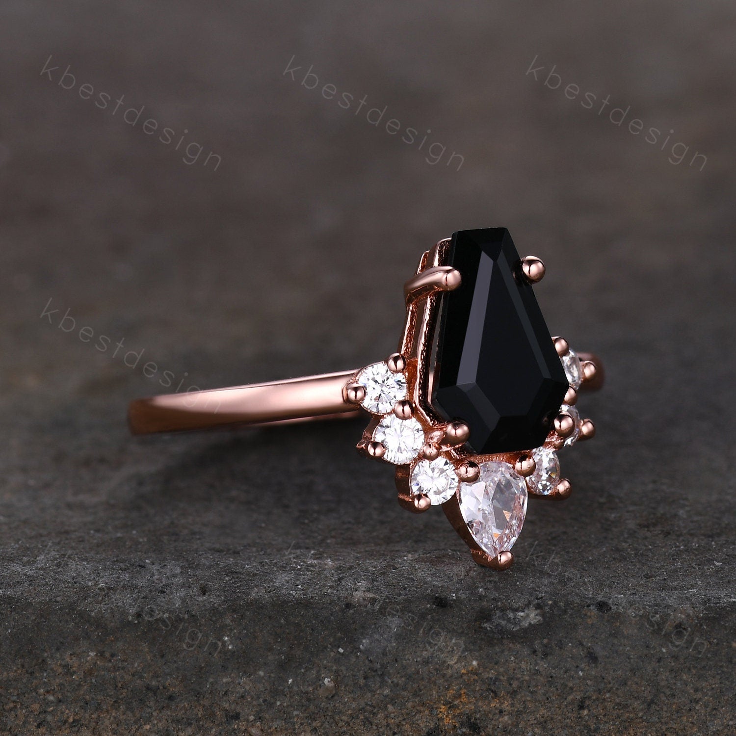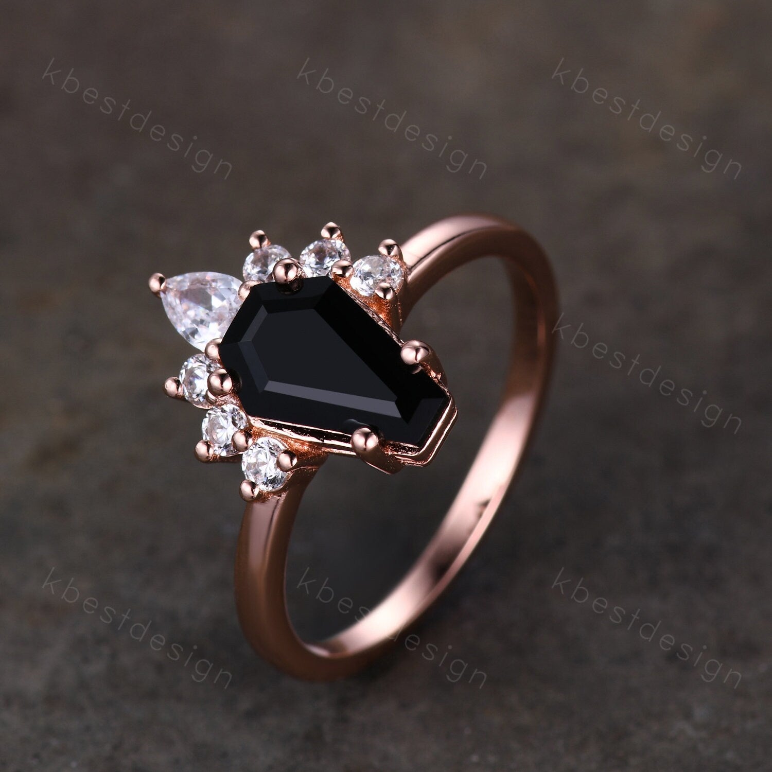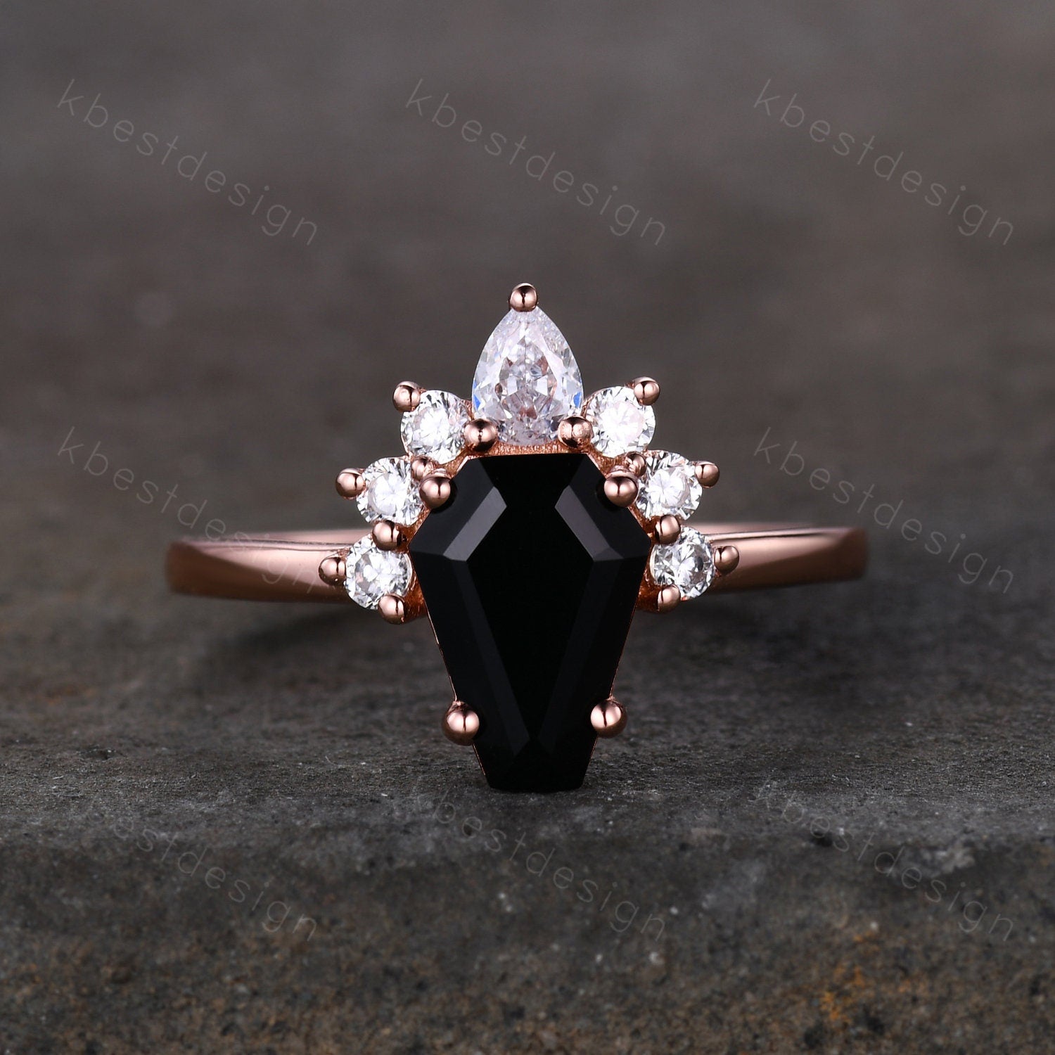Black Onyx Engagement Ring Rose Gold Pear Moissanite ring Vintage coffin shaped ring Solitaire engagement ring Promise anniversary ring