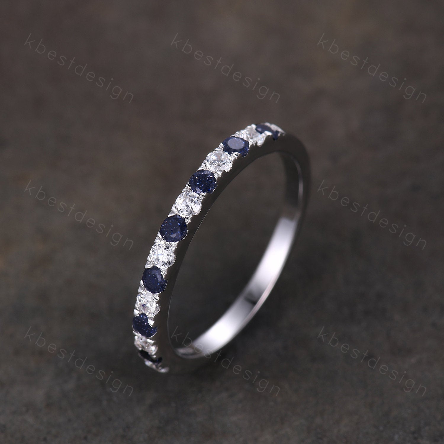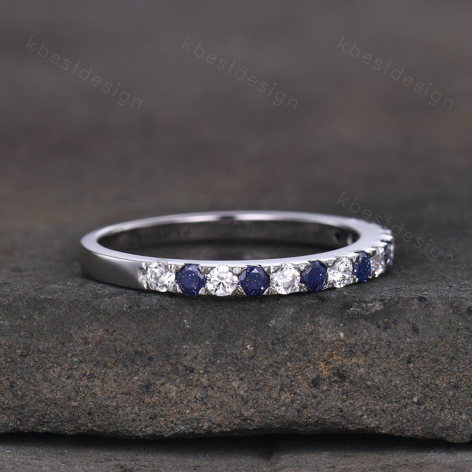 Blue Sandstone Wedding Band 2mm Half Eternity Band Moissanite Stacking Wedding Ring Pave Band Anniversary Ring Sterling Silver Ring