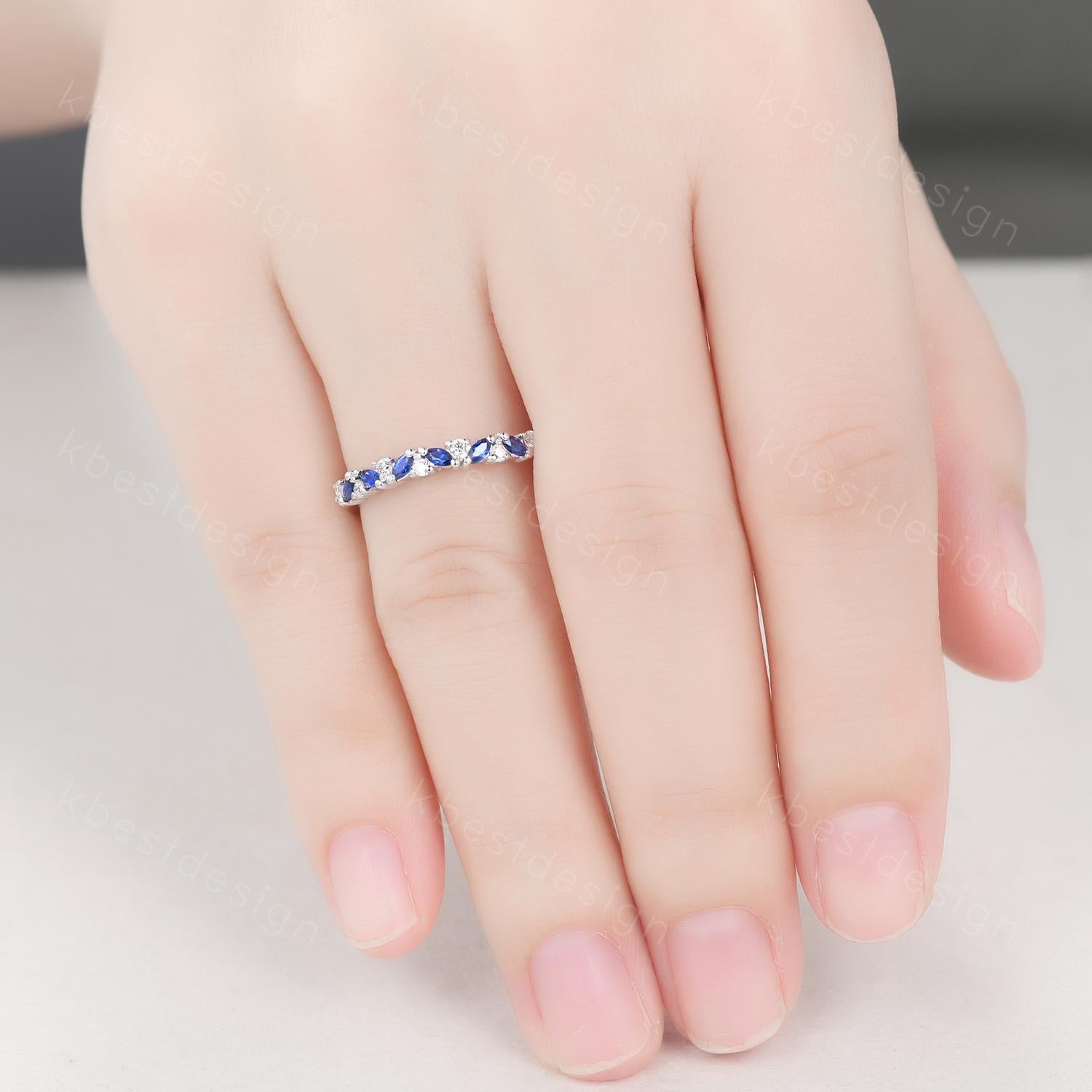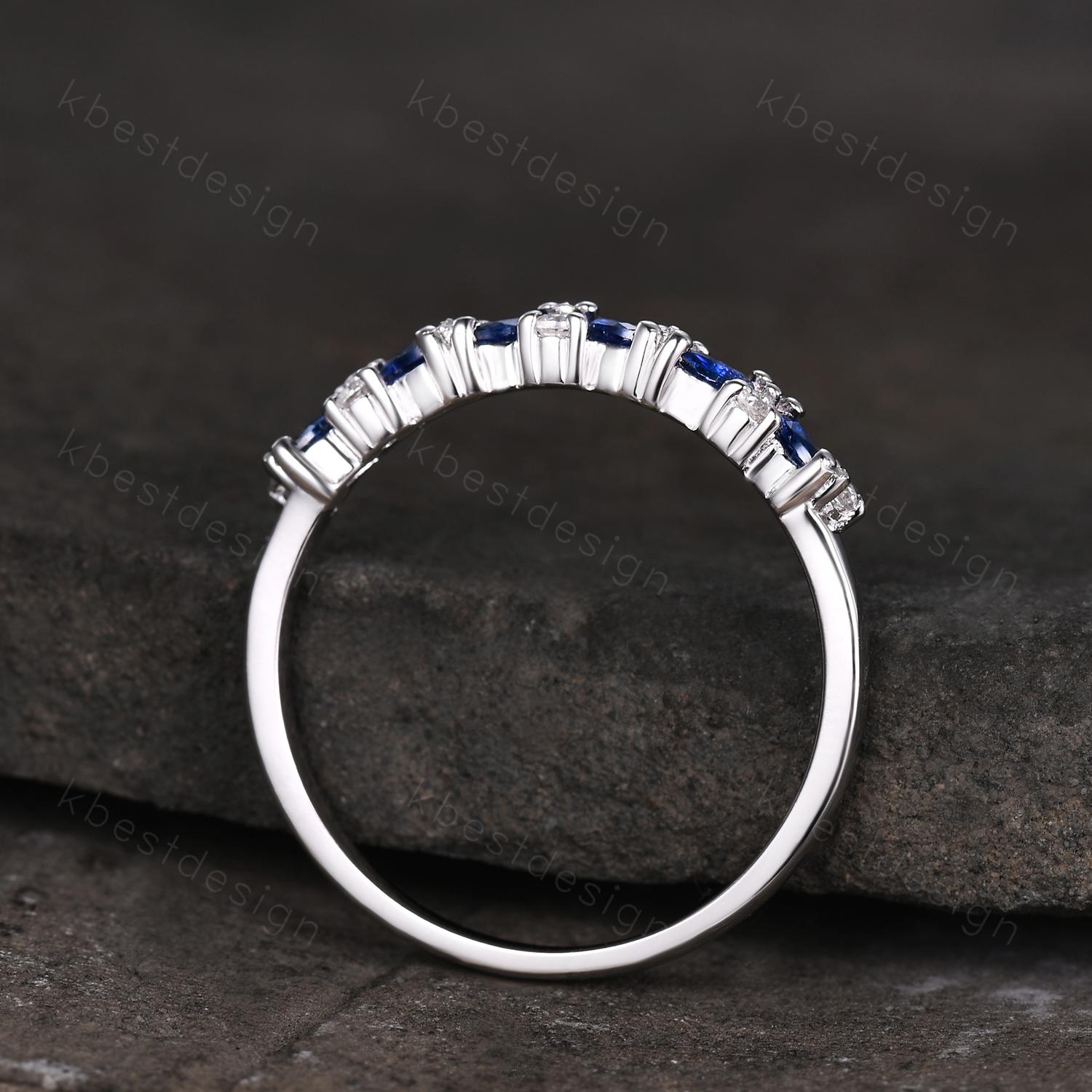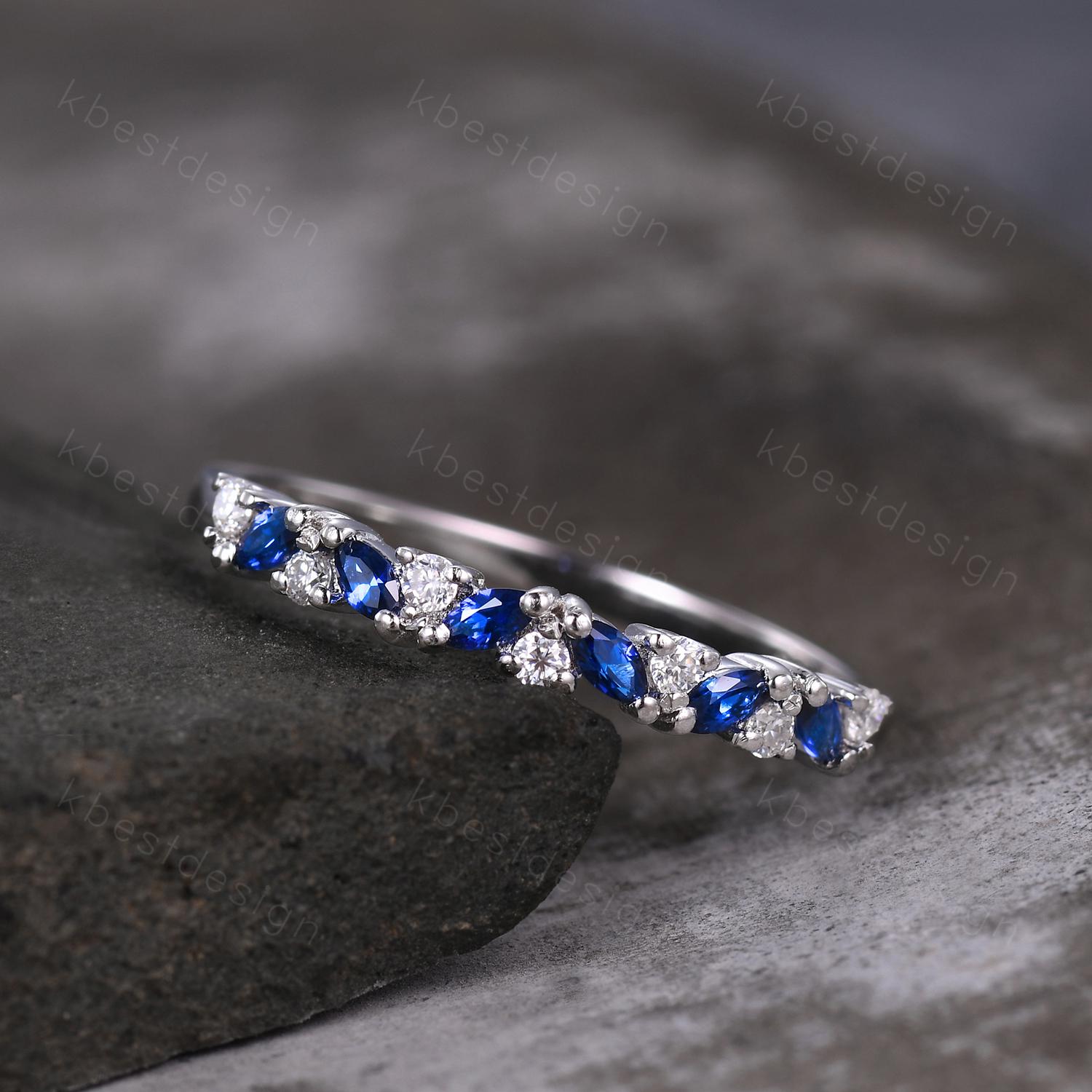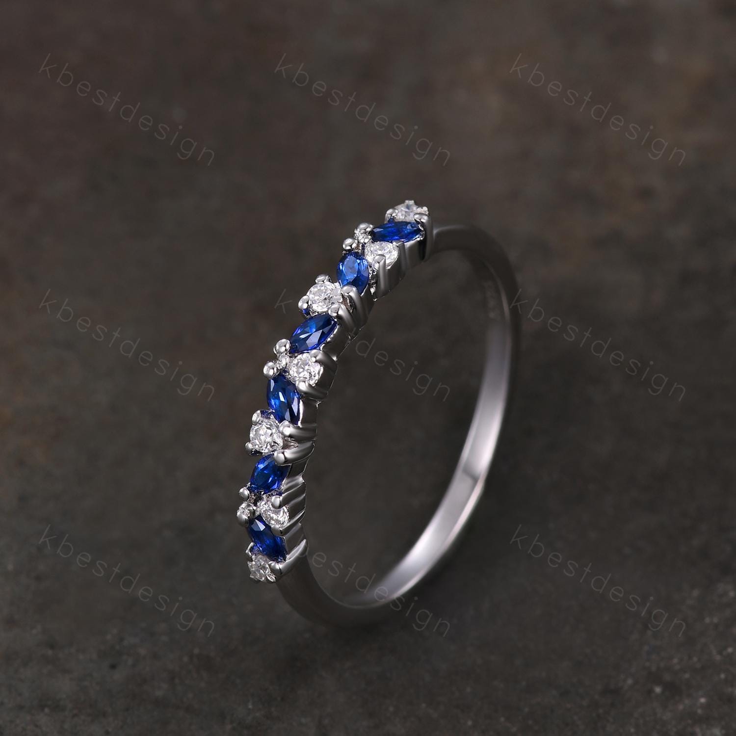 Blue Sapphire cluster wedding band Unique marquise cut wedding band Vintage Moissanite ring Sterling silver ring Anniversary gift for Her